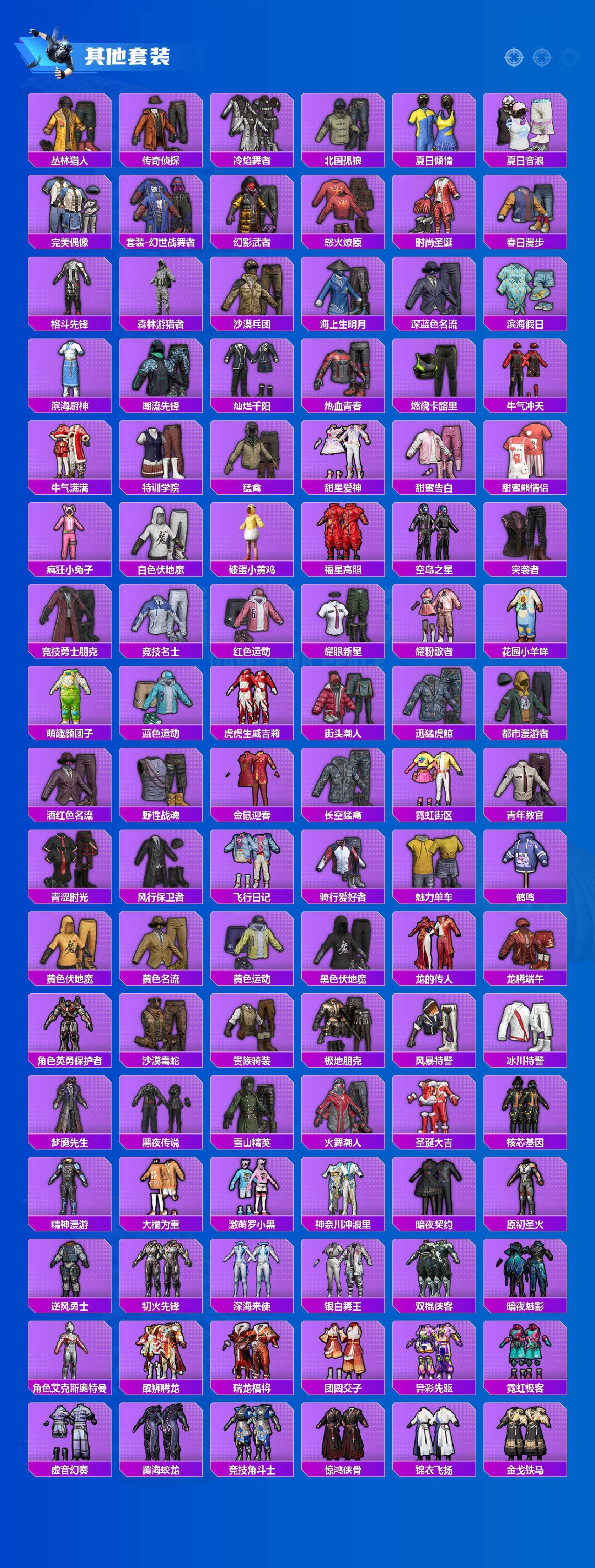 【粉色套装】:粉装-烈焰拳霸,粉装-炙焰赤龙,粉装-蜜桃特工,粉装-暗夜玫瑰,粉装-齐天大圣,粉装-沙场疾风,粉装-吟月归客,角色-复仇流浪者,角色-樱桃泡泡