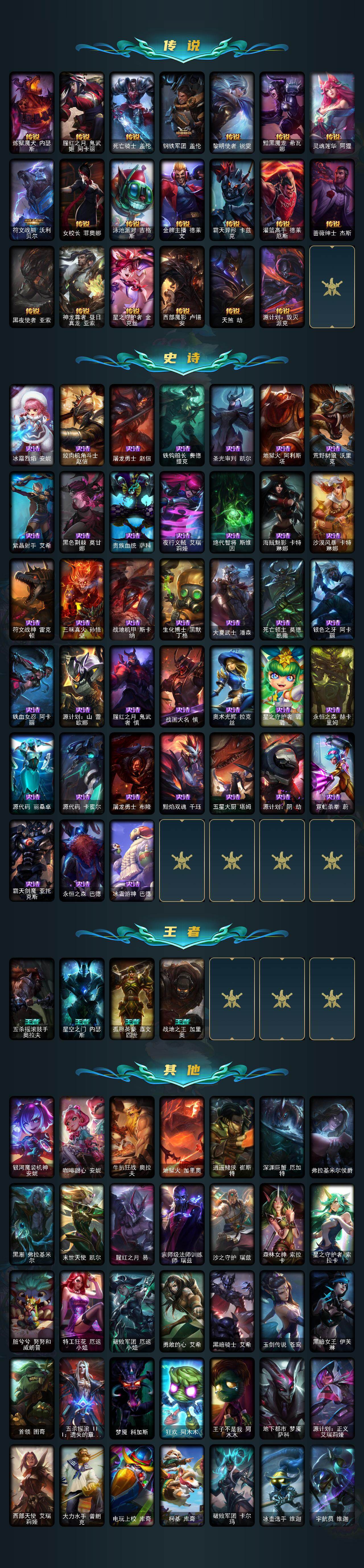 169英雄/262皮肤/11神话/34限定/9臻彩/96炫彩/39传说/38史诗/未定级/十周年纪念安妮