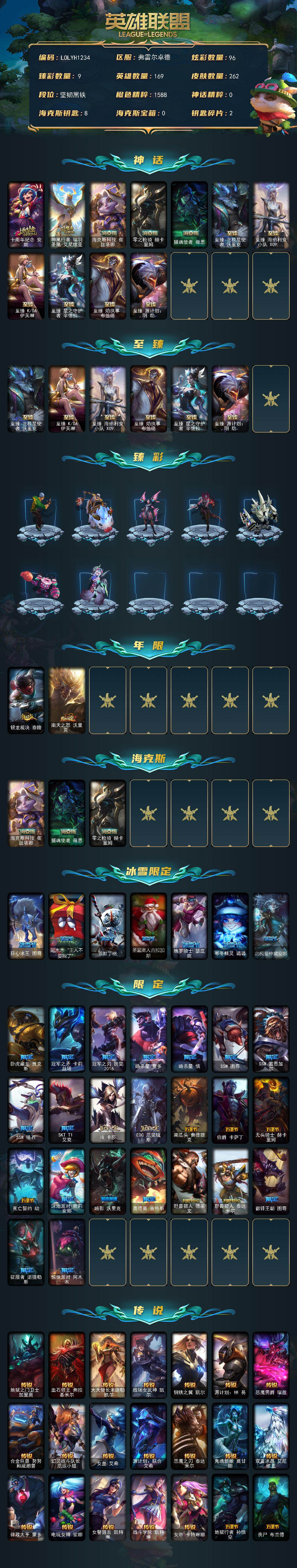 【LOLYH1234】169英雄/262皮肤/11神话/34限定/9臻彩/96炫彩/39传说/38史诗/未定级/十周年纪念安妮/神凰行者瑞羽圣凰艾尼维亚/海克斯科技崔丝塔娜/零之枪骑赫卡里姆/摄魂使者薇恩/至臻北极星使者沃里克/至臻海珀利安小队X09星环灵风迦娜/至臻KDA伊芙琳/至臻星之守护者辛德拉/至臻焰执事布兰德/至臻源计划阴劫/龙的传人李青见龙在田/无畏骑士瑟庄妮赤子初心/弹幕天使卡莎炽天使勇敢/西部魔影卢锡安贝利尔之怠/霸天巨兽雪崩墨菲特/可爱可爱粉红红布里茨/魔女阿卡丽虚荣/净雪之月