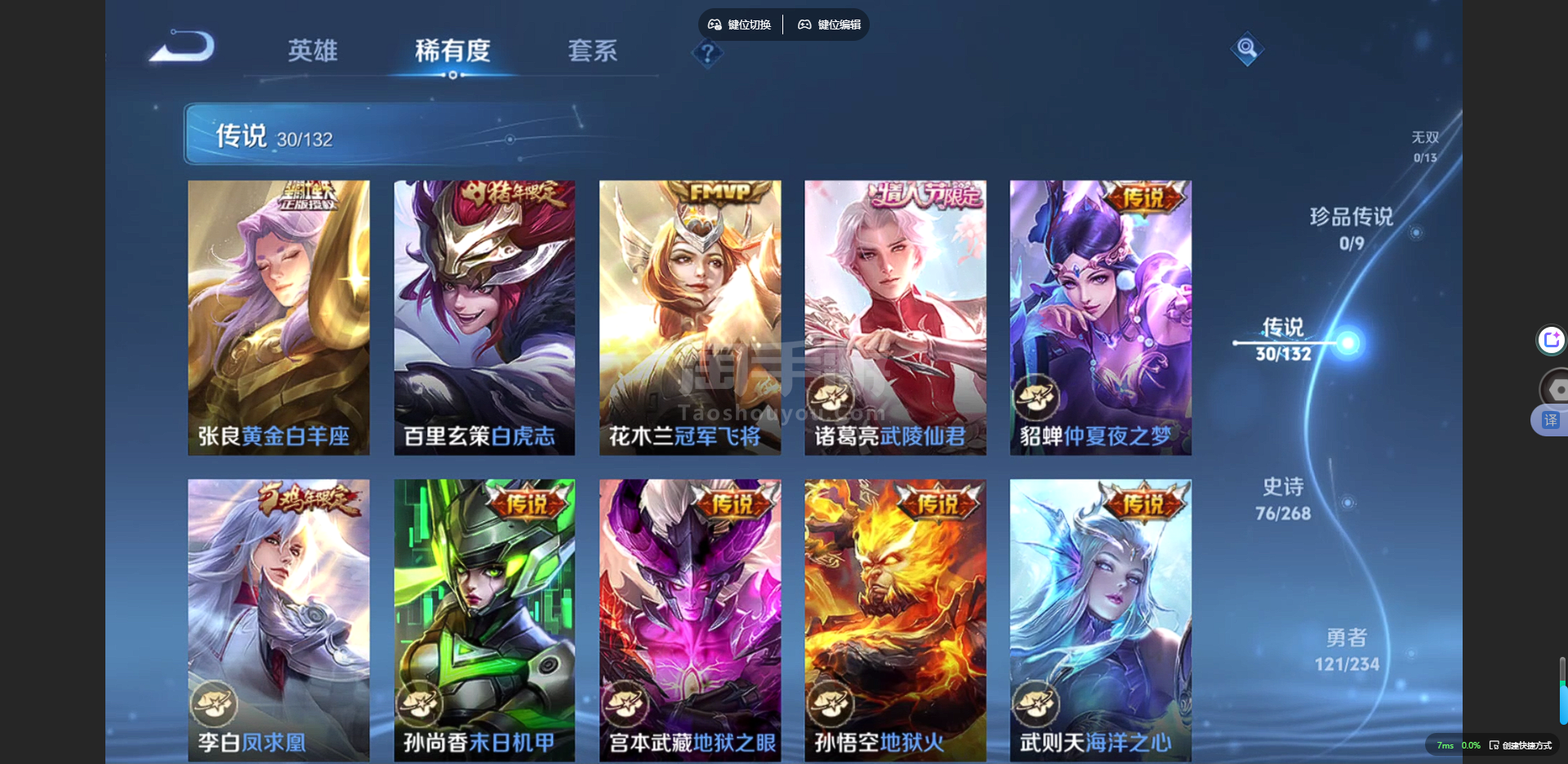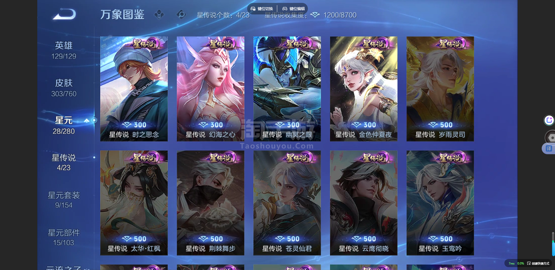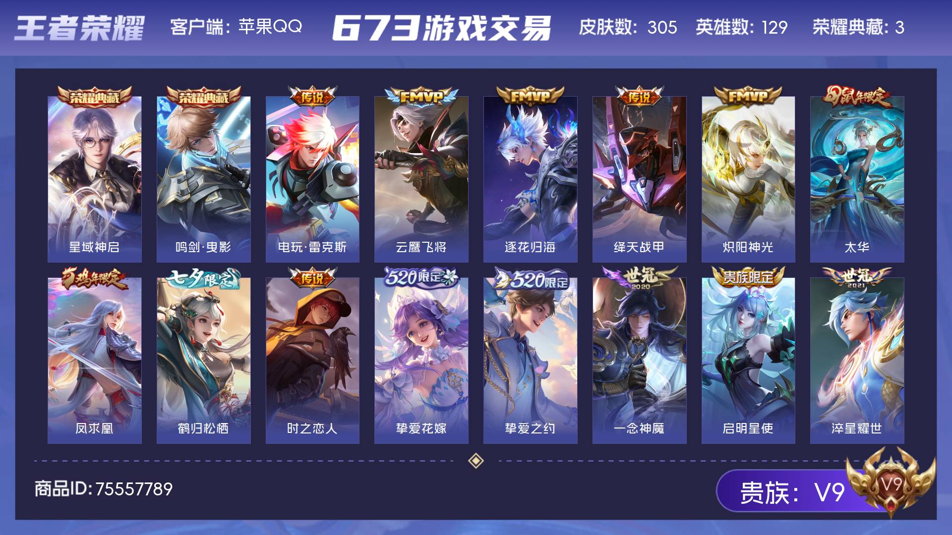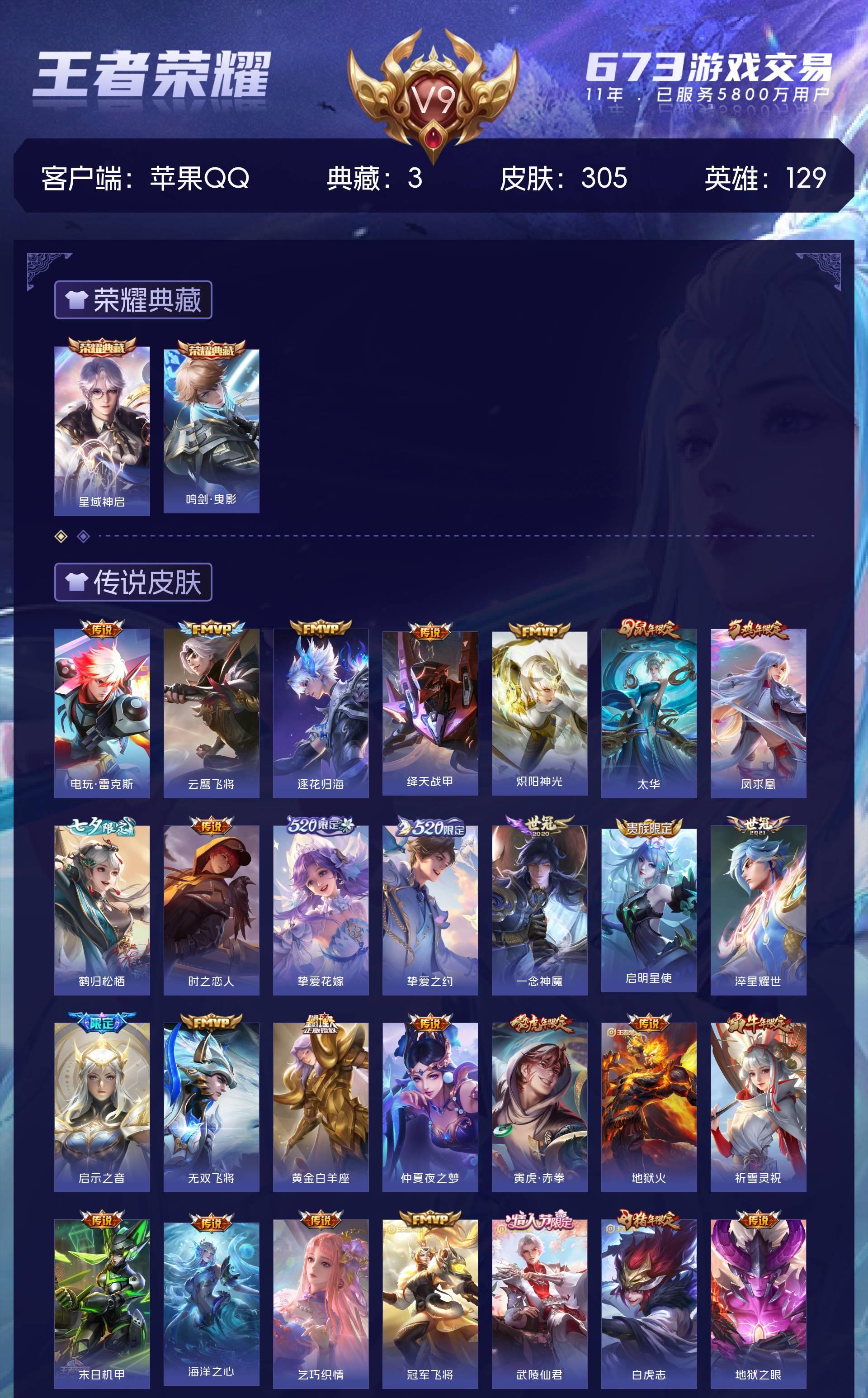 苹果QQ V9 皮肤305 英雄129 最强王者 荣耀典藏3 传说30 星传说3 太华/白虎志/白虎志/凤求凰至尊宝 夺宝幸运分319 马上出第4颗水晶