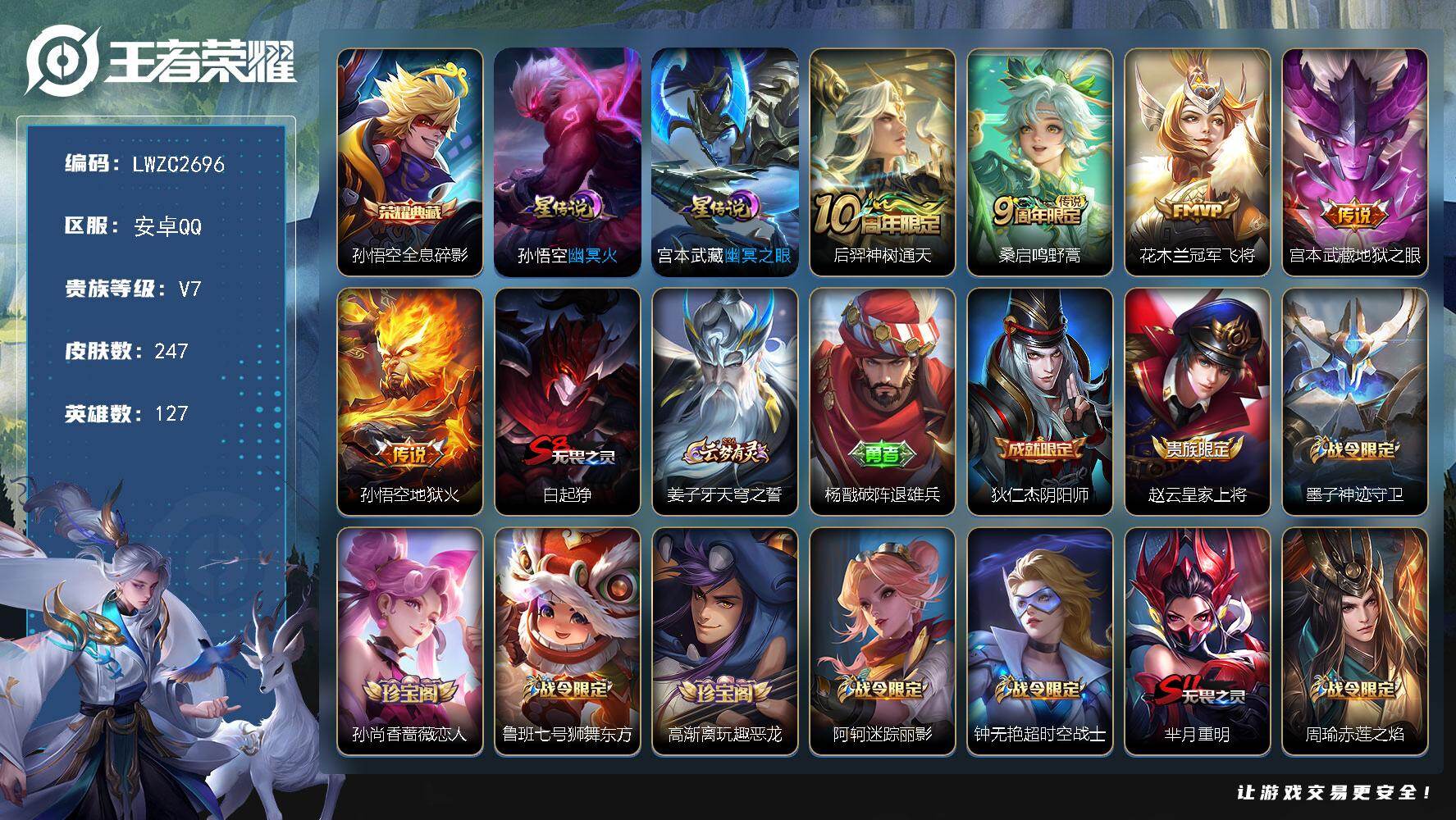 【特价急出/详情看图】安卓Q-V7-永恒钻石I段位-127英雄-247皮肤-1典藏皮肤-2星元-5传说-67史诗【英雄全皮】:钟馗全皮【荣耀典藏】:孙悟空全息碎影【传说皮肤】:后羿神树通天,桑启鸣野蒿,花木兰冠军飞将,宫本武藏地狱之眼,孙悟空地狱火【限定皮肤】:白起狰,姜子牙天穹之誓,杨戬破阵退雄兵,狄仁杰阴阳师,赵云皇家上将,墨子神迹守卫,孙尚香蔷薇恋人,鲁班七号狮舞东方,高渐离玩趣恶龙,阿轲迷踪丽影,钟无艳超时空战士,芈月重明,周瑜赤莲之焰,元歌云间偶戏,夏侯惇朔风刀,甄姬游园惊梦,甄姬落雪