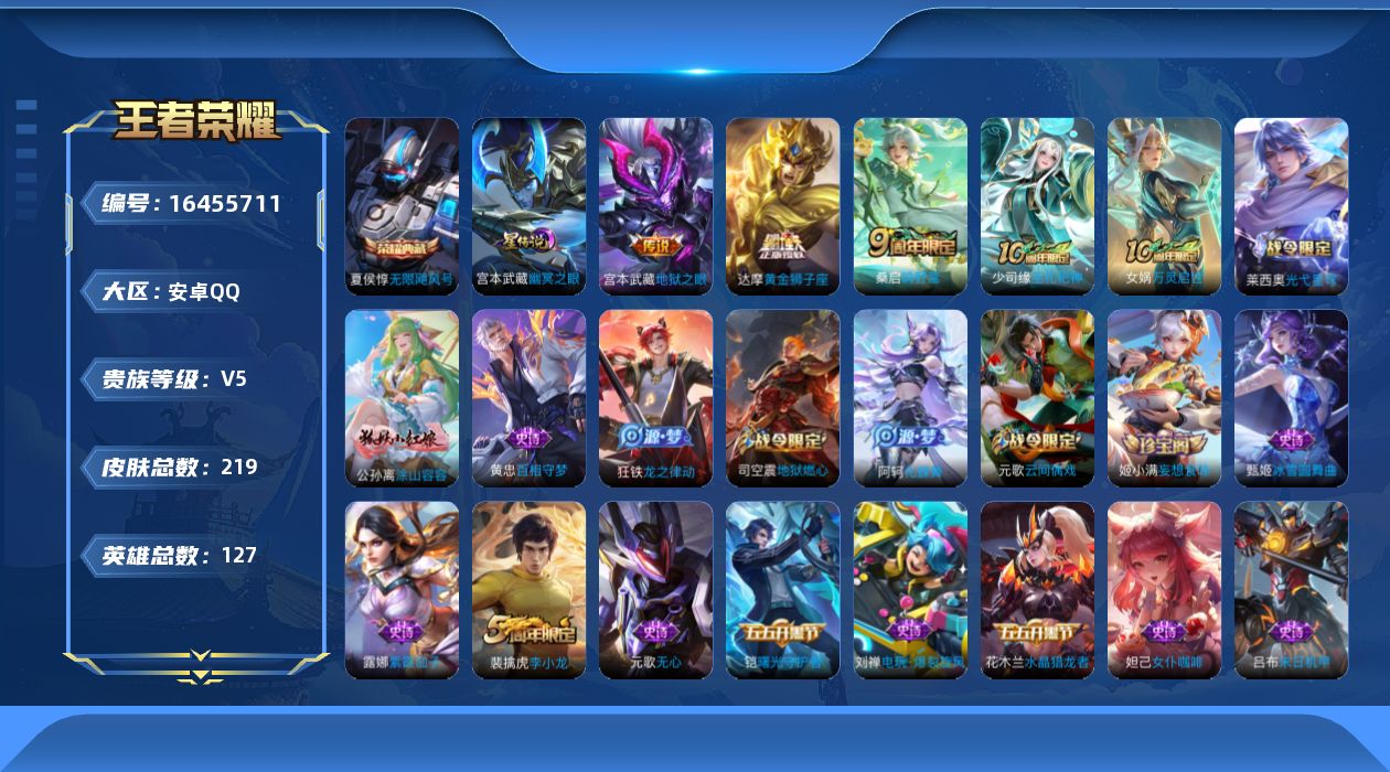 可二次【特价出售/店主推荐/1市标】:安卓Q-V5-最强王者段位-127英雄-219皮肤-1典藏皮肤-1星元-4传说-54史诗【英雄全皮】:达摩全皮,孙权全皮,空空儿全皮【荣耀典藏】:夏侯惇无限飓风号【传说皮肤】:后羿神树通天,桑启鸣野蒿,达摩黄金狮子座,宫本武藏地狱之眼【限定皮肤】:姜子牙天穹之誓,杨戬破阵退雄兵,狄仁杰阴阳师,赵云皇家上将,墨子神迹守卫,嬴政优雅恋人,高渐离死亡摇滚,元歌云间偶戏,元歌无心,狄仁杰万华元夜,达摩星际陆战队,达摩沙漠行僧,项羽海滩派对,老夫子醍醐杖,老夫子航海奇