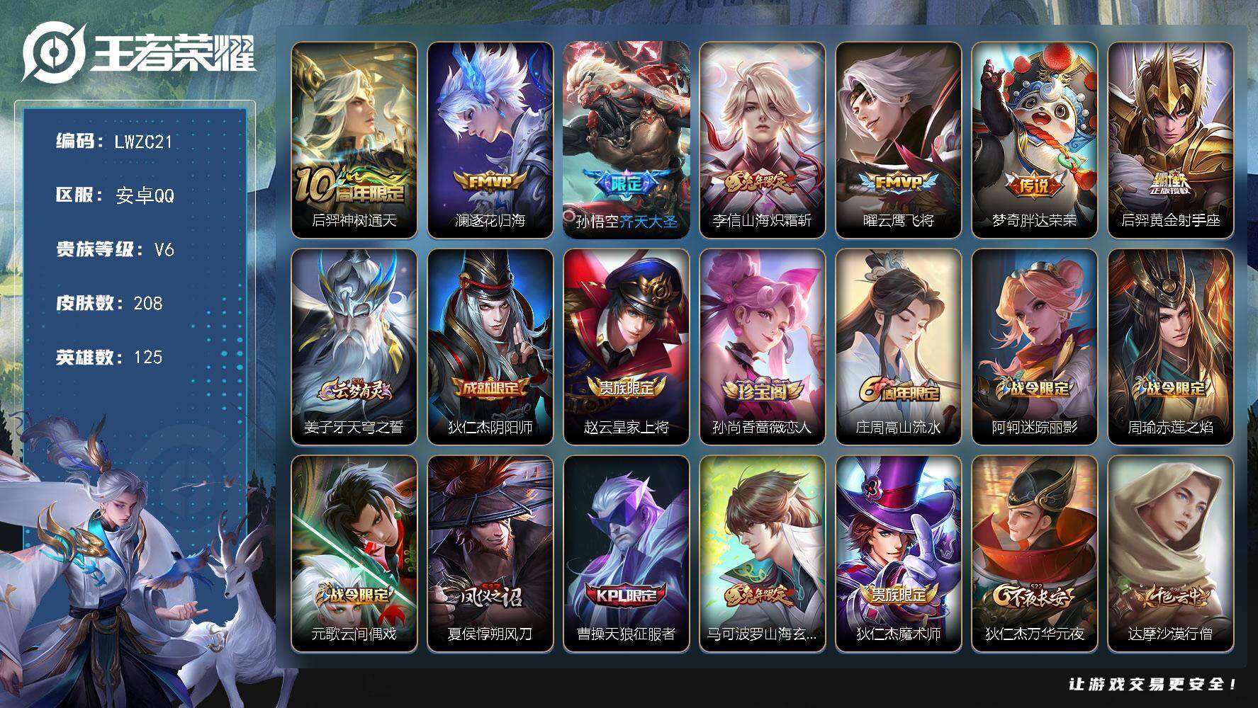 【特价急出/详情看图】安卓Q-V6-最强王者段位-125英雄-208皮肤-7传说-56史诗【英雄全皮】:影全皮【传说皮肤】:后羿神树通天,澜逐花归海,孙悟空齐天大圣,李信山海炽霜斩,曜云鹰飞将,梦奇胖达荣荣,后羿黄金射手座【限定皮肤】:姜子牙天穹之誓,狄仁杰阴阳师,赵云皇家上将,孙尚香蔷薇恋人,庄周高山流水,阿轲迷踪丽影,周瑜赤莲之焰,元歌云间偶戏,夏侯惇朔风刀,曹操天狼征服者,马可波罗山海玄木吟,狄仁杰魔术师,狄仁杰万华元夜,达摩沙漠行僧,项羽海滩派对,老夫子醍醐杖,关羽冰锋战神,程咬金演武夺