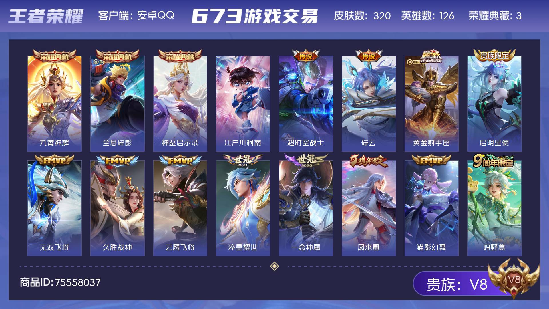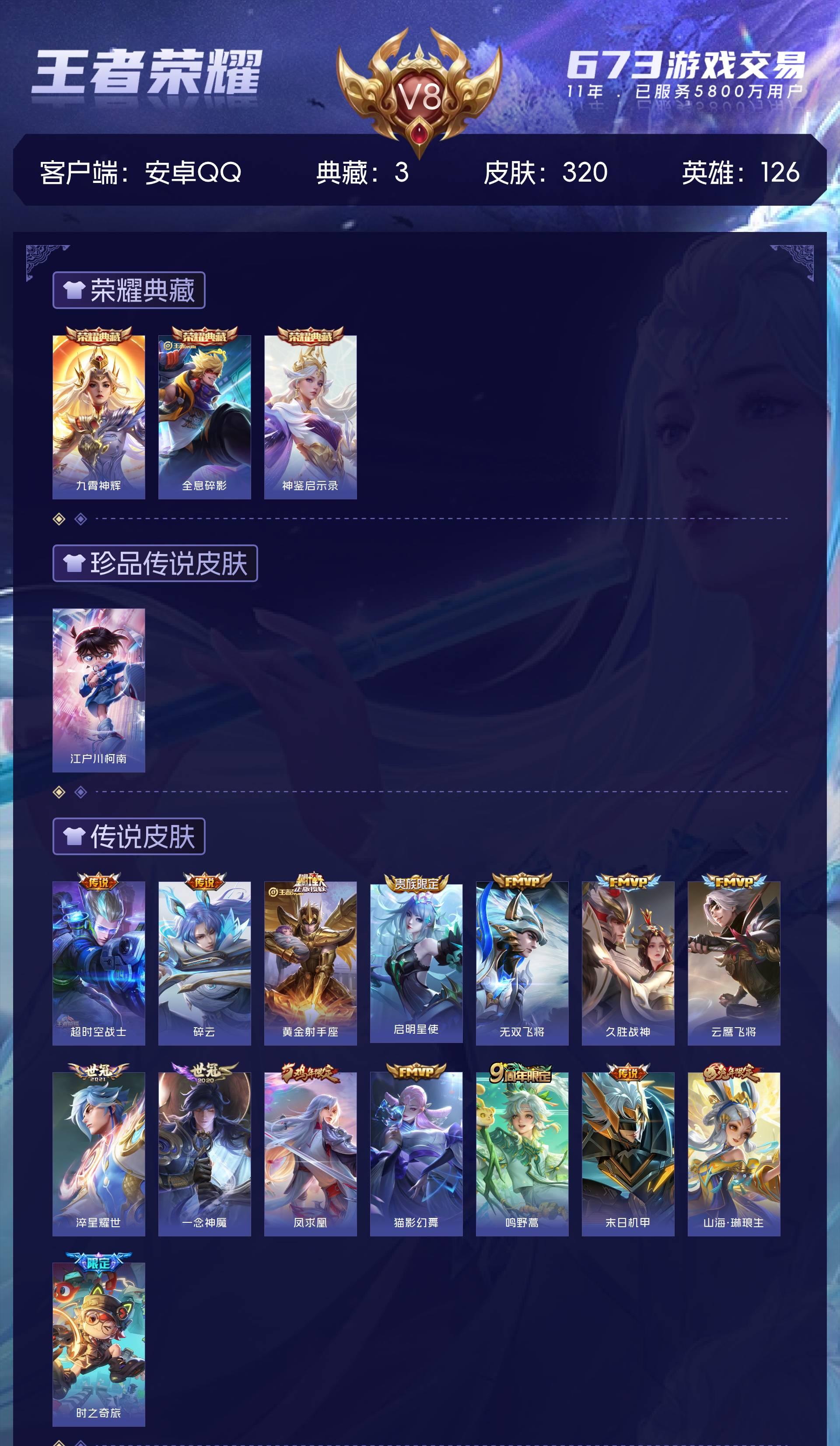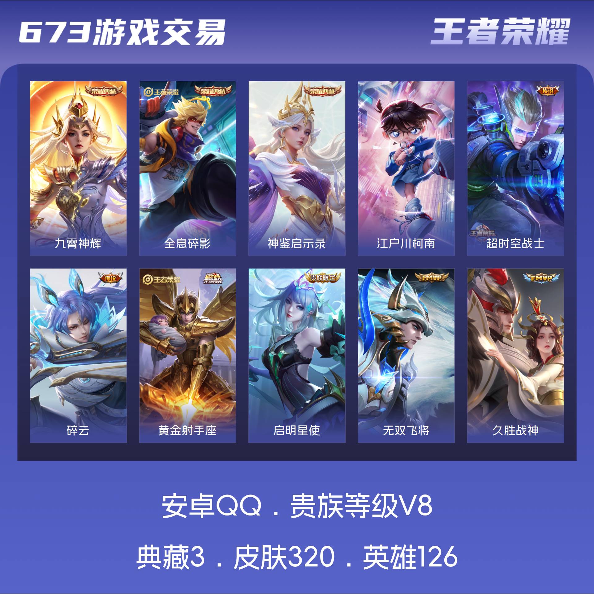 安卓QQ/尊贵铂金/320皮肤/126英雄/3典藏/0珍品无双/0无双/1珍品传说/15传说/91史