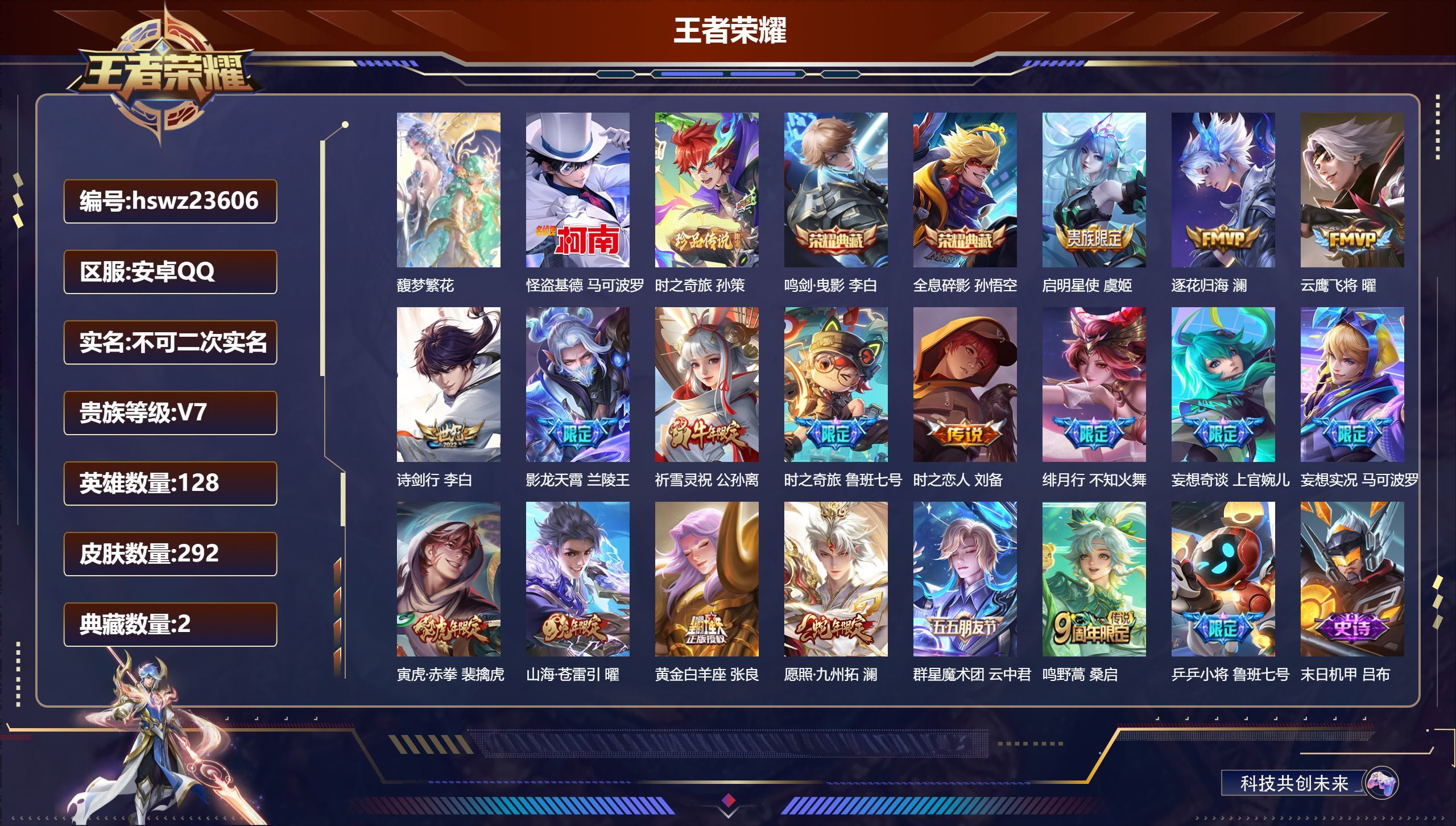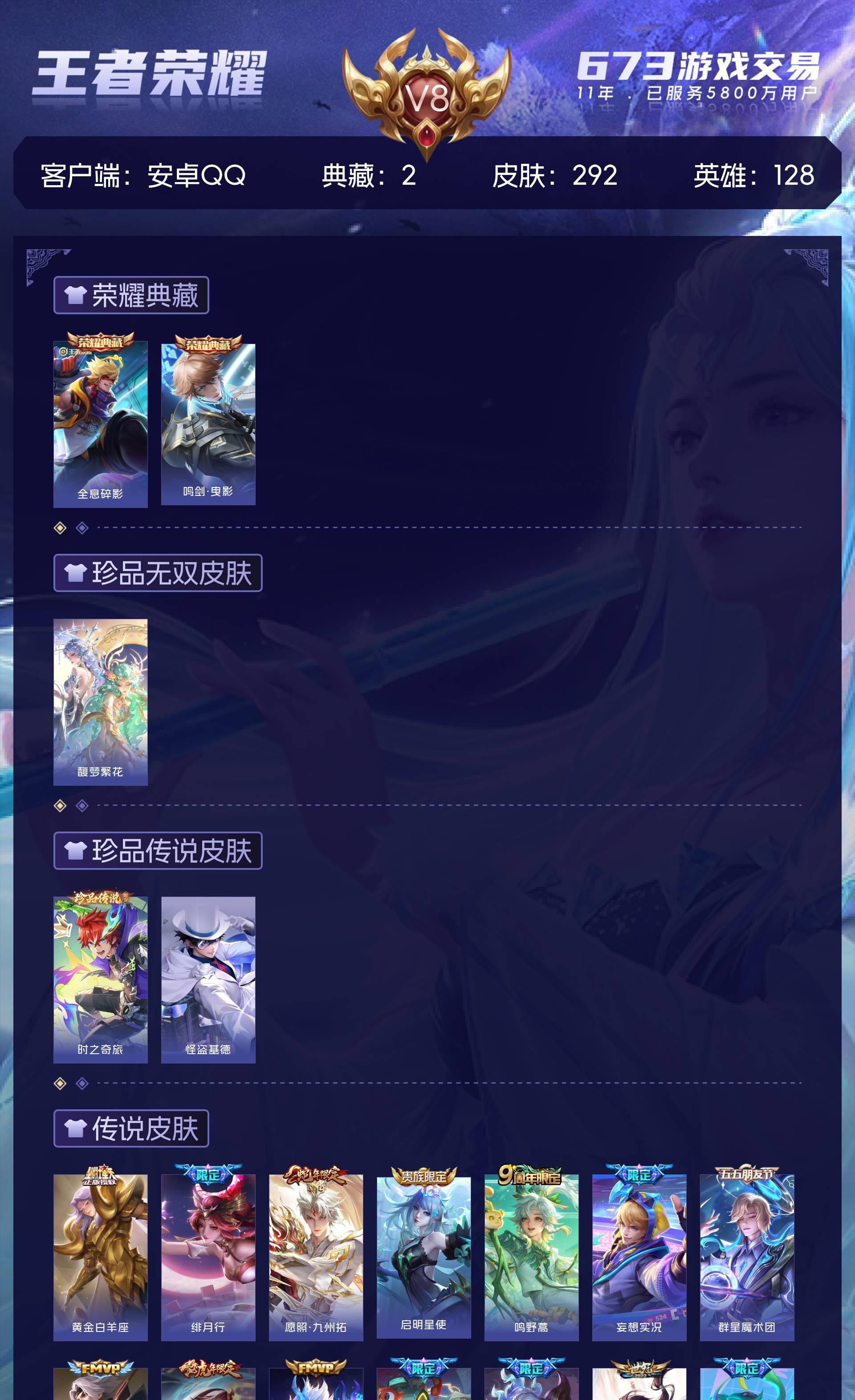 安卓QQ/至尊星耀/292皮肤/128英雄/2典藏/1珍品无双/0无双/2珍品传说/17传说/95史