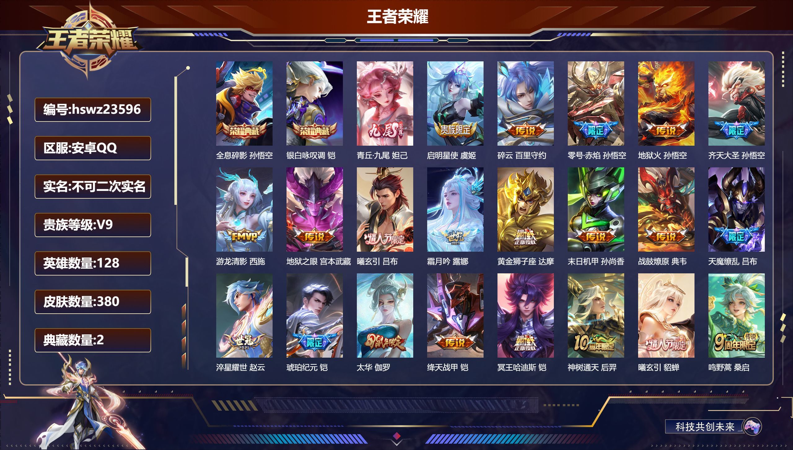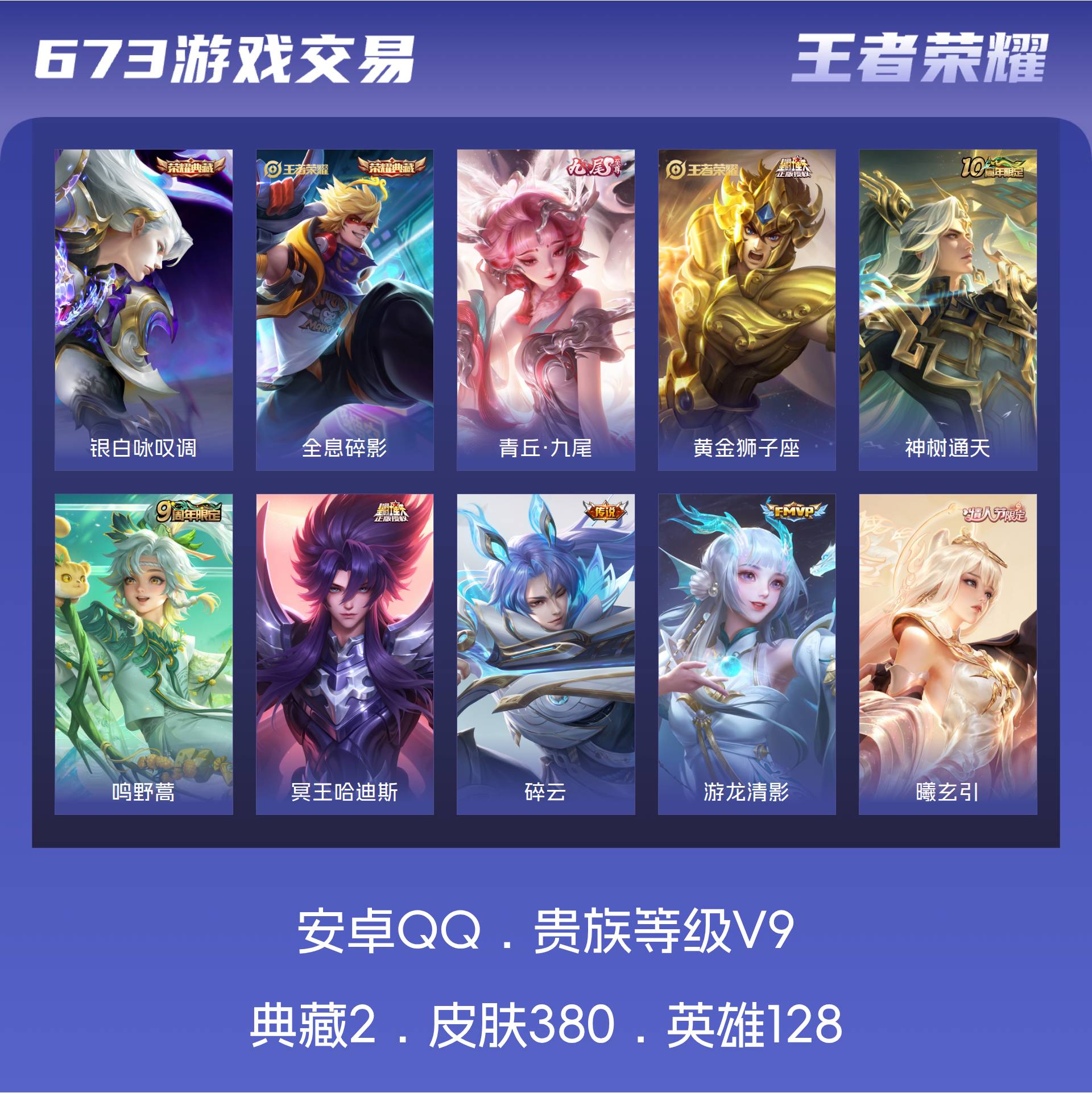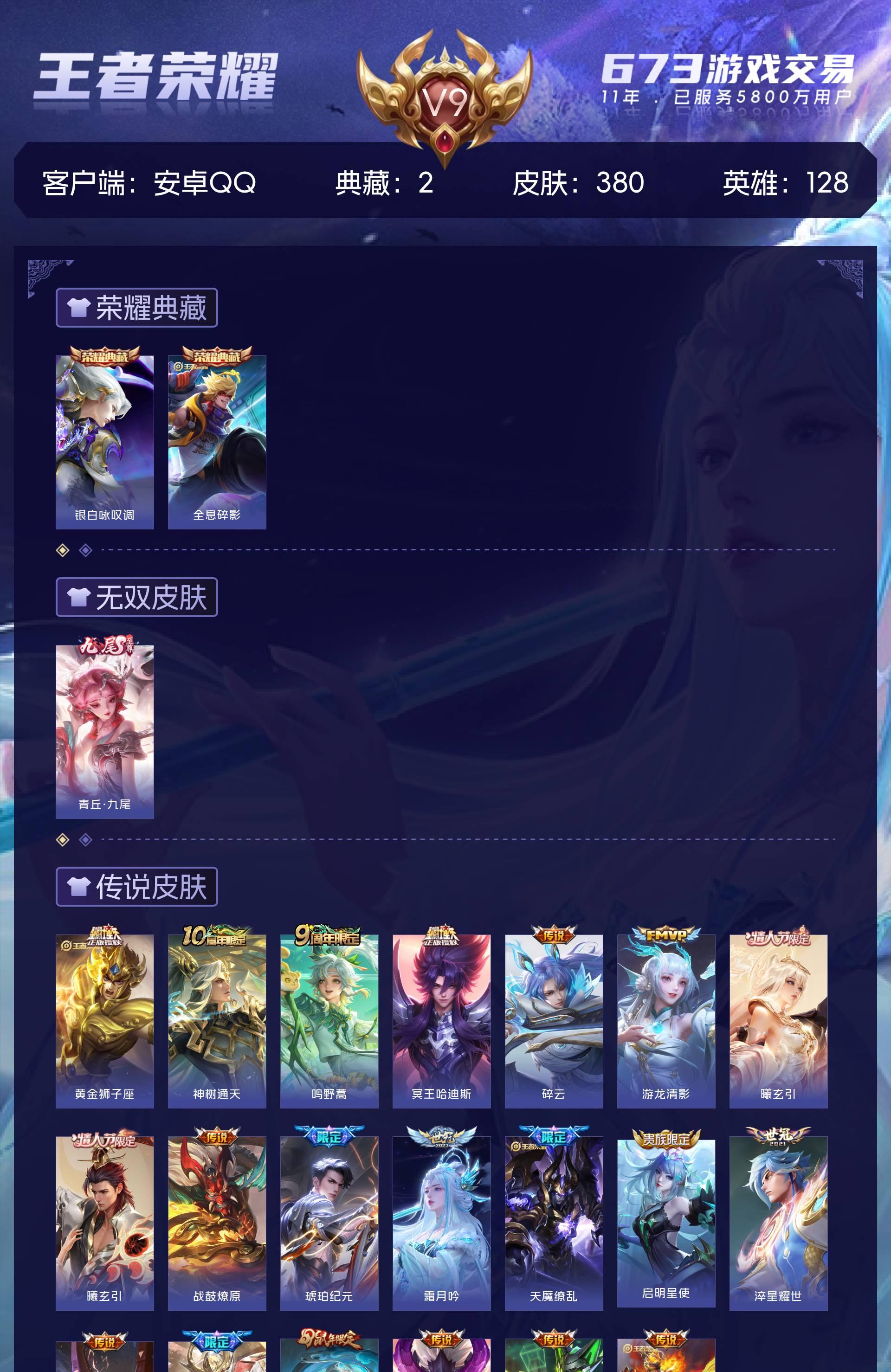 安卓QQ/最强王者/380皮肤/128英雄/2典藏/0珍品无双/1无双/0珍品传说/21传说/122