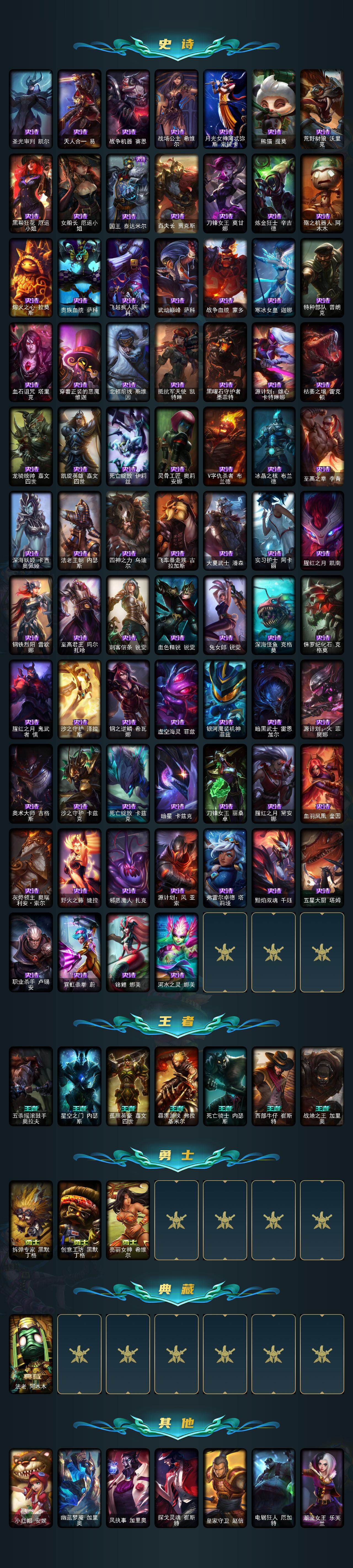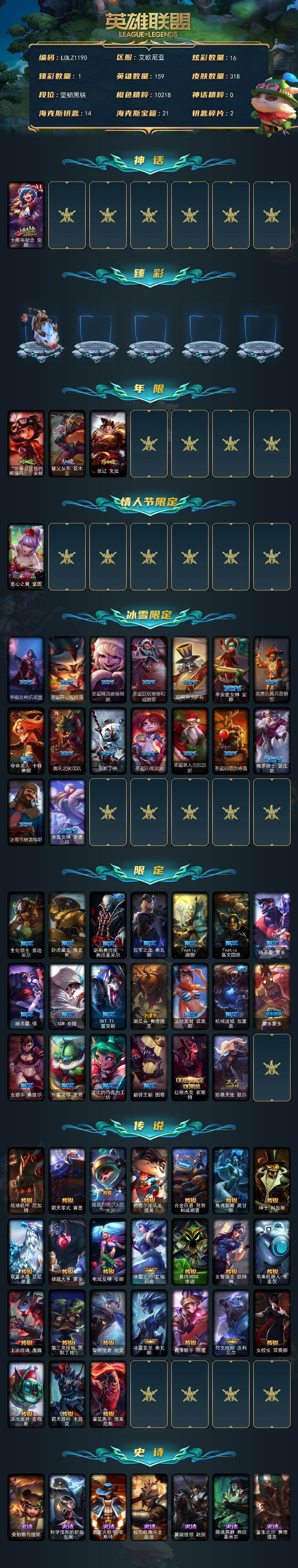 159英雄/318皮肤/1神话/40限定/1臻彩/16炫彩/24传说/81史诗/未定级/