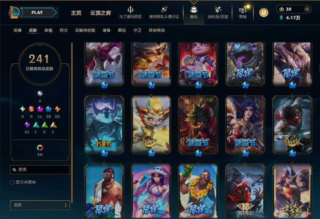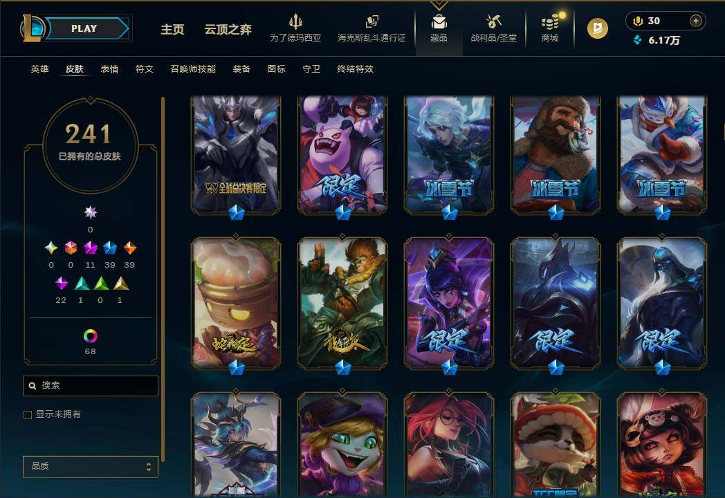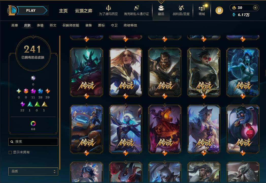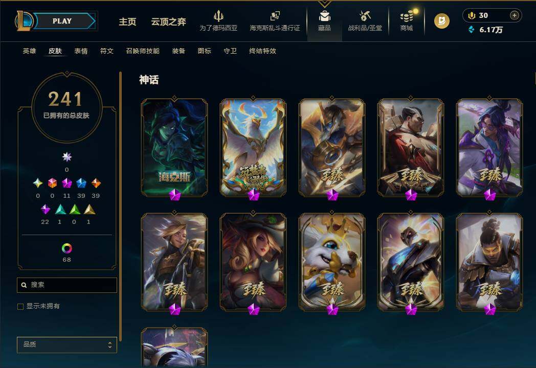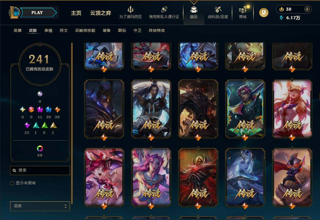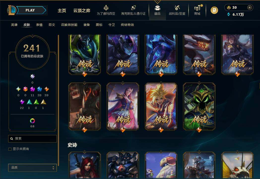 172英雄/241皮肤/11神话/39限定/11臻彩/113炫彩/39传说/22史诗/未定级账号等级:651/