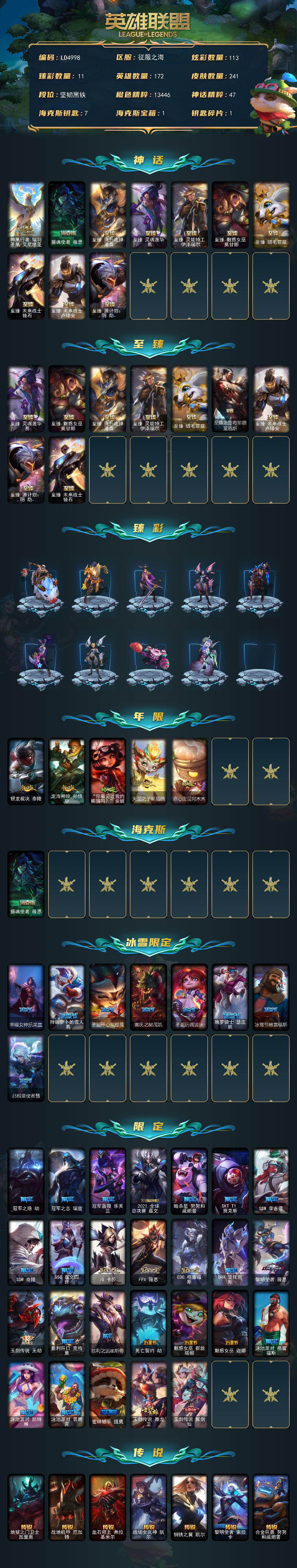 【LD4998】172英雄/241皮肤/11神话/39限定/11臻彩/113炫彩/39传说/22史诗/未定级账号等级:651/神凰行者瑞羽圣凰艾尼维亚/摄魂使者薇恩/至臻飞升战神潘森/至臻灵魂莲华易/至臻灵能特工伊泽瑞尔/至臻魅惑女巫莫甘娜/至臻绒毛菲兹/至臻未来战士锤石/至臻未来战士卢锡安/至臻源计划阴劫/至臻凯旋将军德莱厄斯/无畏骑士瑟庄妮赤子初心/神龙尊者圣龙李青龙腾云起/玉剑传说无极麒麟/弹幕天使卡莎炽天使勇敢/玉剑传说无劫胭脂/星之守护者金克丝黑洞/弹幕天使卡莎炽天使公正/可爱可爱粉红
