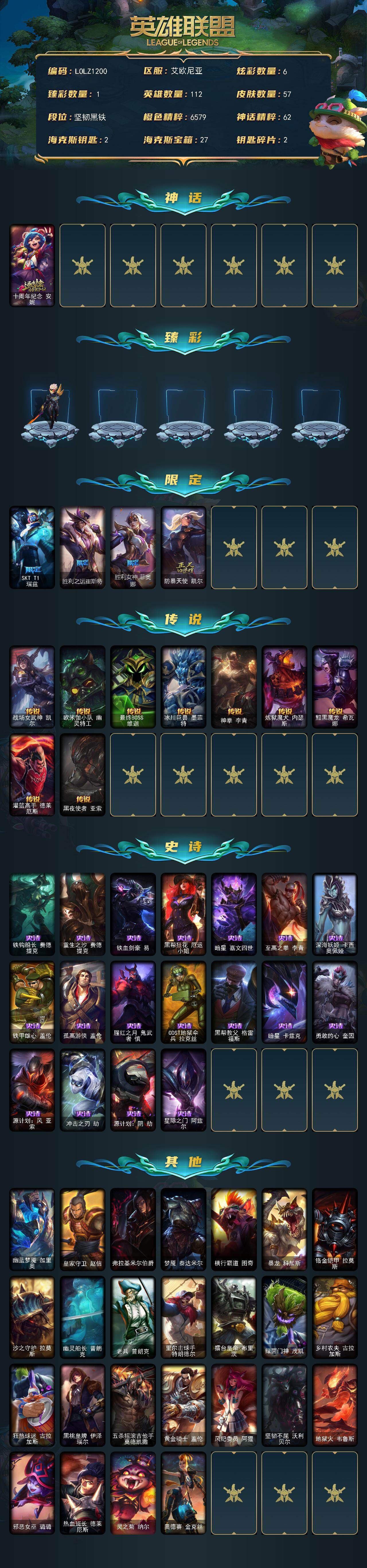 【LOLZ1200】112英雄/57皮肤/1神话/4限定/1臻彩/6炫彩/9传说/18史诗/未定级账号等级:307/十周年纪念安妮/源计划火菲奥娜惩戒/SKTT1瑞兹/胜利之运崔斯特/胜利女神菲奥娜/防暴天使凯尔/战场女武神凯尔/欧米伽小队幽灵特工/最终BOSS维迦/冰川巨兽墨菲特/神拳李青/炼狱魔犬内瑟斯/黯黑魔龙希瓦娜/灌篮高手德莱厄斯/黑夜使者亚索/铁钩船长费德提克/重生之沙费德提克/铁血剑豪易/黑帮狂花厄运小姐/暗星嘉文四世/至高之拳李青/深海妖姬卡西奥佩娅/铁甲雄心盖伦/孤高游侠盖伦/