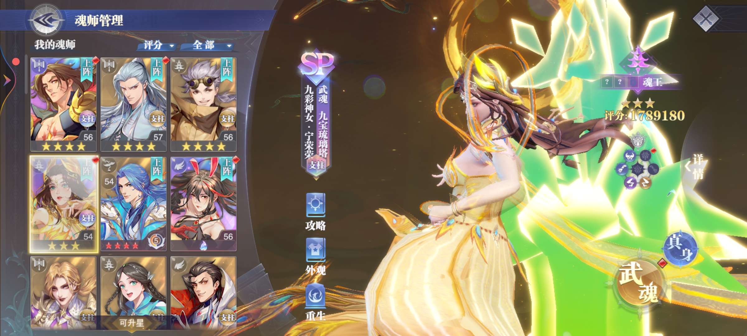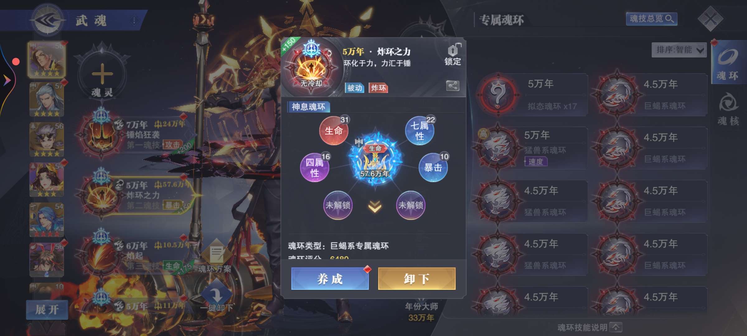 1500多万战力65级 有sp九彩神女SP大须弥锤唐昊 有10万年魂环神息暴击57万年1块3.8万