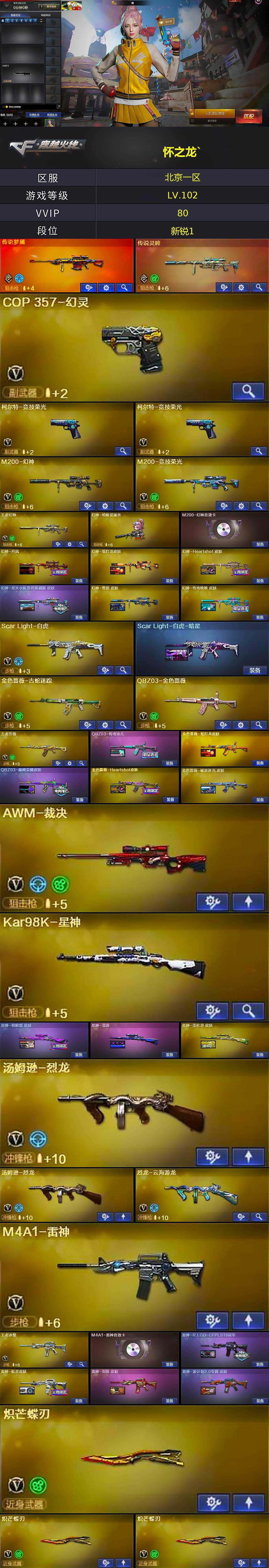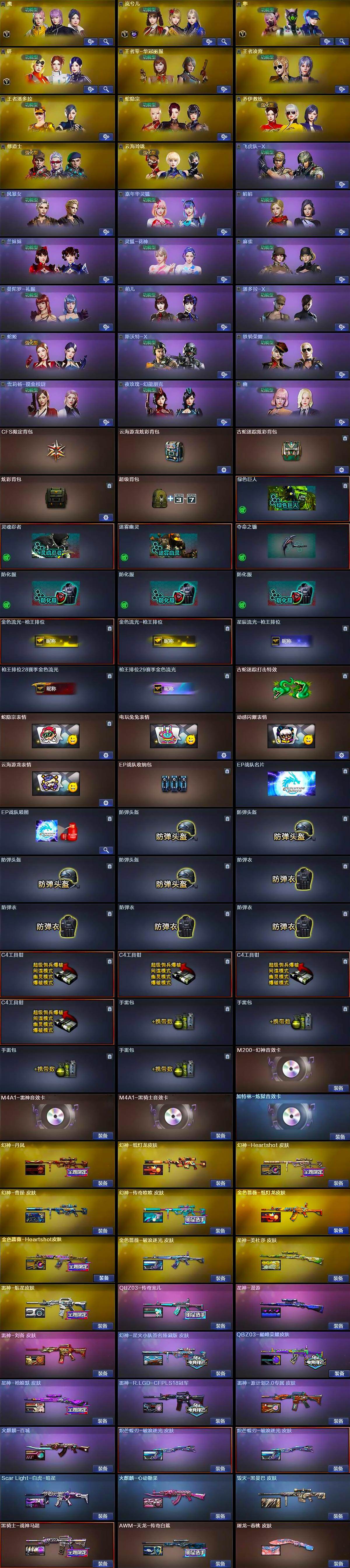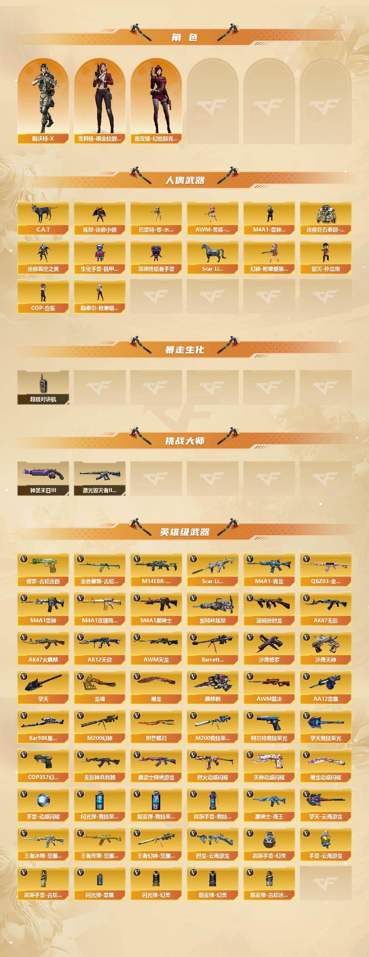 【热门武器】:传说梦魇,传说灵眸,QBZ03-金色蔷薇,M14EBR-玄武,Scar Light-白虎,M4A1-青龙,M200-幻神,金色蔷薇-古蛇迷踪,修罗-古蛇迷踪,M200-竞技荣光,Kar98K-星神,C.A.T,炼狱-迷你小钢,M4A1-黑骑士,汤姆逊-烈龙*2,加特林-炼狱,羊驼玩偶,幻神-枪娘爱丽丝,毁灭-孙三炮,COP-白鲨,COP 357-幻灵,沙鹰-修罗*3,柯尔特-赛博朋克,炽芒