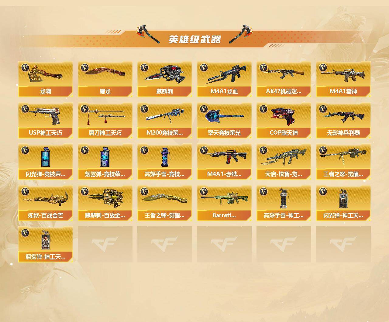 【热门武器】:M200-竞技荣光,死亡之眼,M4A1-黑骑士,汤姆逊-烈龙*6,RPK-盘龙*2,加特林-炼狱,COP-堕天神,沙鹰-修罗*6