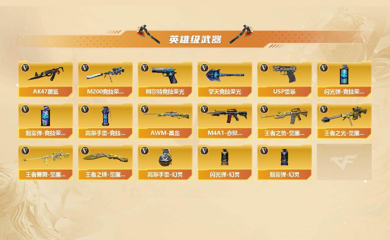 【热门武器】:QBZ03-金色蔷薇,M200-竞技荣光,死亡之眼*2,Kar98K-星神,牛牛-AK47,M4A1-黑骑士,加特林-炼狱,USP-雷暴,沙鹰-修罗*3