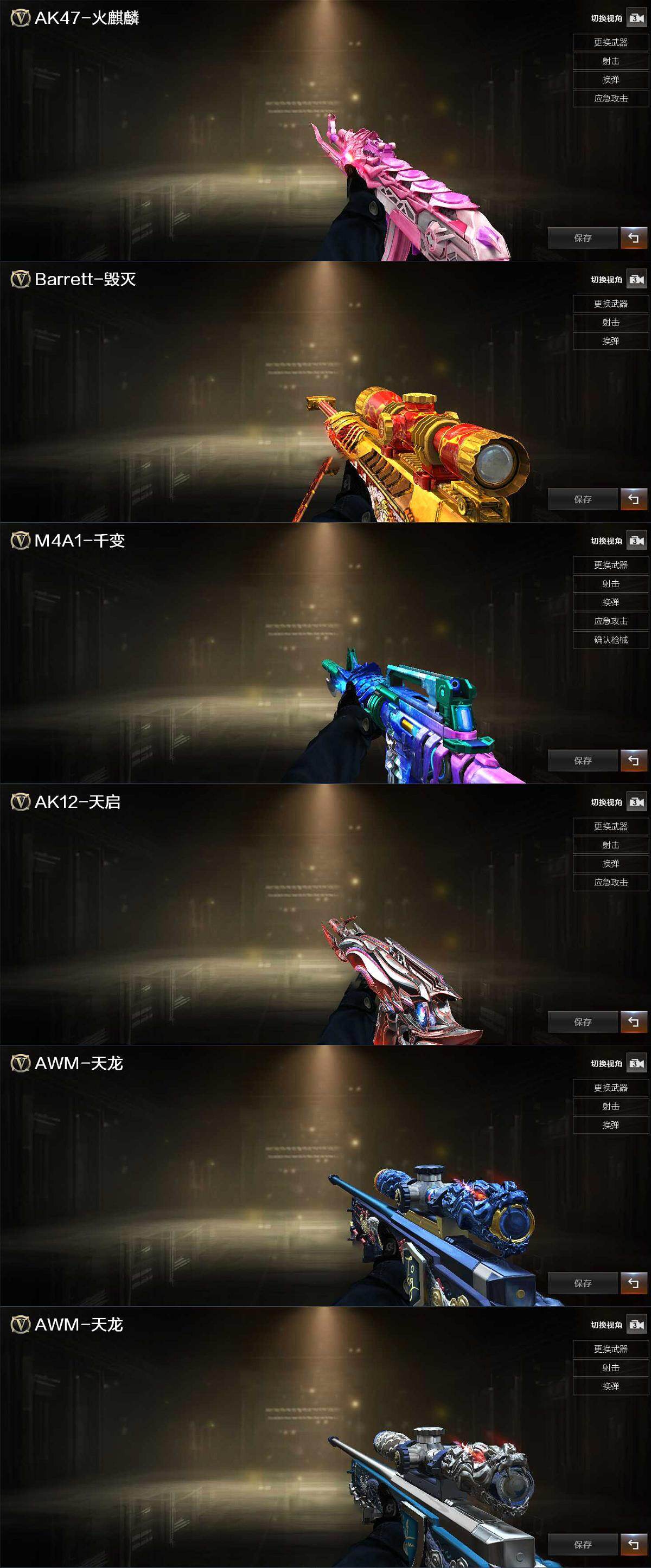 【皮肤】:火麒麟-心动糖果,毁灭-黑大圣皮肤,M4A1-千变-孔明皮肤,天启-暗月,AWM-天龙-传奇70KG,AWM-天龙-传奇白鲨