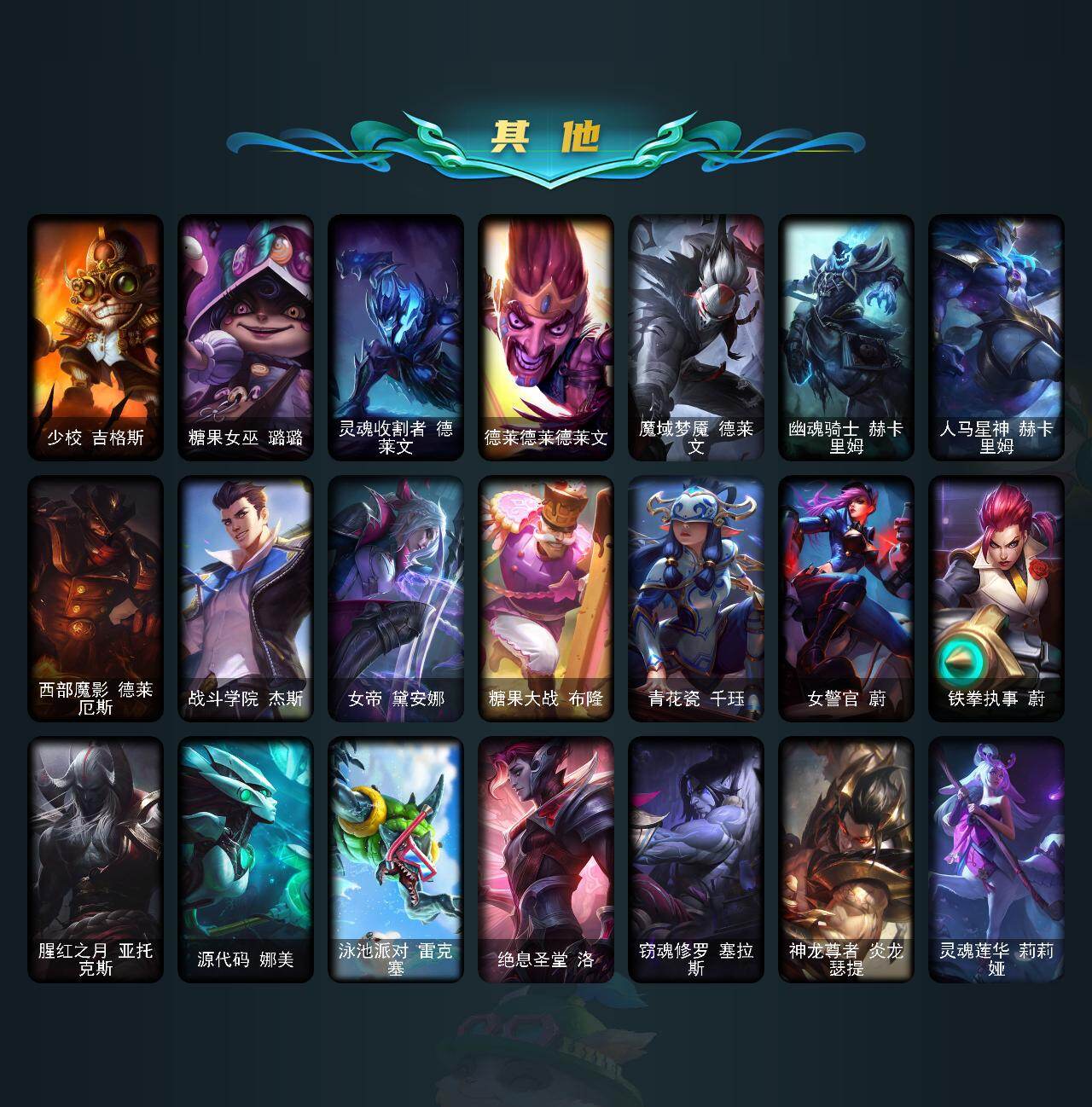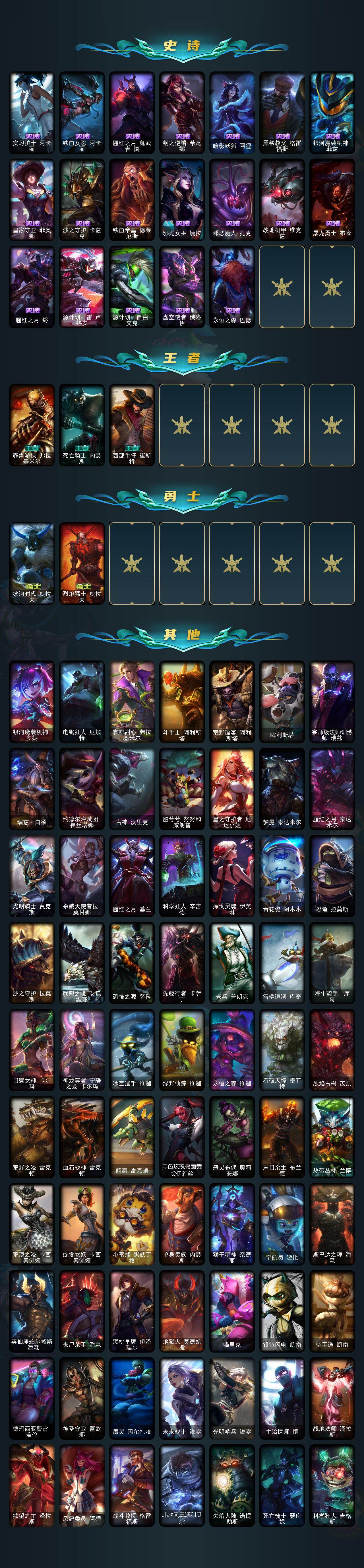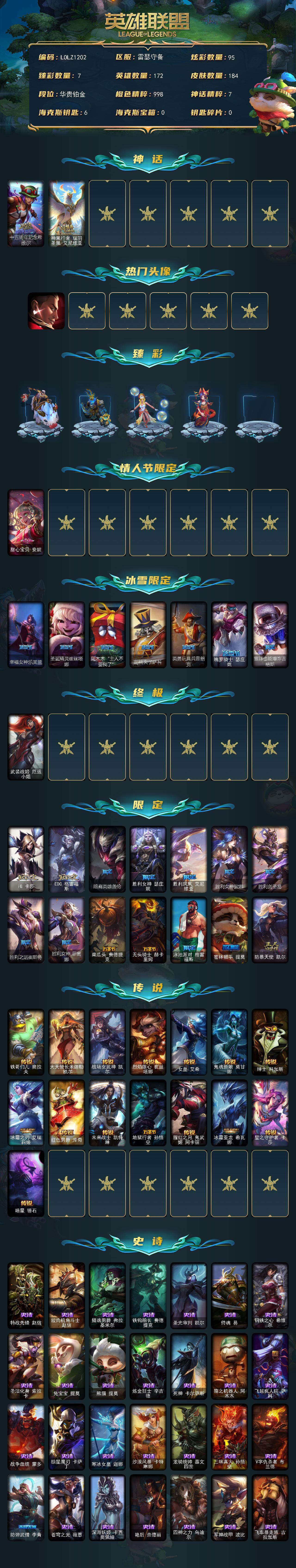 172英雄/184皮肤/1终极/2神话/23限定/7臻彩/95炫彩/15传说/47史诗/铂金/十五周年纪念希维尔/