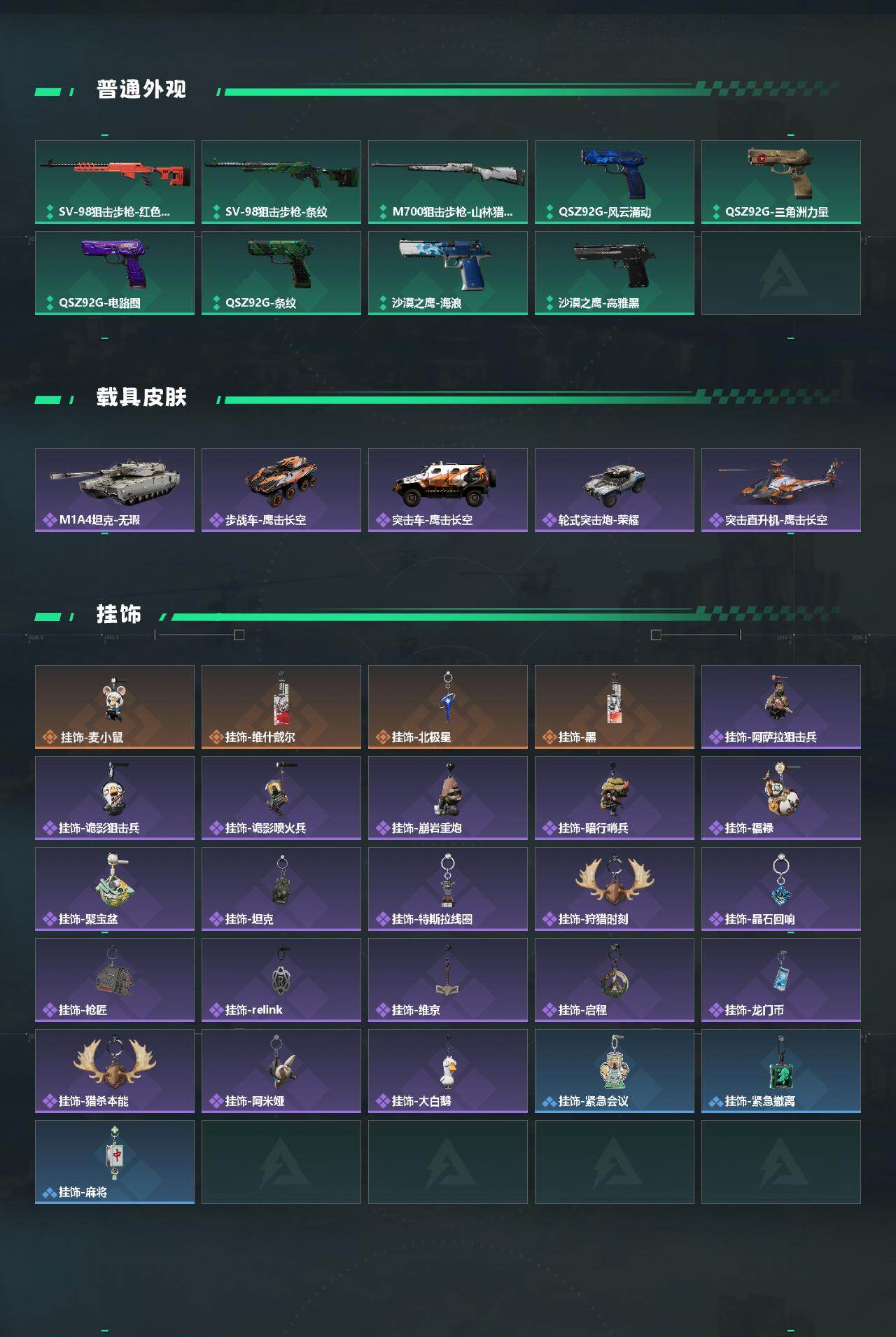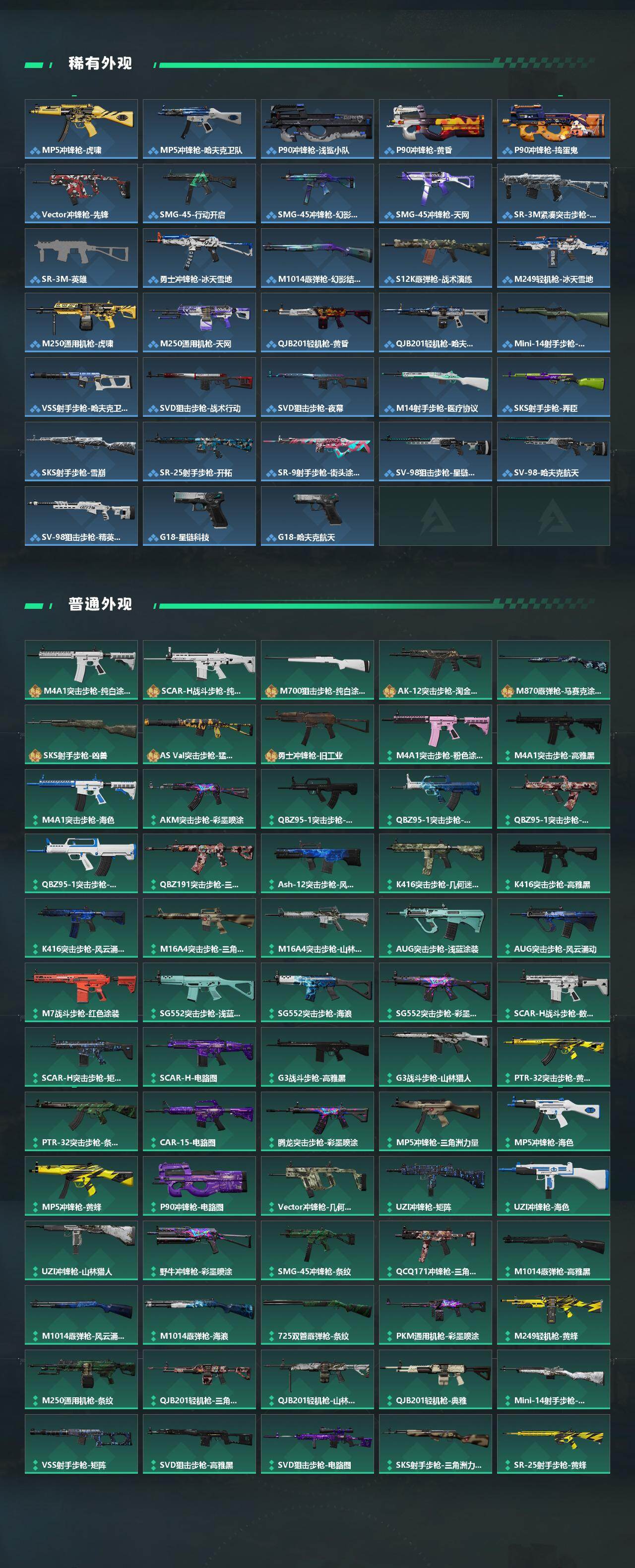【传说外观】:M4A1突击步枪-阿米娅,ASh-12战斗步枪-鹅鸭杀,M16A4突击步枪-狩猎时刻,AK-12突击步枪-特斯拉线圈,SCAR-H战斗步枪-启航,G3战斗步枪-狩猎时刻,G3战斗步枪-