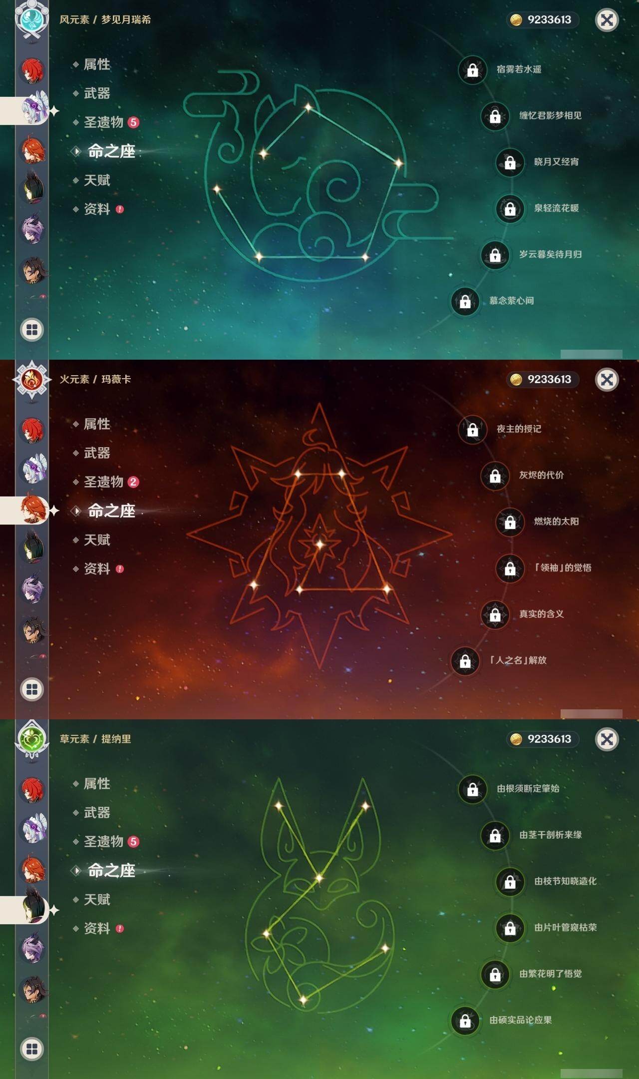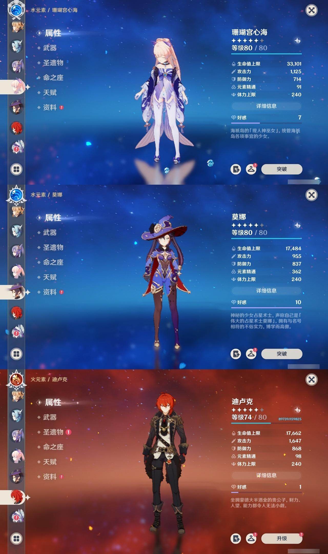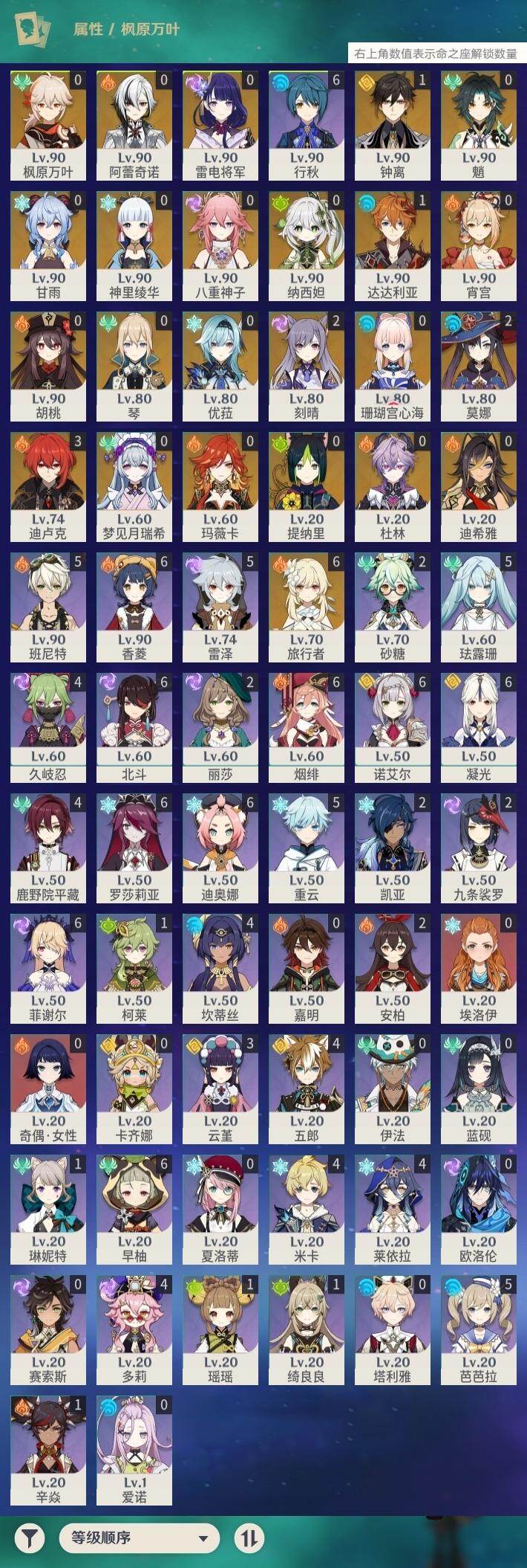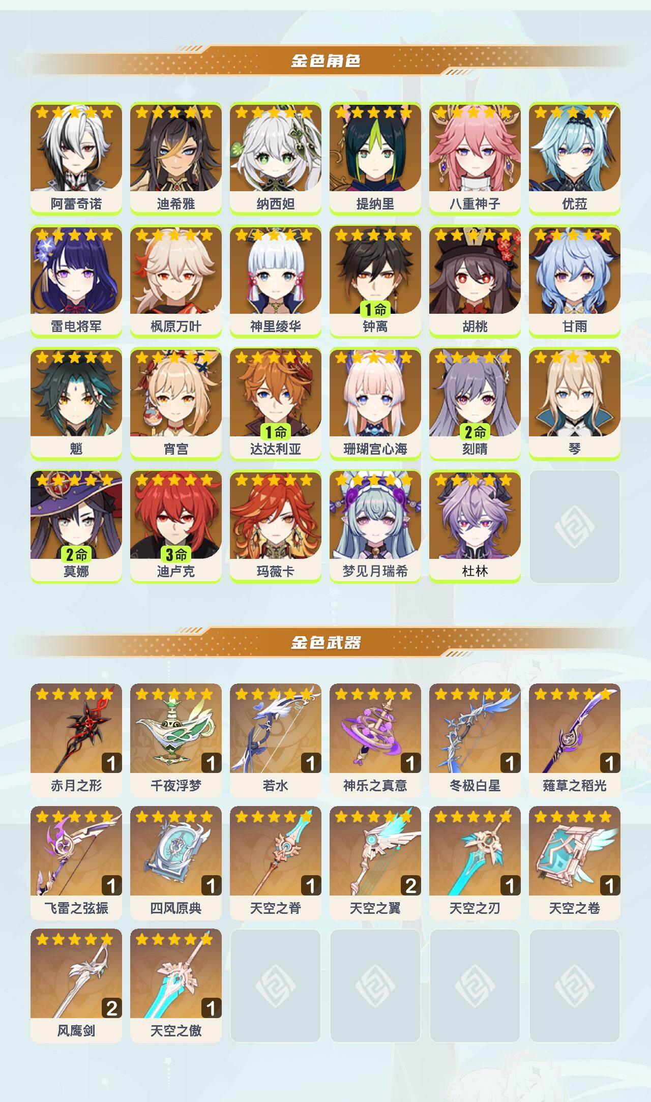 0命阿蕾奇诺,0命迪希雅,0命纳西妲,0命提纳里,0命八重神子,0命优菈,0命雷电将军,0命枫原万叶,0命神里绫华,1命钟离,0命胡桃,0命甘雨,0命魈,0命宵宫,1命达达利亚,0命珊瑚宫心海,2命刻晴,0命琴,2命莫娜,3命迪卢克,0命玛薇卡,0命梦见月瑞希,0命杜林,精1赤月之形,精1千夜浮梦,精1若水,精1神乐之真意,精1冬极白星,精1