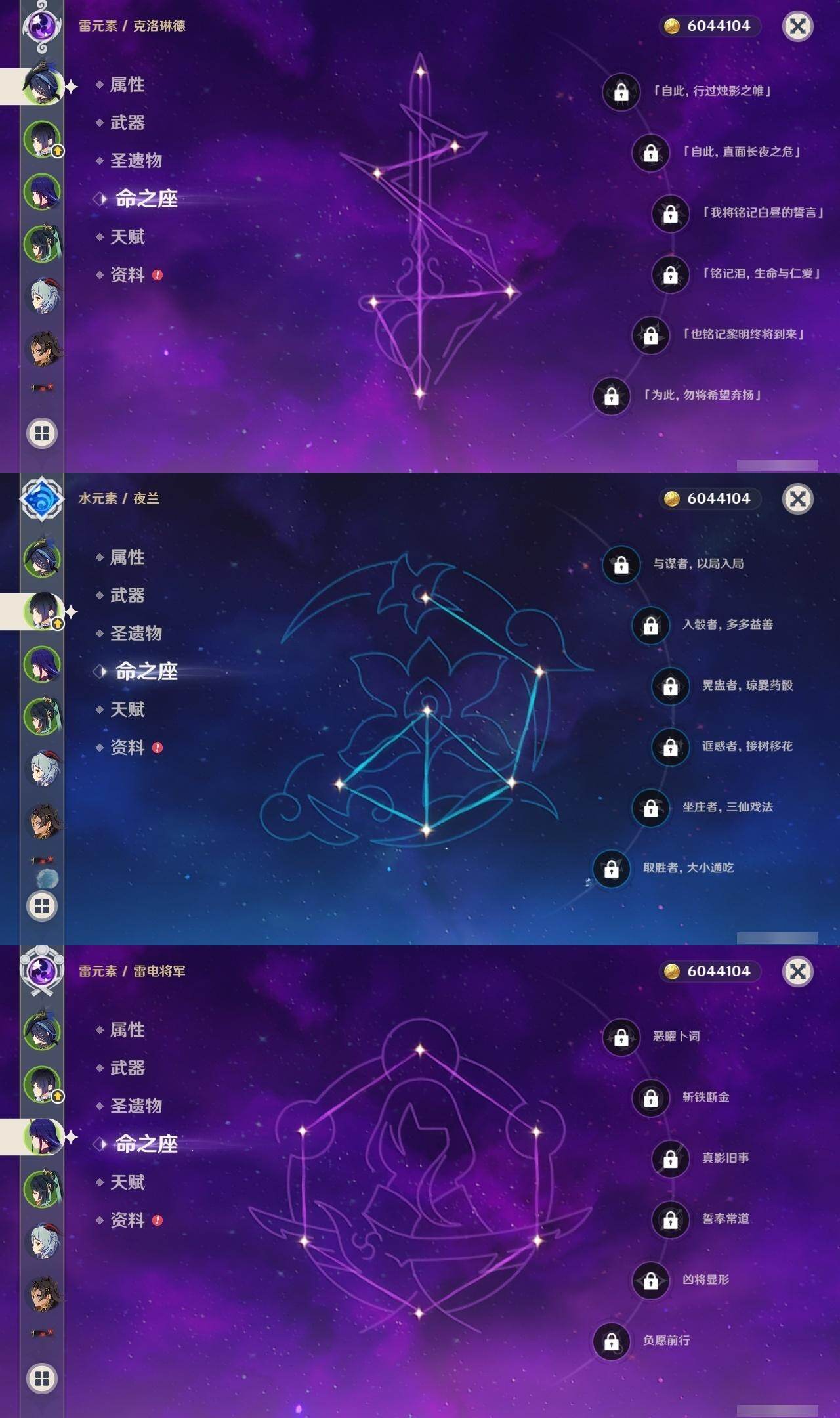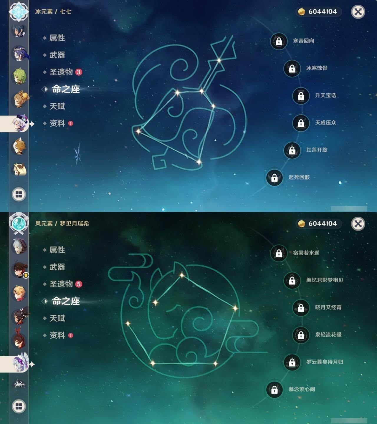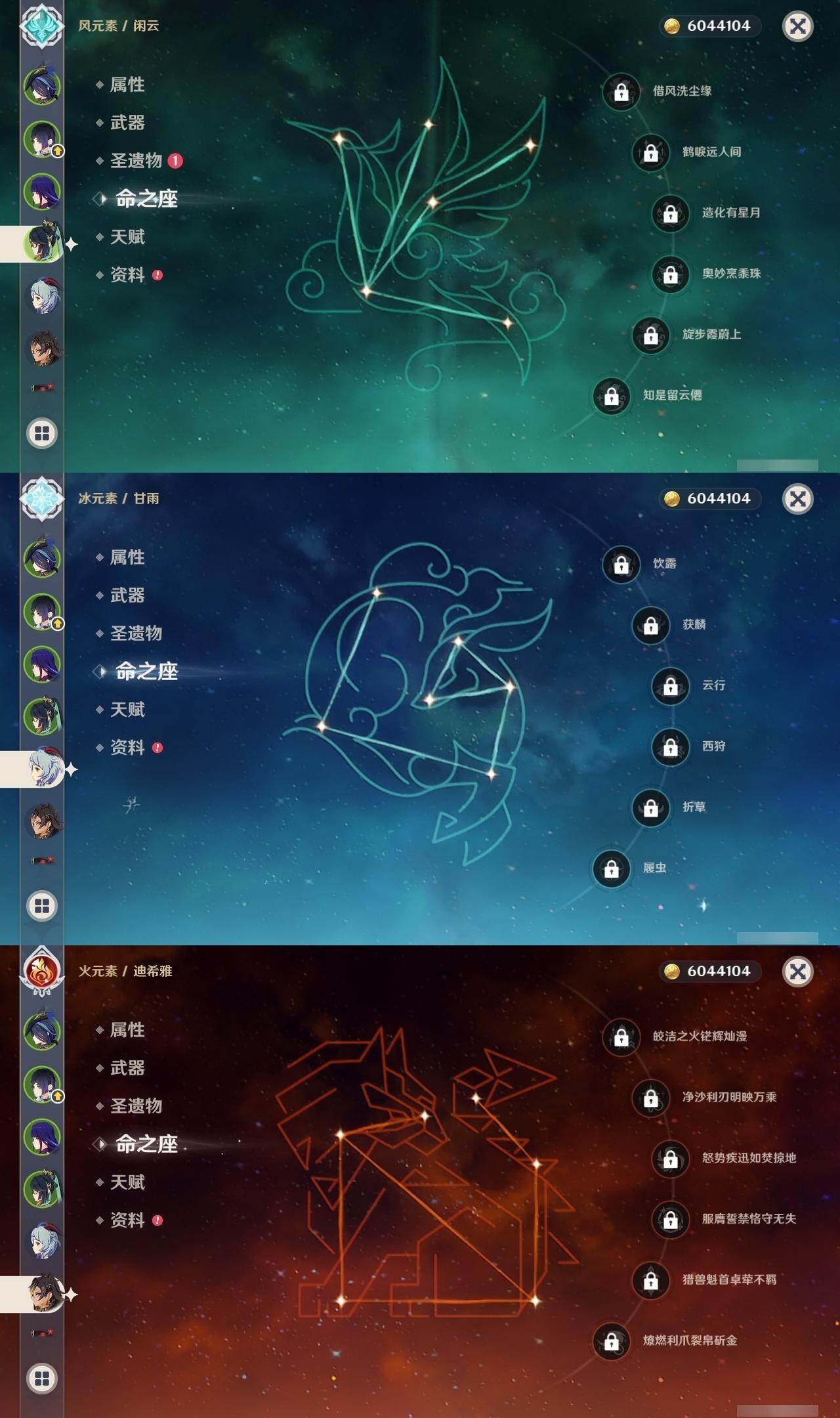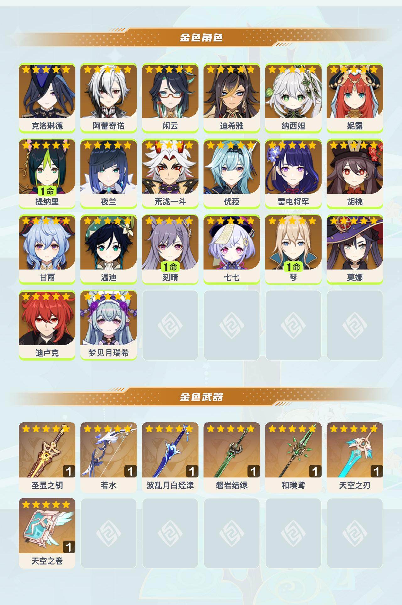 0命克洛琳德,0命阿蕾奇诺,0命闲云,0命迪希雅,0命纳西妲,0命妮露,1命提纳里,0命夜兰,0命荒泷一斗,0命优菈,0命雷电将军,0命胡桃,0命甘雨,0命温迪,1命刻晴,0命七七,1命琴,0命莫娜,0命迪卢克,0命梦见月瑞希,精1圣显之钥,精1若水,精1波乱月白经津,精1磐岩结绿,精1和璞鸢,精1天空之刃,精1天空之卷