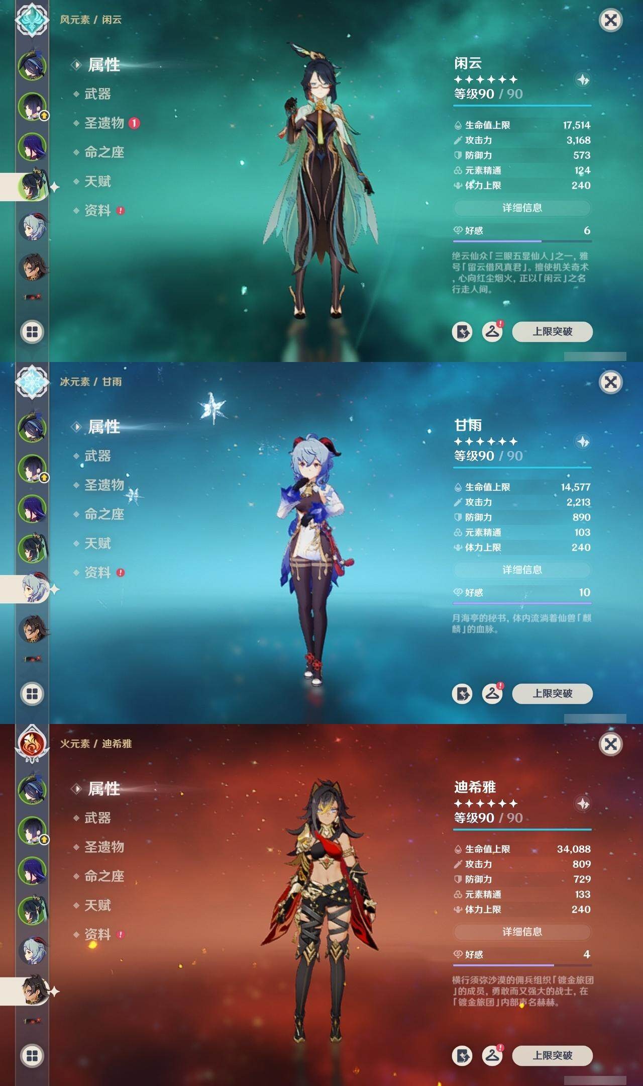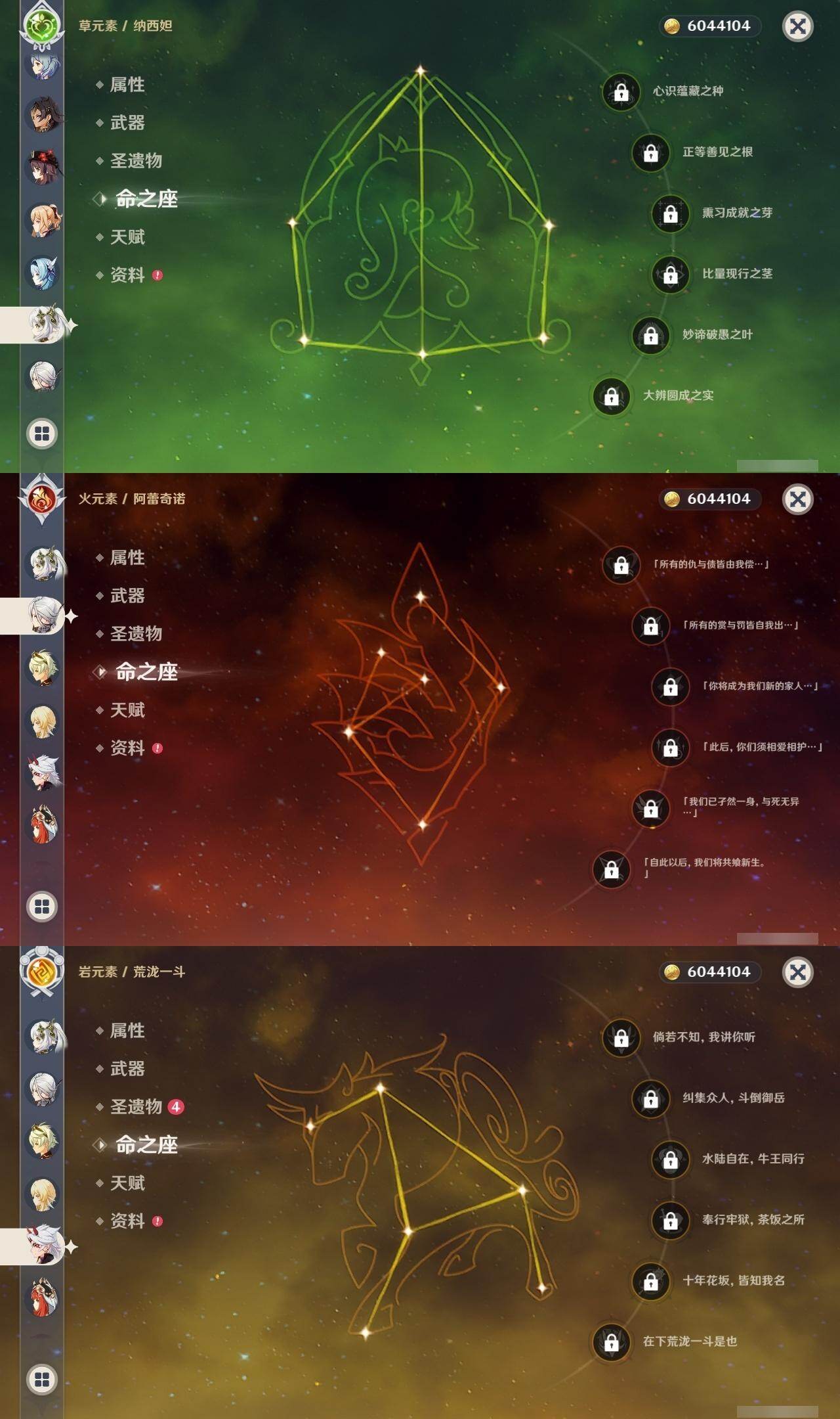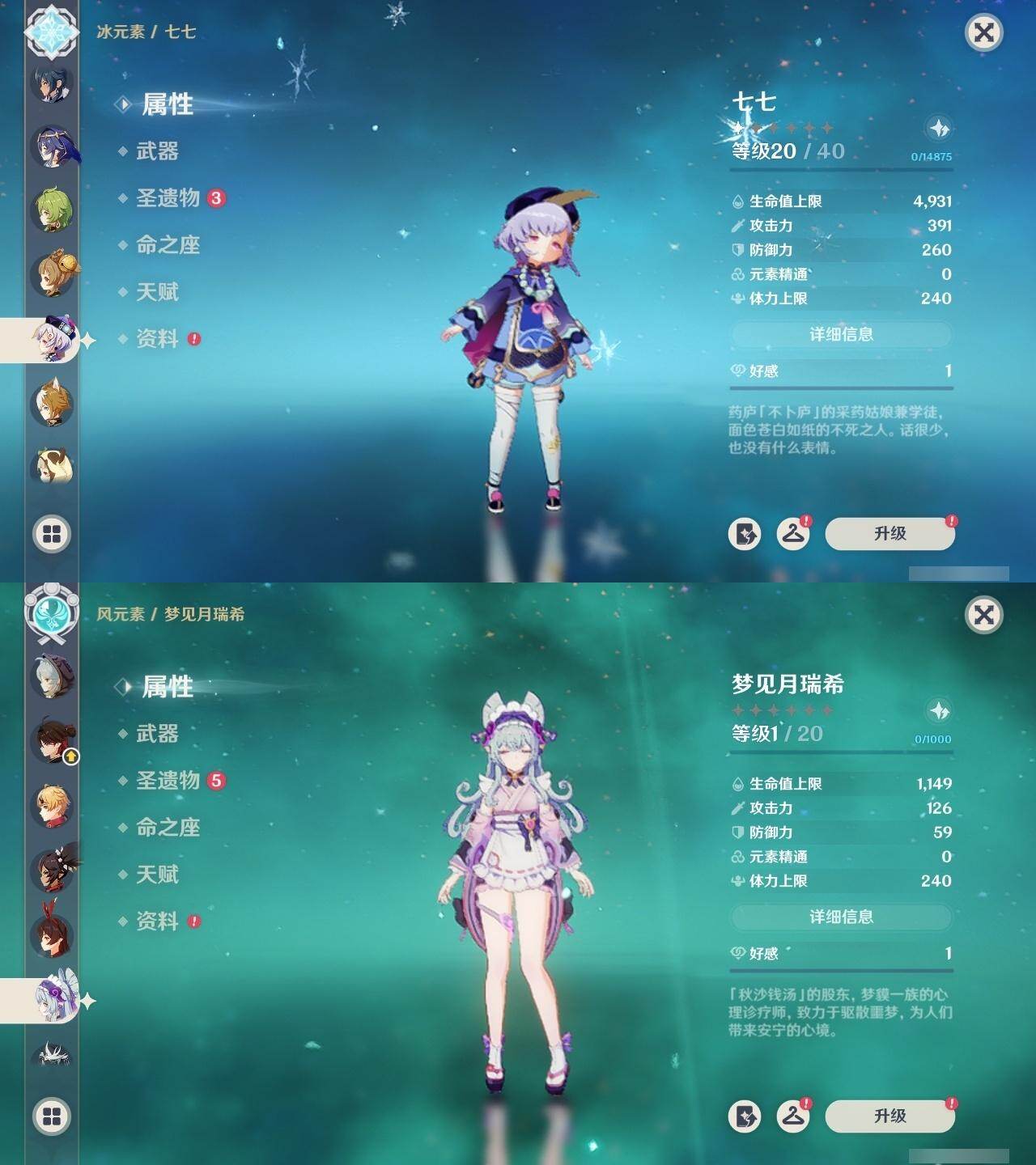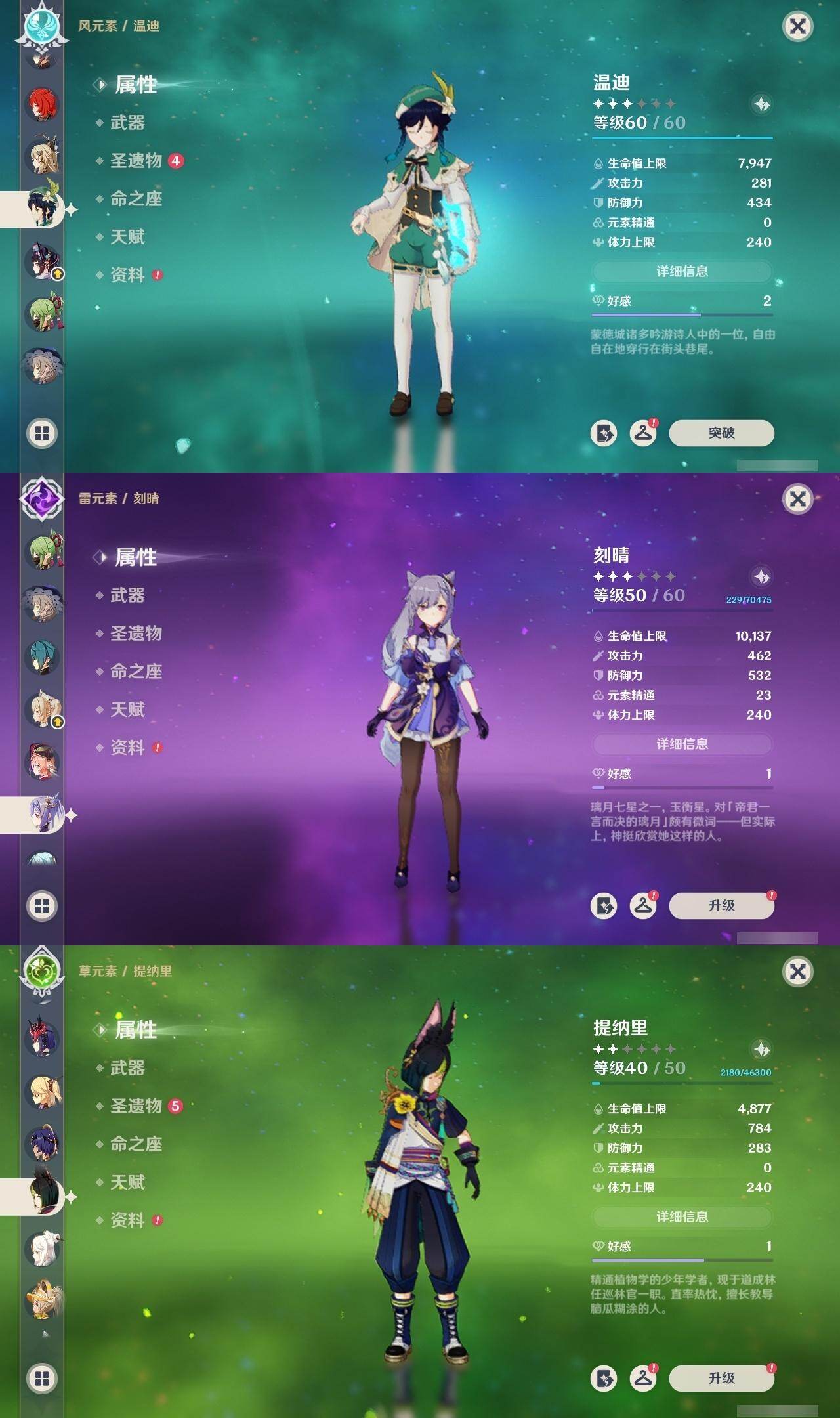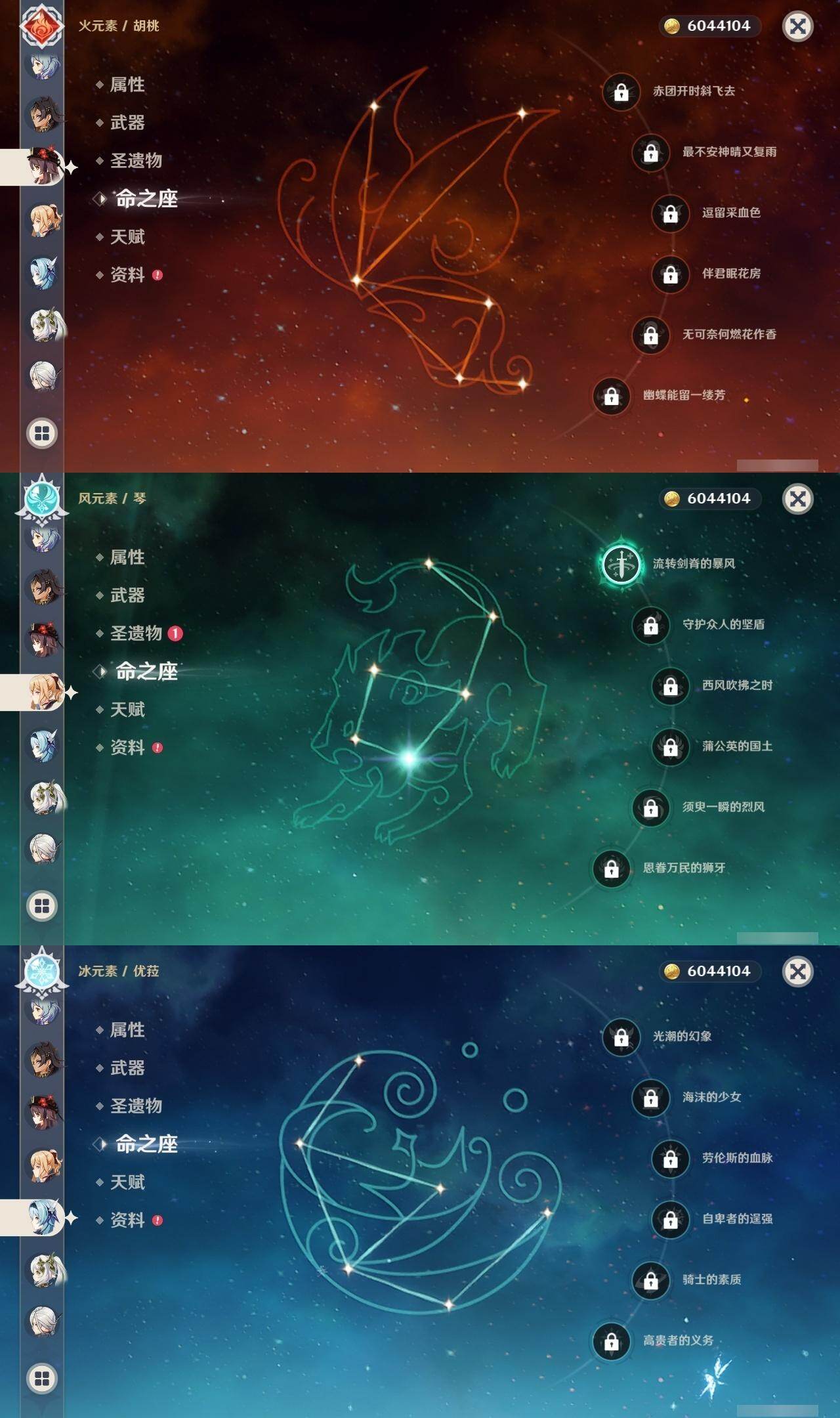 0命克洛琳德,0命阿蕾奇诺,0命闲云,0命迪希雅,0命纳西妲,0命妮露,1命提纳里,0命夜兰,0命荒泷一斗,0命优菈,0命雷电将军,0命胡桃,0命甘雨,0命温迪,1命刻晴,0命七七,1命琴,0命莫娜,0命迪卢克,0命梦见月瑞希,精1圣显之钥,精1若水,精1波乱月白经津,精1磐岩结绿,精1和璞鸢,精1天空之刃,精1天空之卷