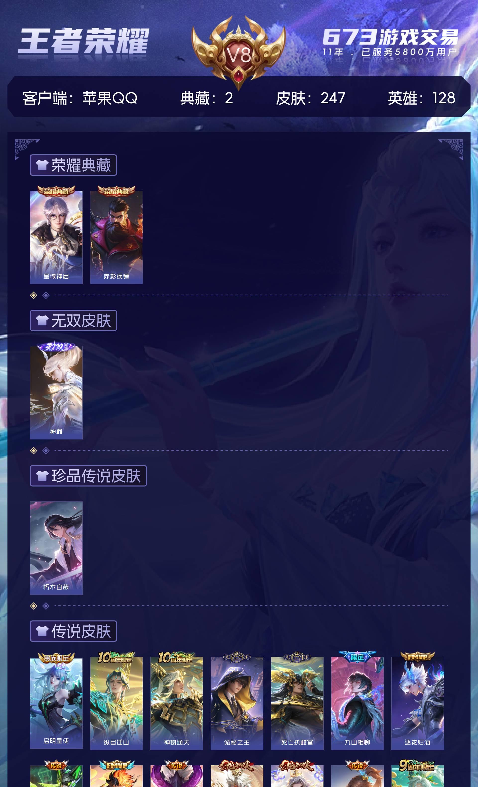 V8 皮肤247 英雄128 荣耀王者 荣耀典藏2 无双皮肤1 珍品传说1 星传说2 传说20 其他皮肤228