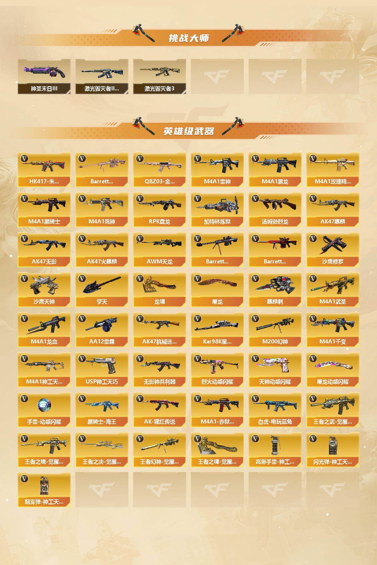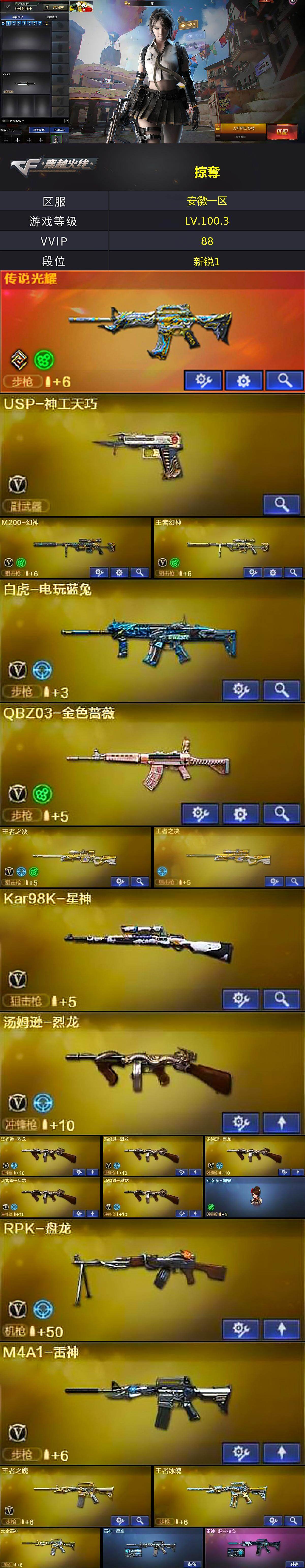 【热门武器】:传说光耀,QBZ03-金色蔷薇,HK417-朱雀,M200-幻神,死亡之眼*2,白虎-电玩蓝兔,Kar98K-星神,M4A1-黑骑士,汤姆逊-烈龙*6,RPK-盘龙,加特林-炼狱*3,斯泰尔-蝴蝶,沙鹰-修罗*3