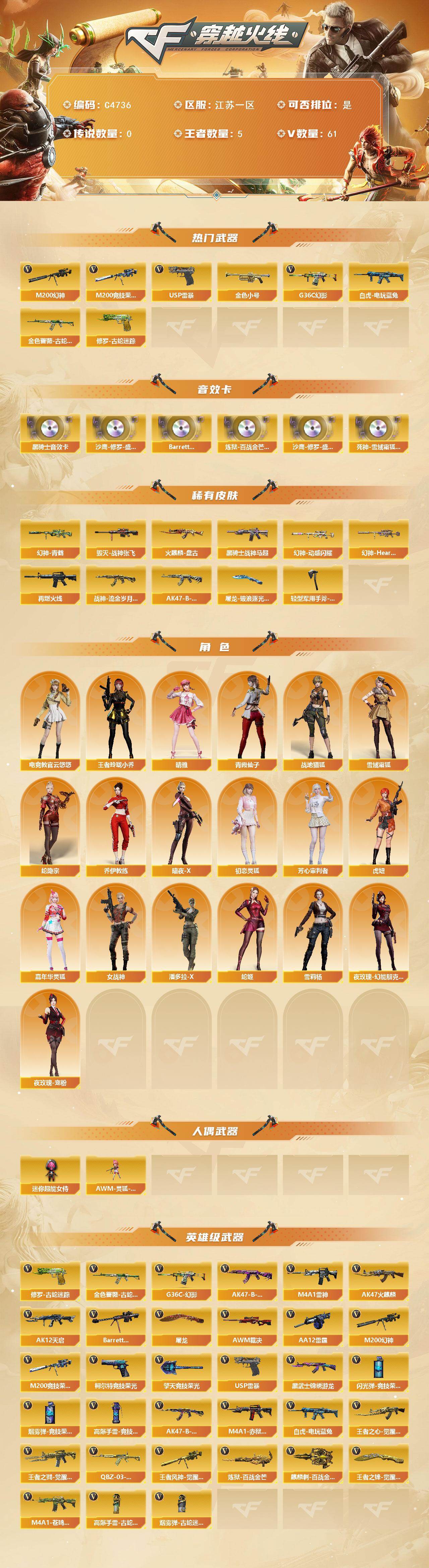 【C4736】江苏一区-62V-5王者武器数-0炫金武器数