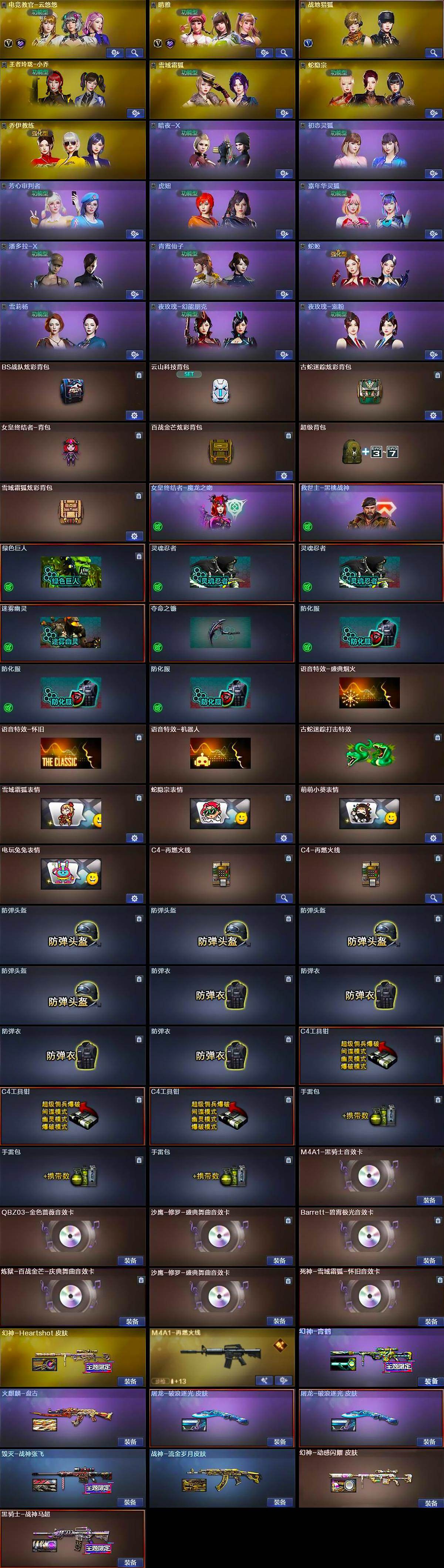 【音效卡】:M4A1-黑骑士音效卡,沙鹰-修罗-盛典舞曲音效卡*2,Barrett-碧霄极光音效卡,炼狱-百战金芒-庆典舞曲音效卡,死神-雪域霜狐-怀旧音效卡