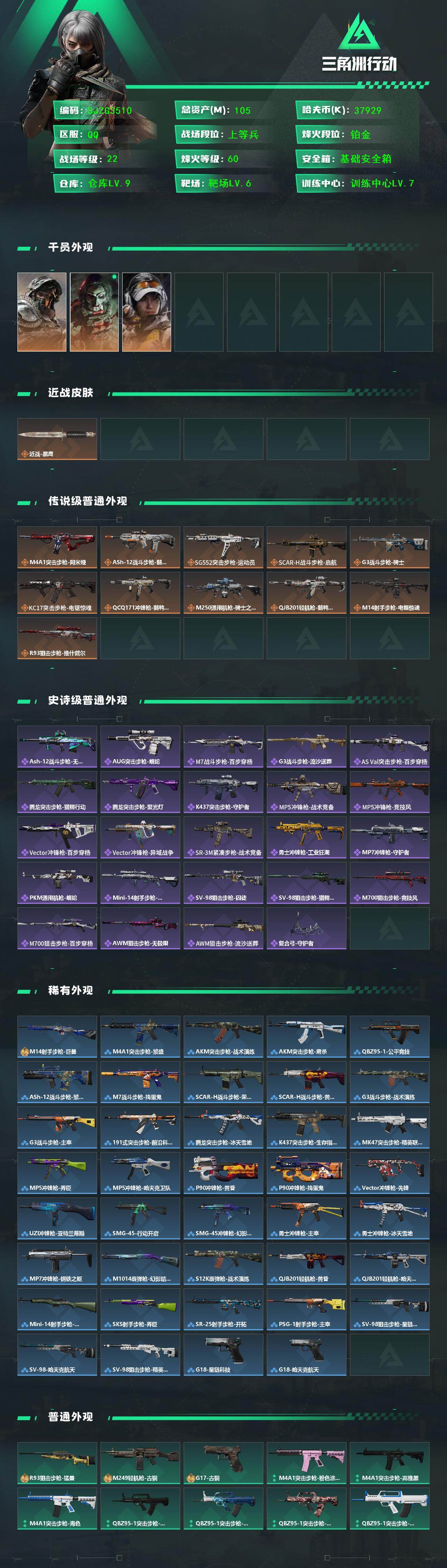 【SJZG3510】总资产(M):105M/哈夫币(K):37929K/哈夫币(K):37929K/传说枪皮数:11/全面战场等级:22_段位:上等兵/烽火地带等级:60_段位:铂金/深蓝-不破誓约/红狼-电锯惊魂/露娜-金牌射手/近战-黑鹰/鹅鸭杀捆绑包/M4A1突击步枪-阿米娅/ASh-12战斗步枪-鹅鸭杀/SG552突击步枪-运动员/SCAR-H战斗步枪-启航/G3战斗步枪-骑士/KC17突击步枪-电锯惊魂/QCQ171冲锋枪-鹅鸭杀/M250通用机枪-骑士之心/QJB201轻机枪-鹅鸭杀