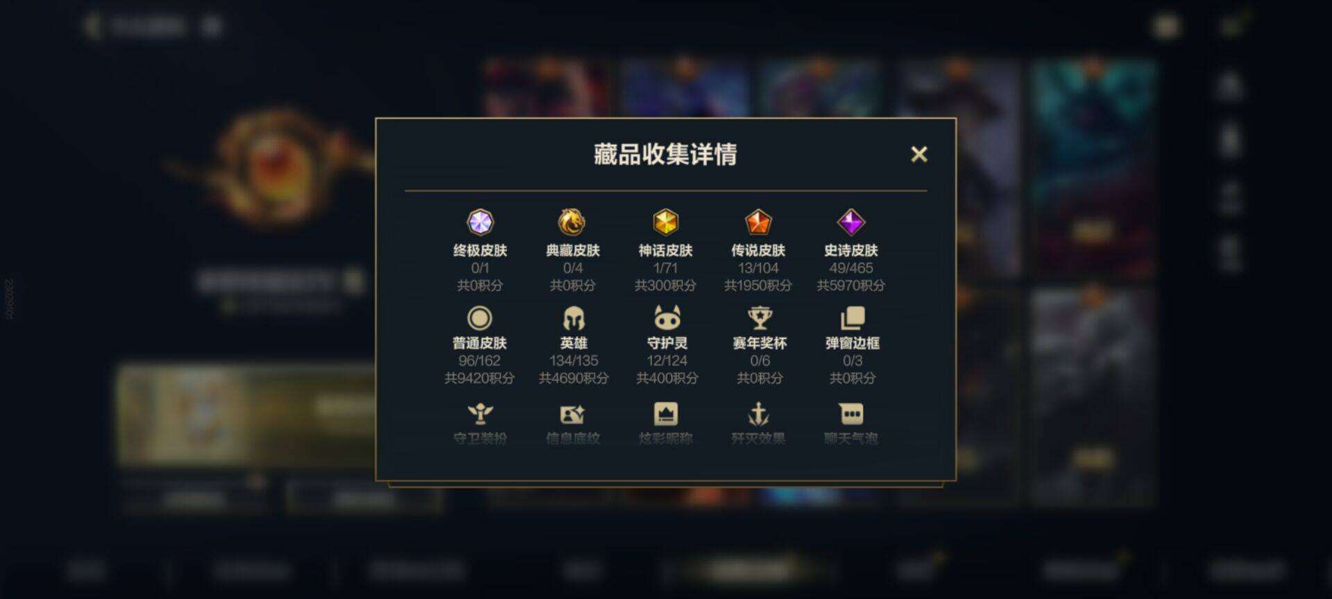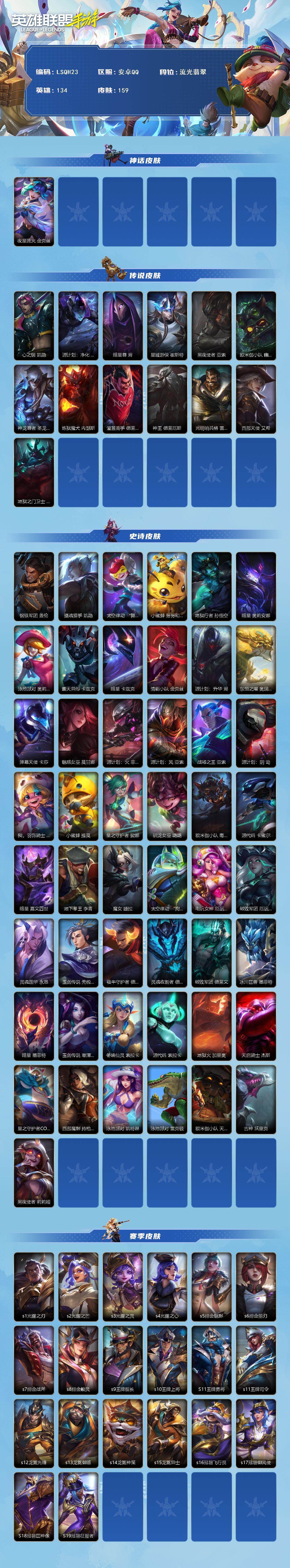 【LSQH23】134英雄/159皮肤/1神话/13传说/49史诗/流光翡翠/夜星流火 金克丝/心之钢 凯隐/源计划:净化 薇恩/暗星尊 烬/星域游侠 崔斯特/黑夜使者 亚索/欧米伽小队 幽灵特工 提莫/神龙尊者 圣龙 李青/炼狱魔犬 内瑟斯/灌篮高手 德莱厄斯/神王 德莱厄斯/光明哨兵 格雷福斯/西部天使 艾希/地狱之门卫士 加里奥/钢铁军团 盖伦/摄魂猎手 凯隐/太空律动 “舞林双子” 努努和威朗普/小蜜蜂 努努和威朗普/地狱行者 孙悟空/暗星 奥莉安娜/泳池派对 奥莉安娜/霸天异形 卡兹克