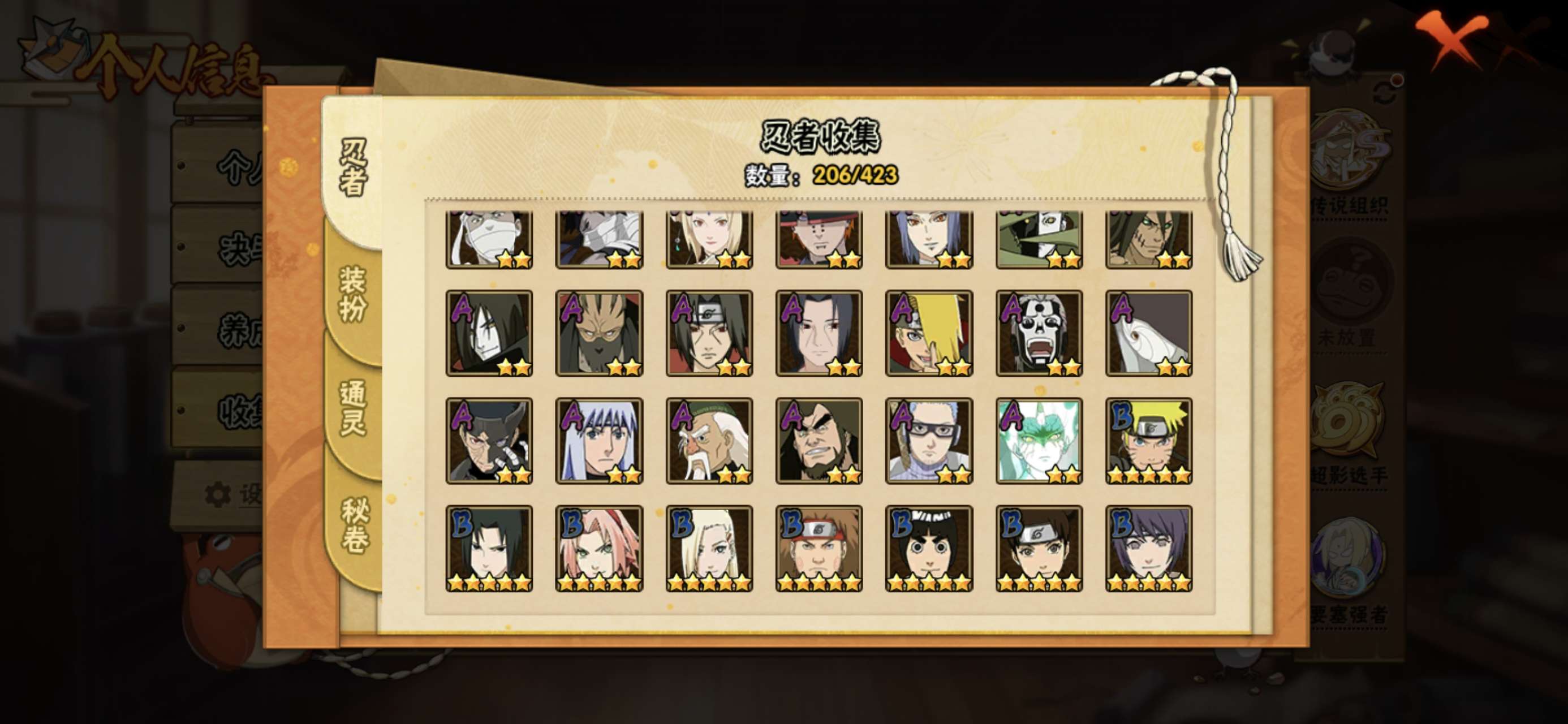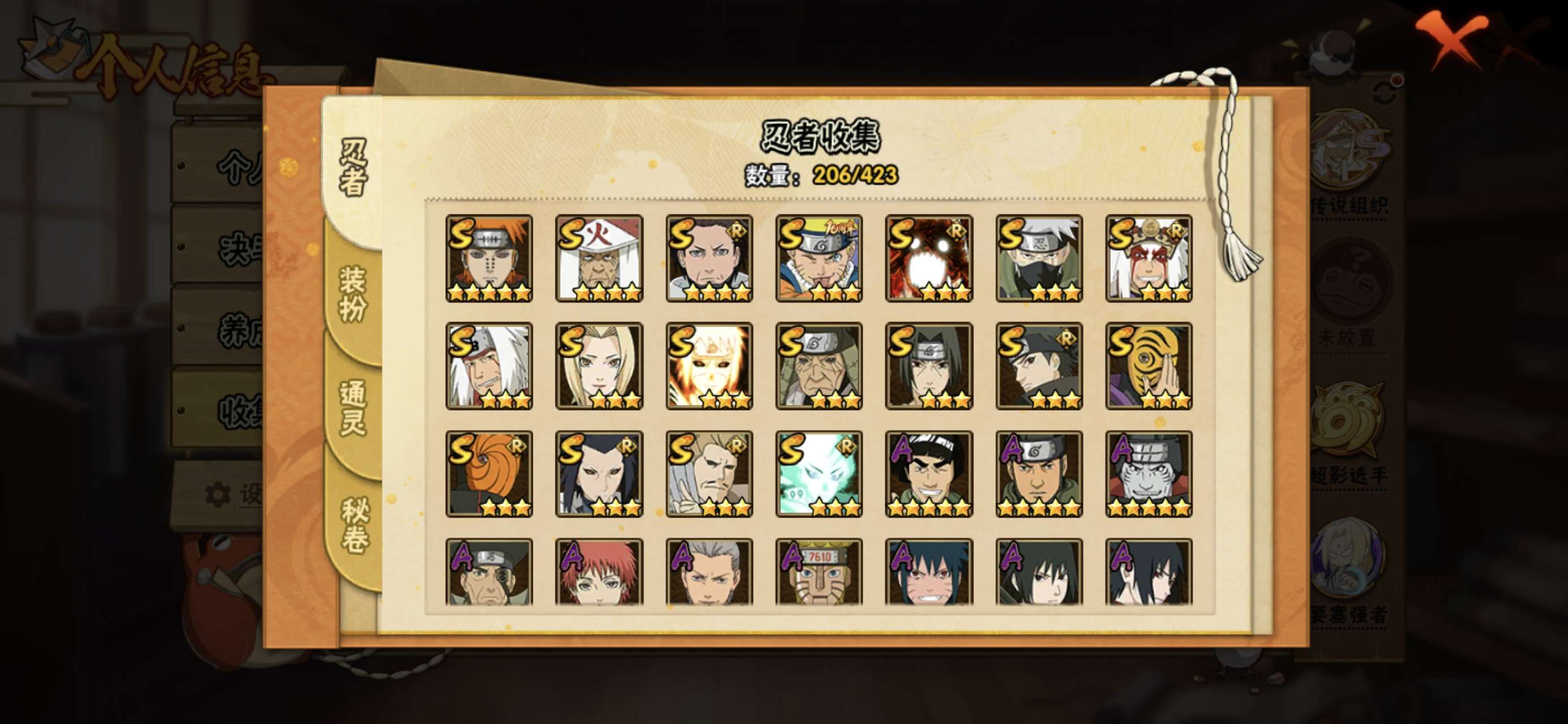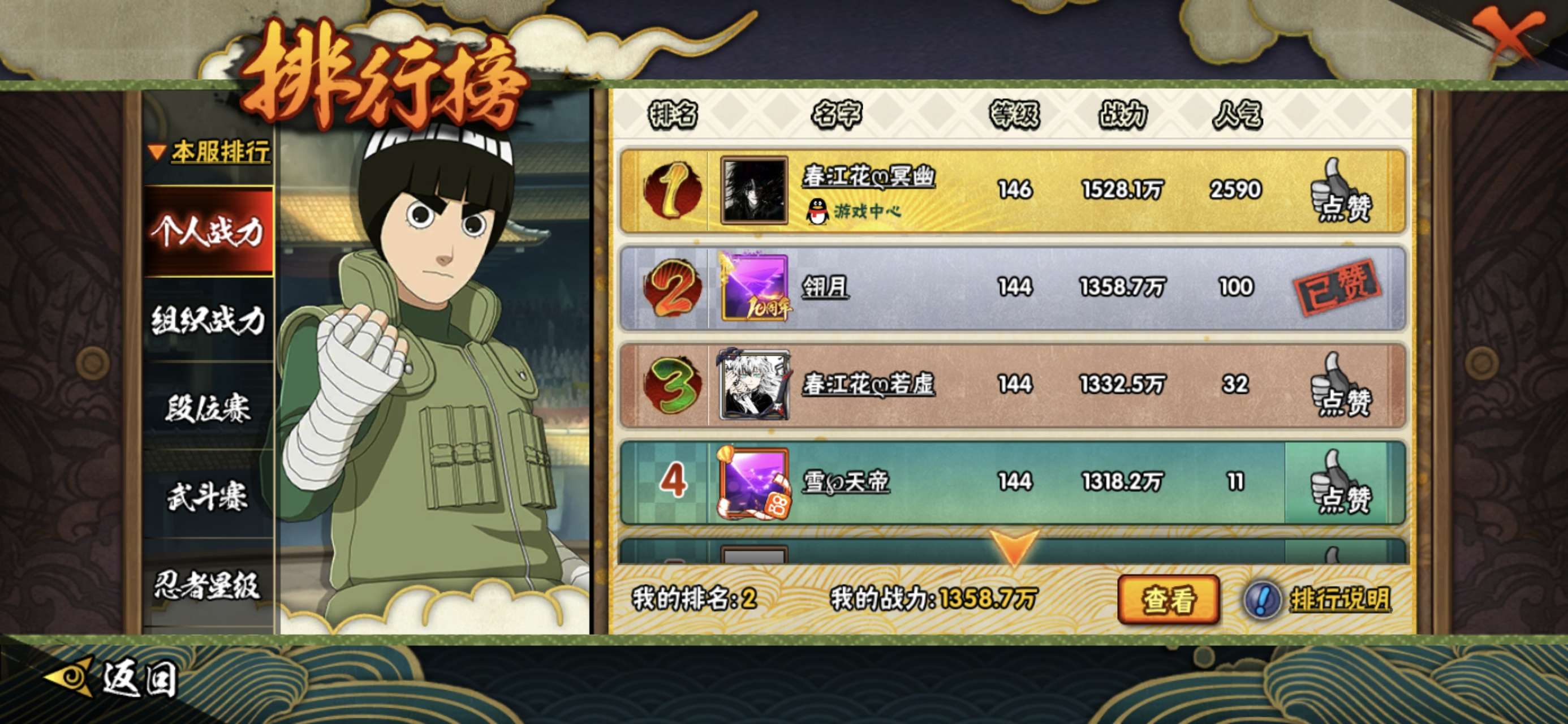 榜二,活柱间39片,仙人自来也89片,加月卡存的还有20000金币,S多198忍者多,98通灵多,已