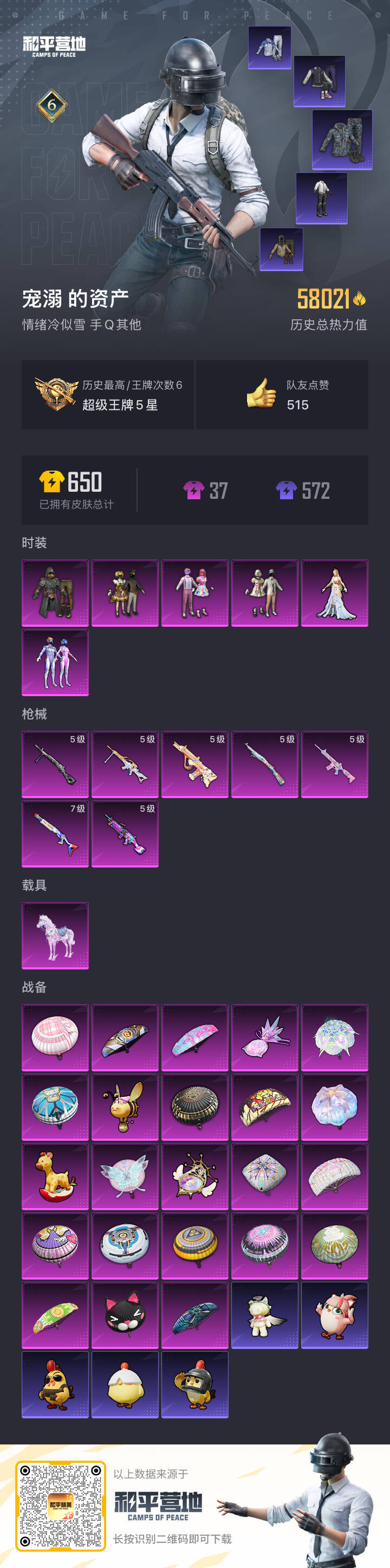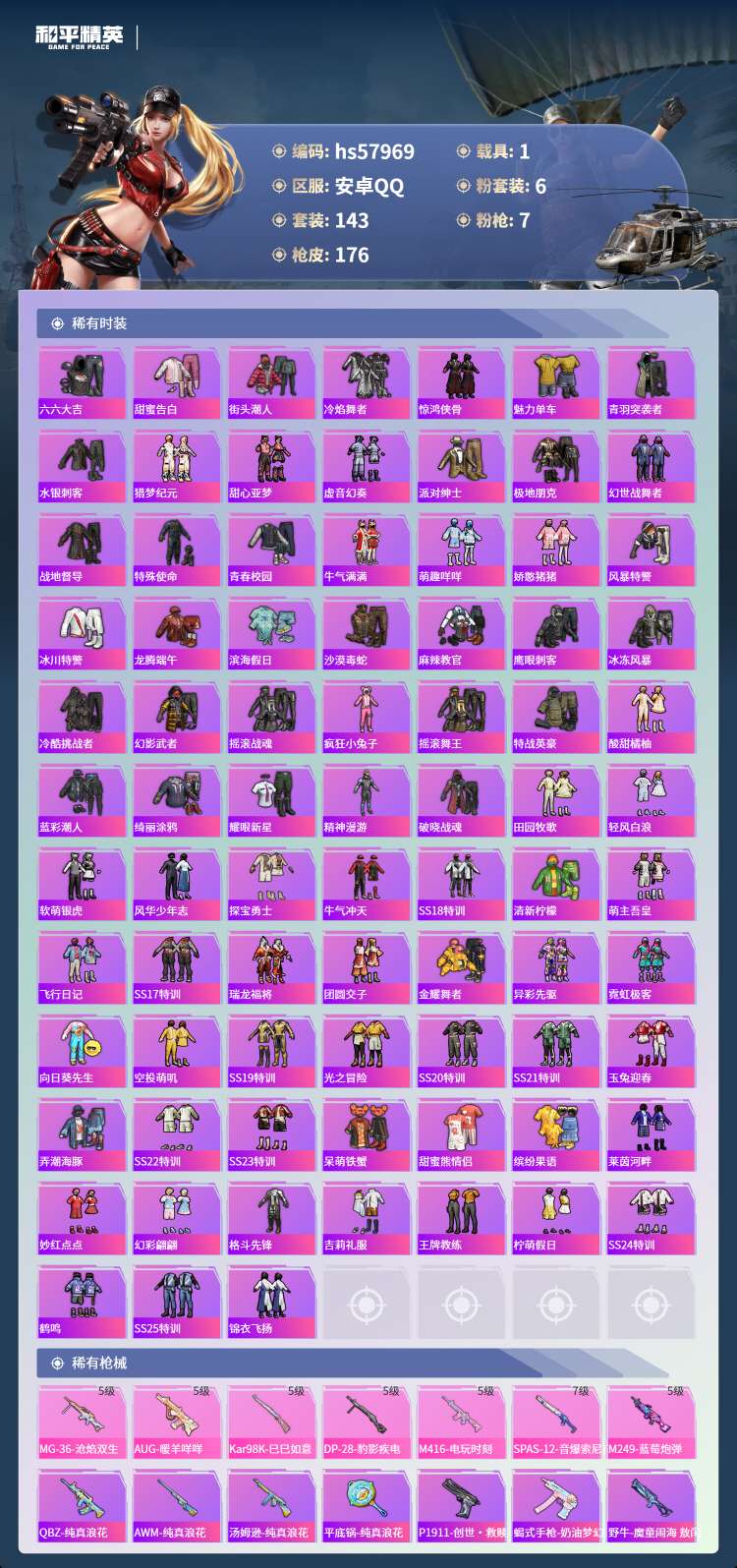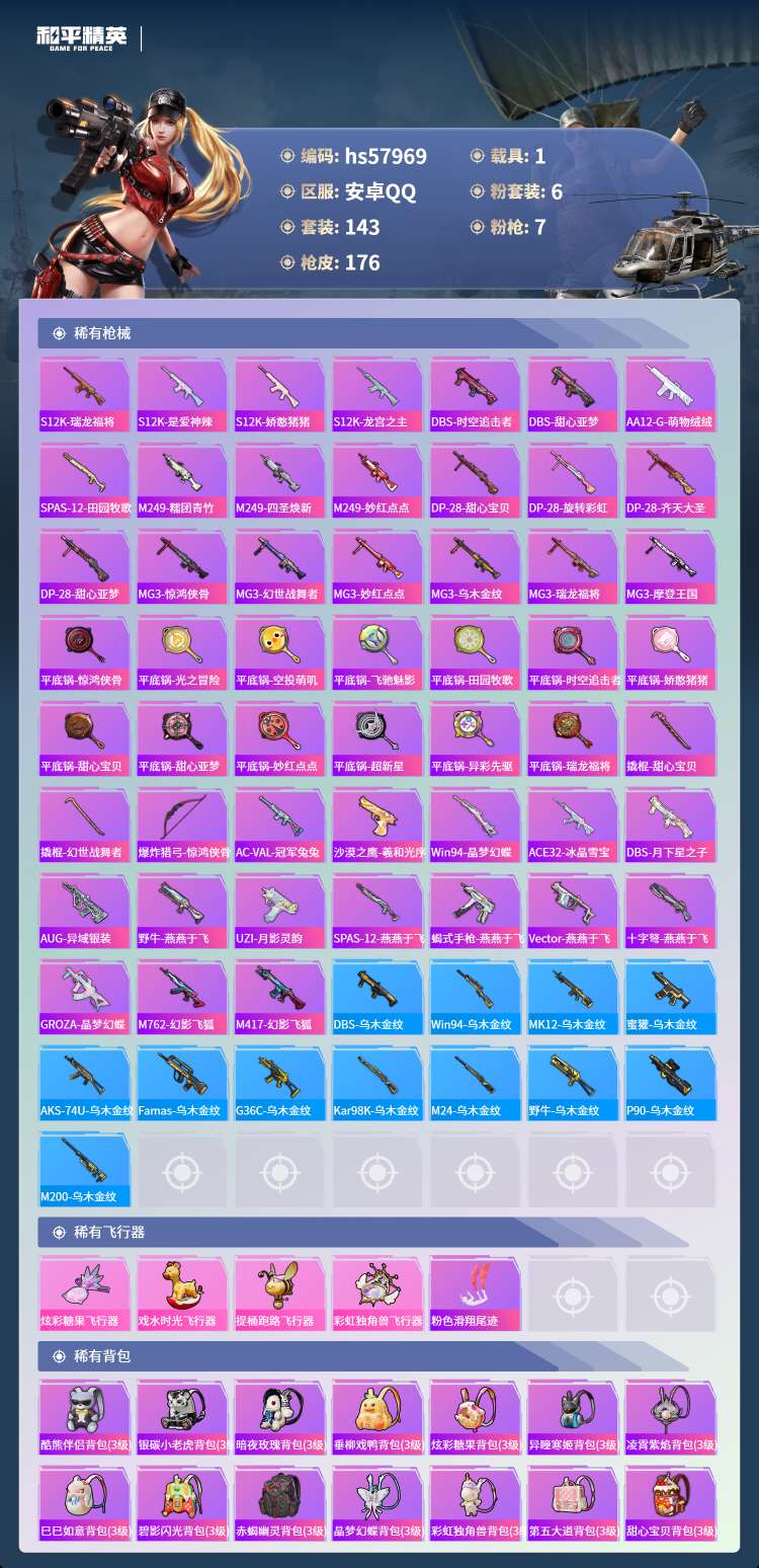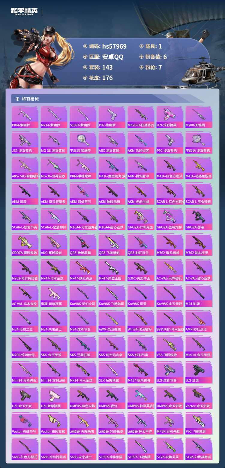 hs57969 安卓手Q-6王牌印记-6粉装-7特效枪-1载具-58021热力值-143套装-176