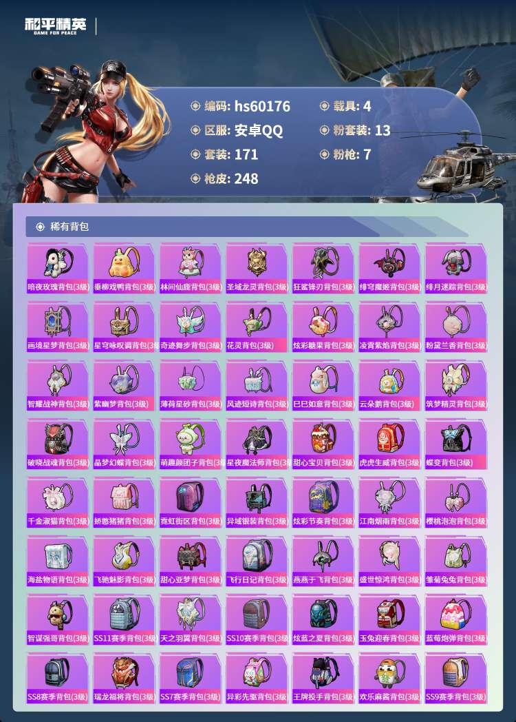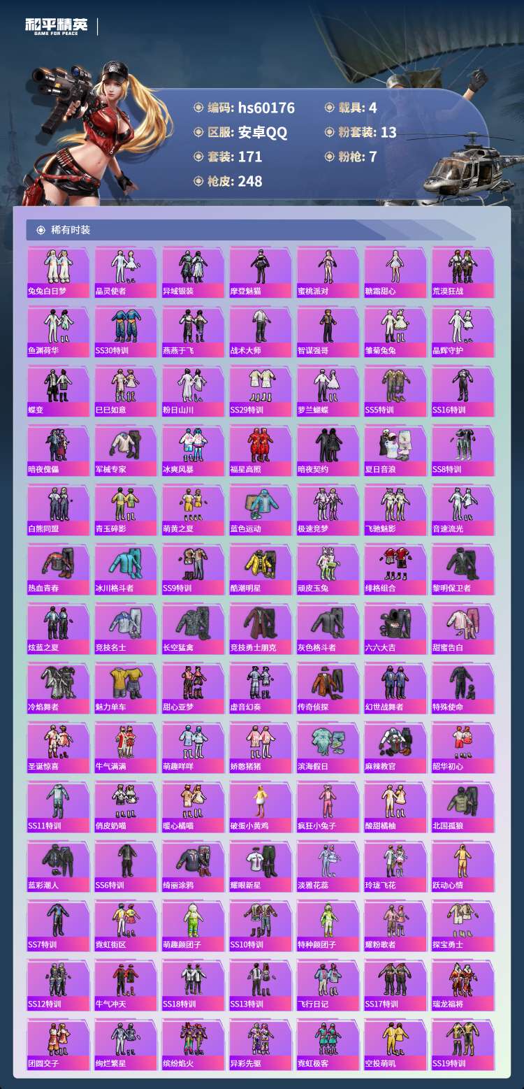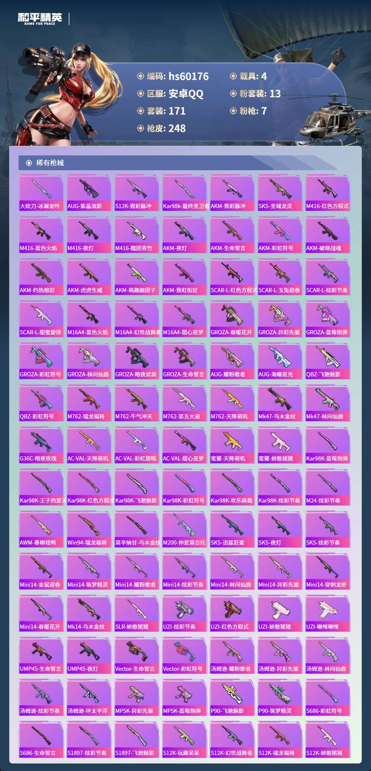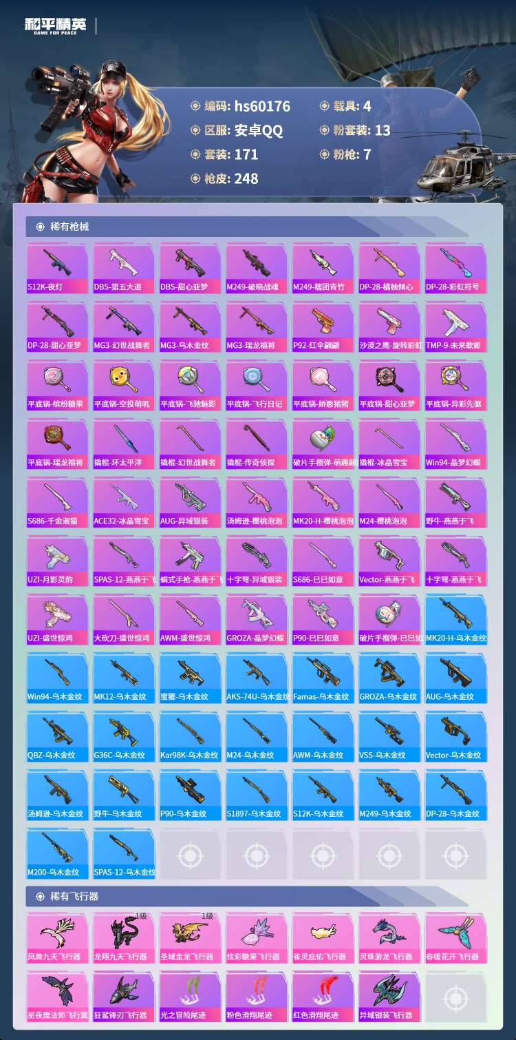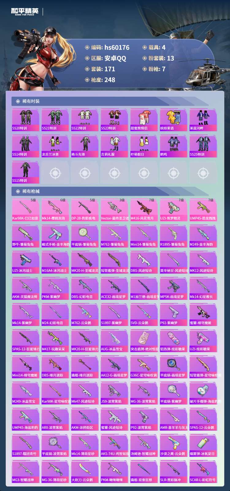 hs60176 安卓手Q-21王牌印记-13粉装-7特效枪-4载具-89588热力值-171套装-2