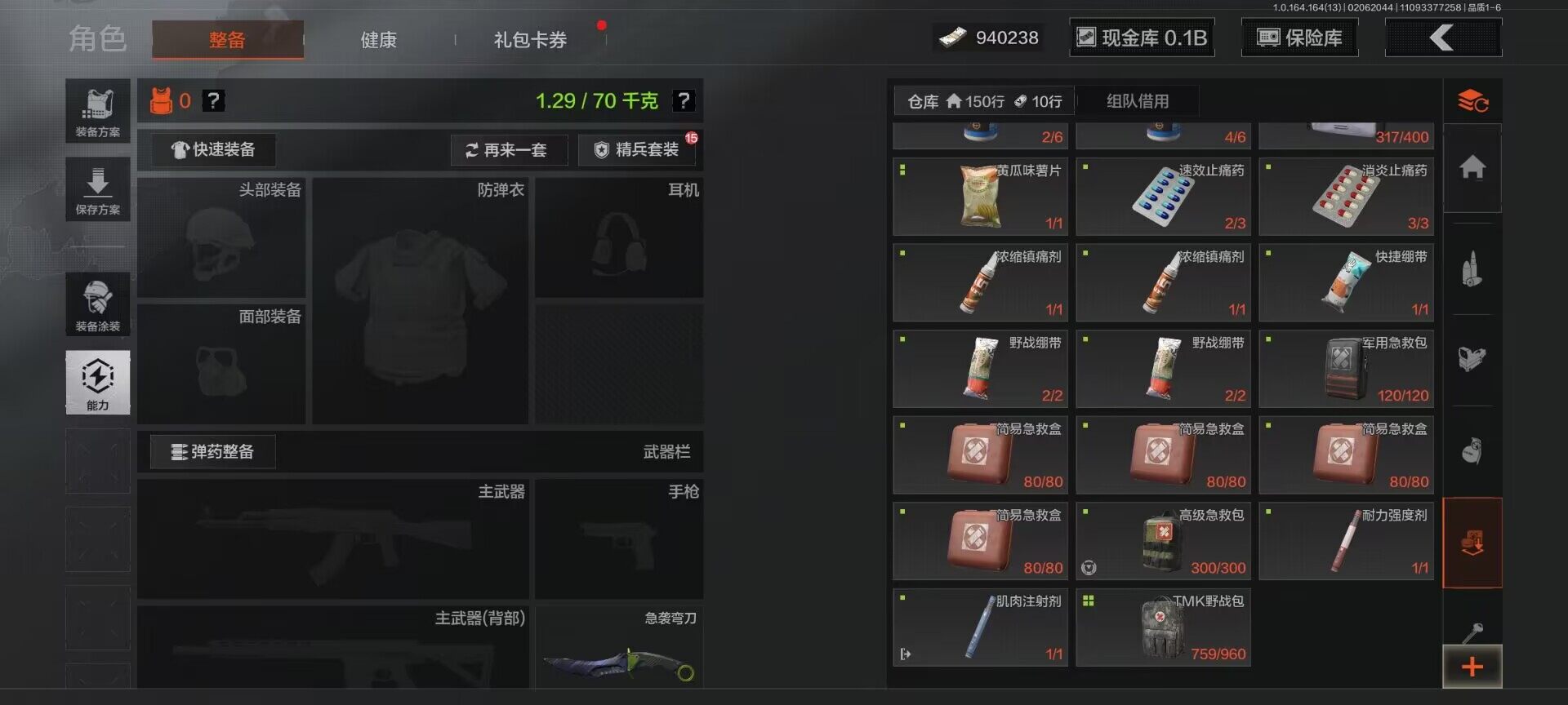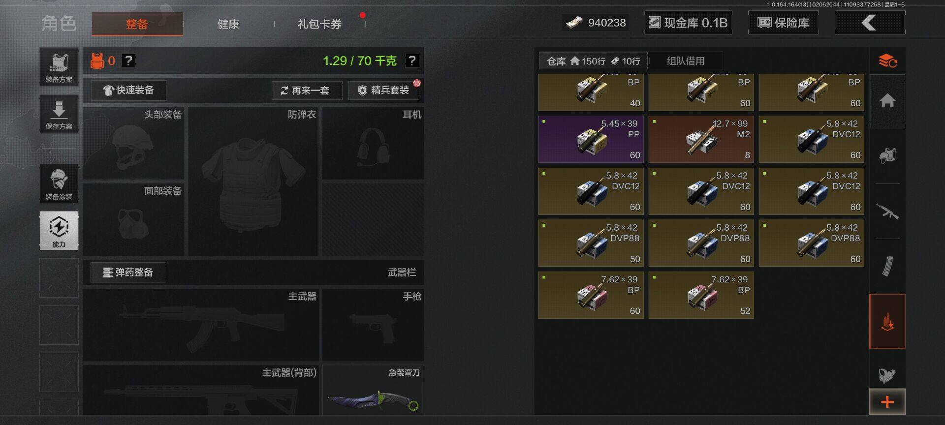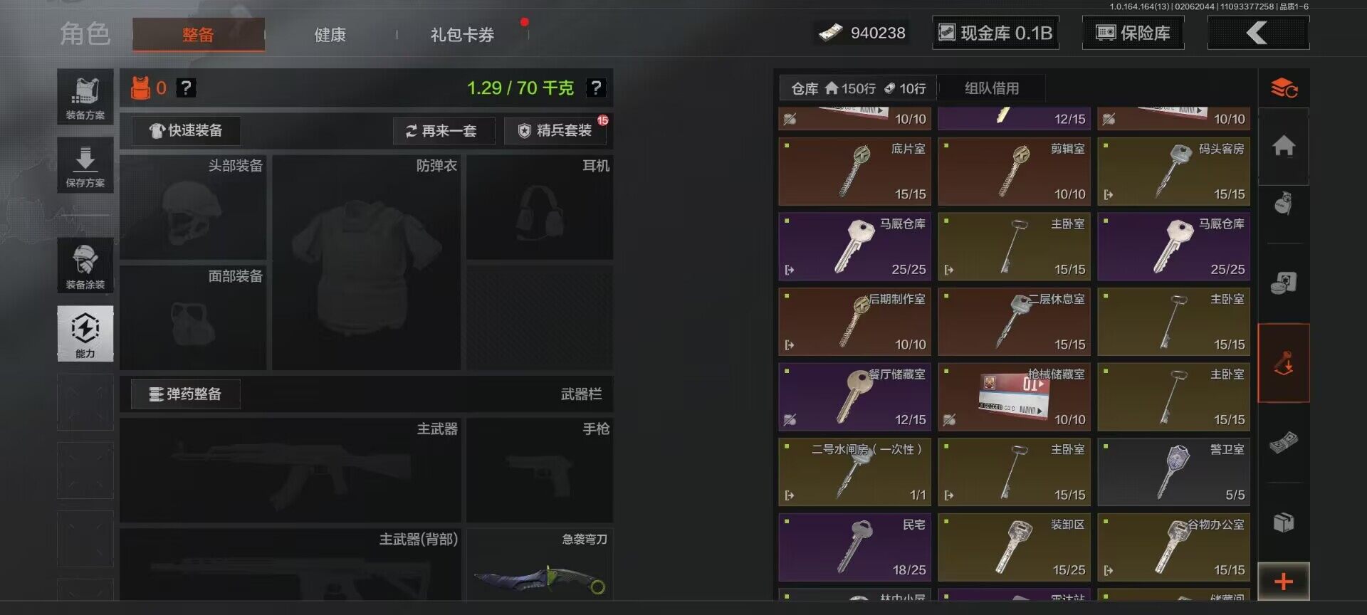 仓库价值(百万):180.9/柯恩币:940238000/工兵铲/来战开山刀/急袭弯刀