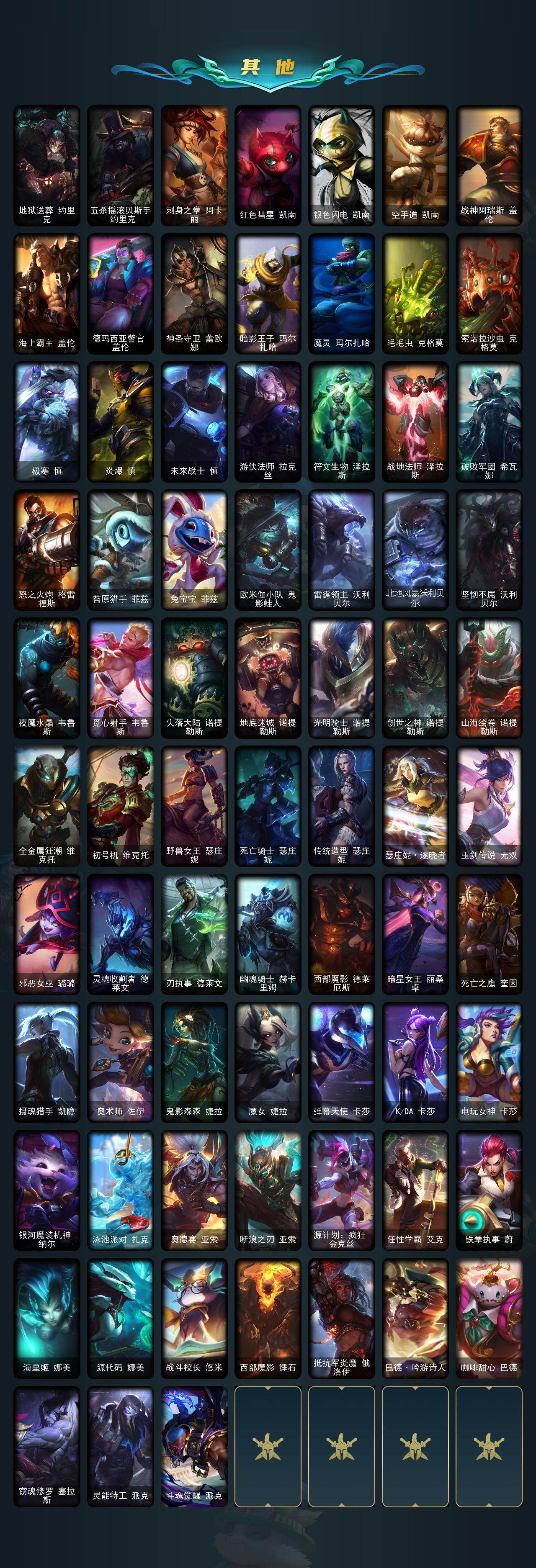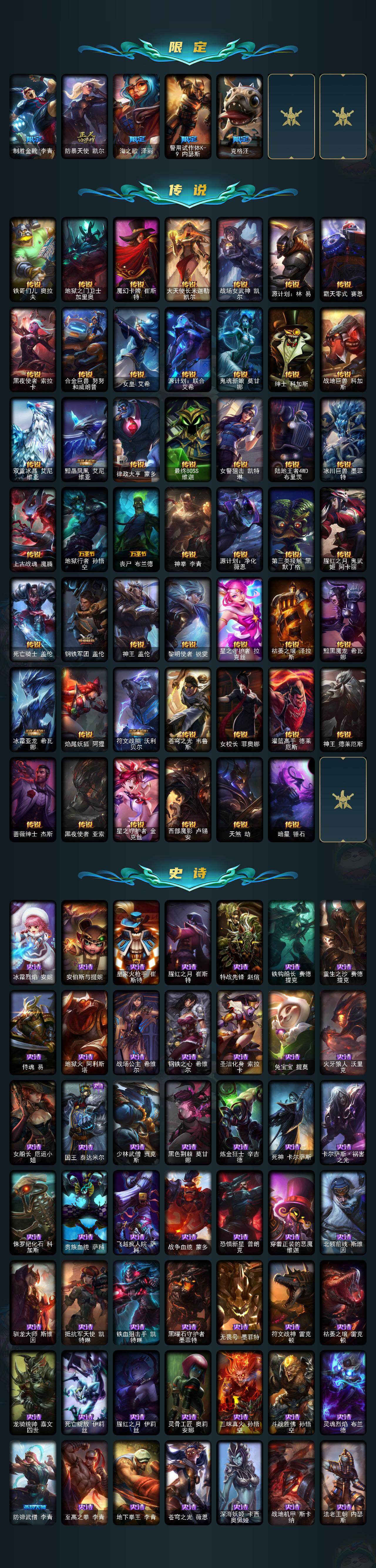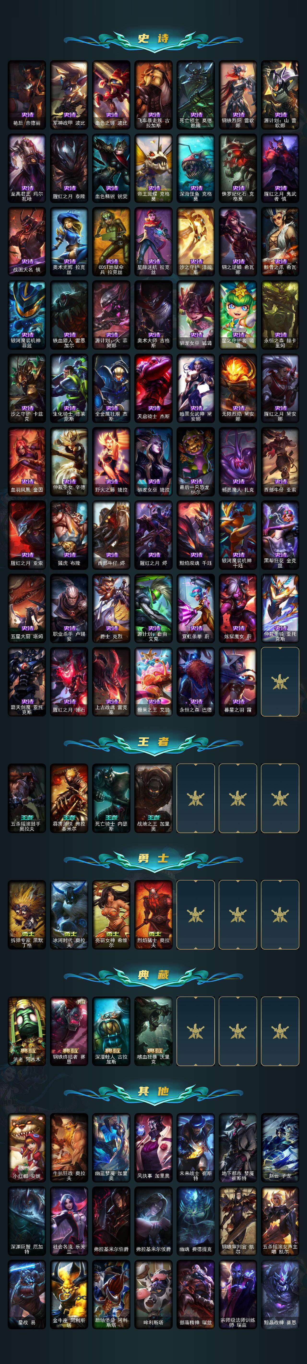 172英雄/446皮肤/1终极/6神话/69限定/11臻彩/18炫彩/48传说/111史诗