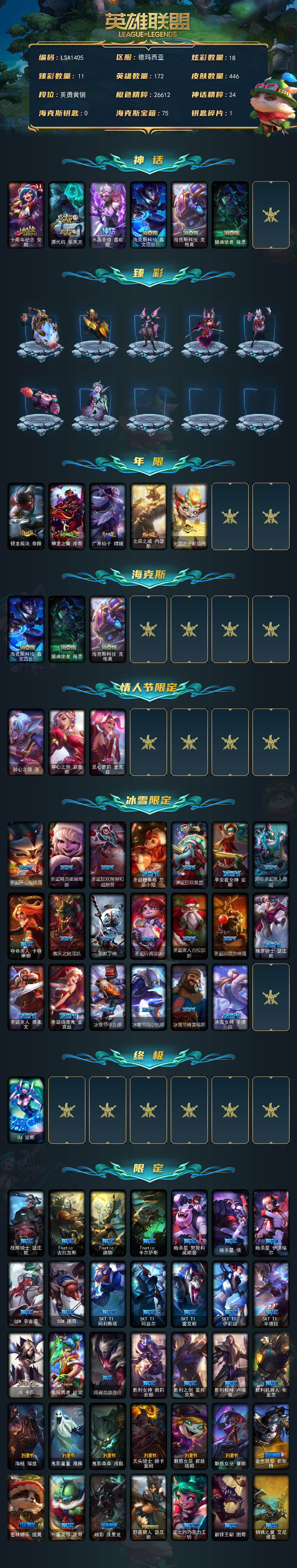 【LSA1405】172英雄/446皮肤/1终极/6神话/69限定/11臻彩/18炫彩/48传说/111史诗/青铜账号等级:718/十周年纪念安妮/源代码乐芙兰/水晶圣骑蕾欧娜/海克斯科技嘉文四世/海克斯科技克格莫/摄魂使者薇恩/天龙之子卡莎飞龙乘云/无畏骑士瑟庄妮赤子初心/墨之影武者亚索金墨耀影/征服者韦鲁斯炫金/弹幕天使卡莎炽天使勇敢/幻灵战斗蝠薇恩梦幻强袭/星之吞噬者莫甘娜热情之末/星之守护者卡莎热情之光/可爱可爱粉红红布里茨/魔女阿卡丽虚荣/净雪之月莫甘娜冬虹/银龙裁决泰隆/神龙之翼库奇