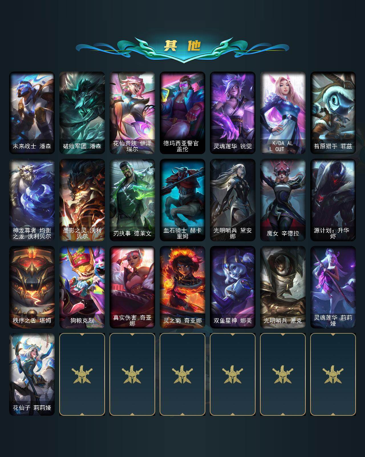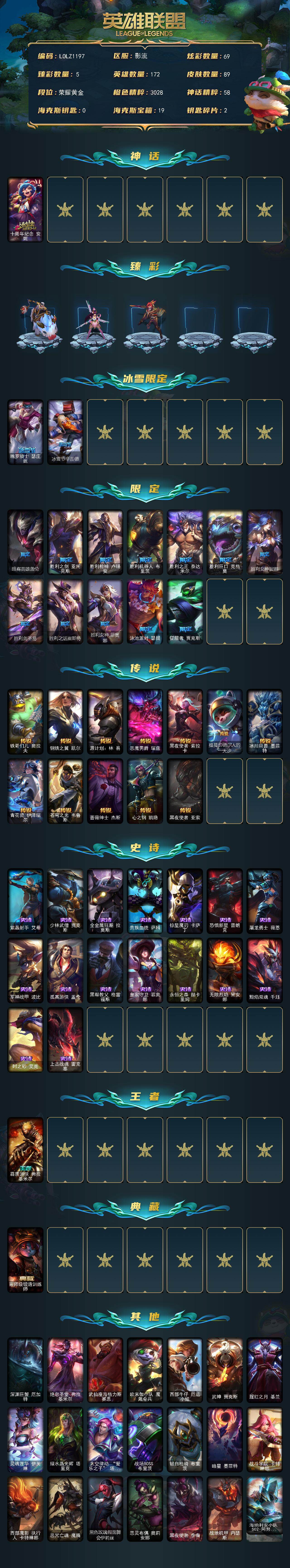 【LOLZ1197】172英雄/89皮肤/1神话/15限定/5臻彩/69炫彩/12传说/16史诗/黄金/十周年纪念安妮/无畏骑士瑟庄妮赤子初心/玉剑传说舞剑仙承影/黎明使者锐雯黑夜使者/星之守护者阿卡丽热情之光/霸天异形卡兹克黄金异端/魄罗骑士瑟庄妮/冰雪节辛吉德/暗裔英雄盖伦/胜利之剑亚托克斯/胜利枪神卢锡安/胜利机器人布里茨/胜利之王泰达米尔/胜利巨口克格莫/胜利女神娑娜/胜利剑圣易/胜利之运崔斯特/胜利女神菲奥娜/泳池派对瑟提/征服者贾克斯/铁哥们儿奥拉夫/钢铁之翼凯尔/源计划林易/恶魔男