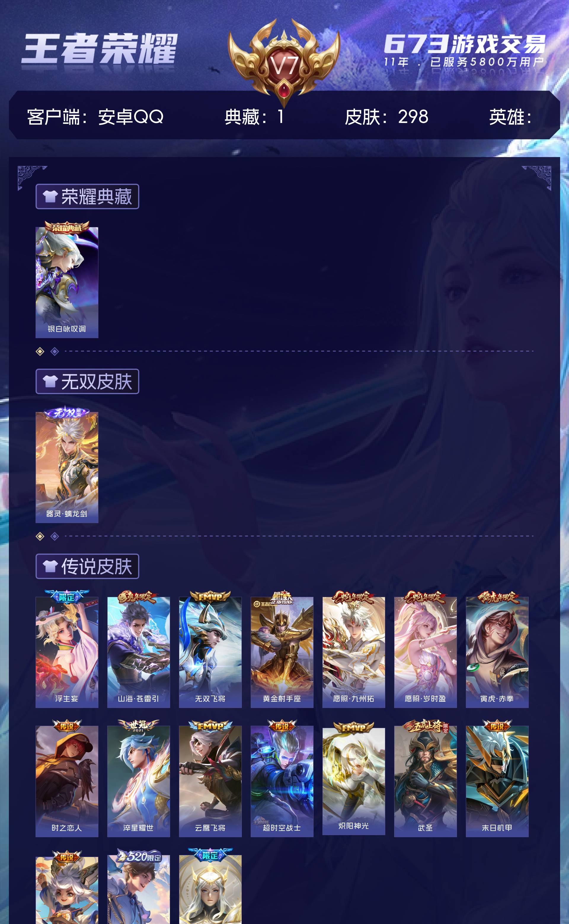 V7 皮肤298 最强王者 荣耀典藏1 无双皮肤1 传说18 其他皮肤281