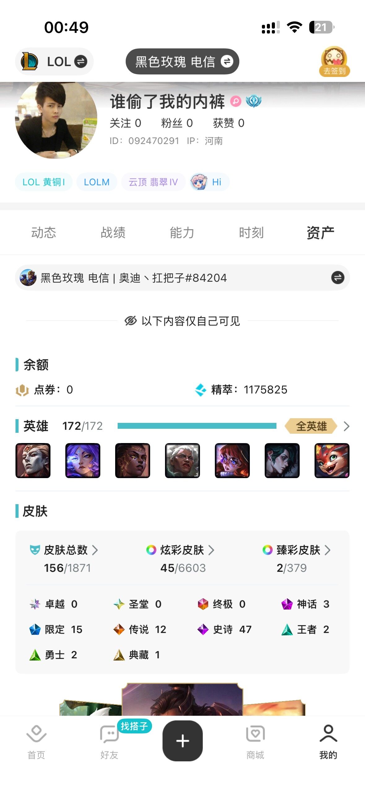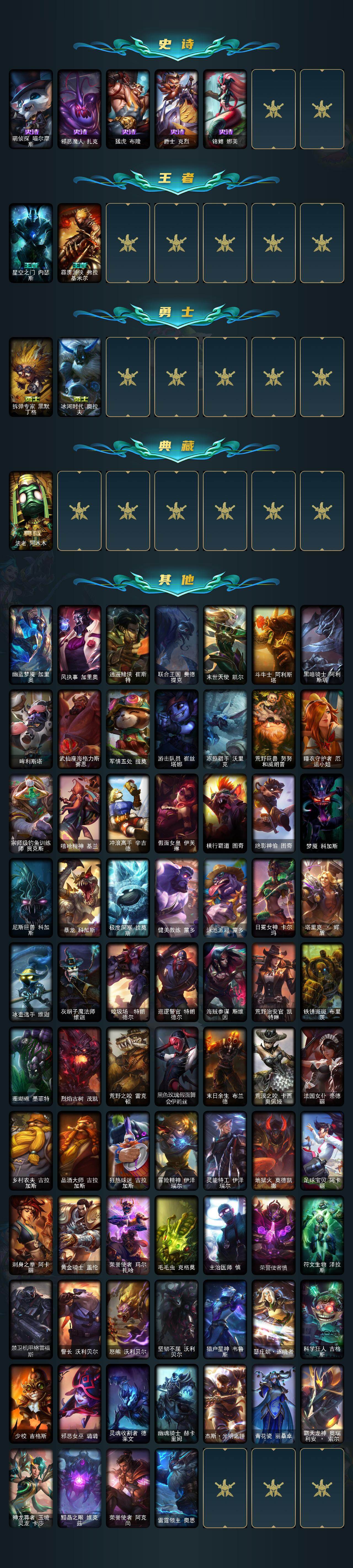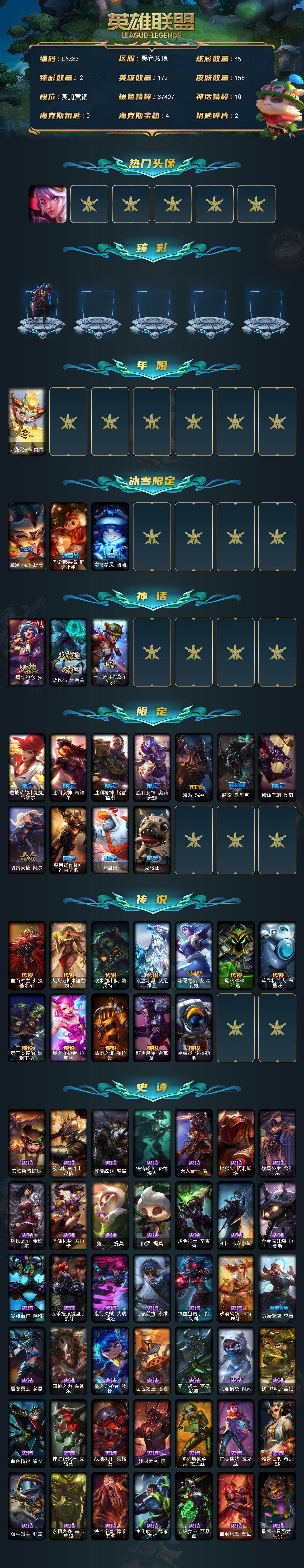 【特价出售/店主推荐】青铜段位-172英雄-156皮肤-45炫彩-0终极-3神话-15限定-12传说-47史诗
