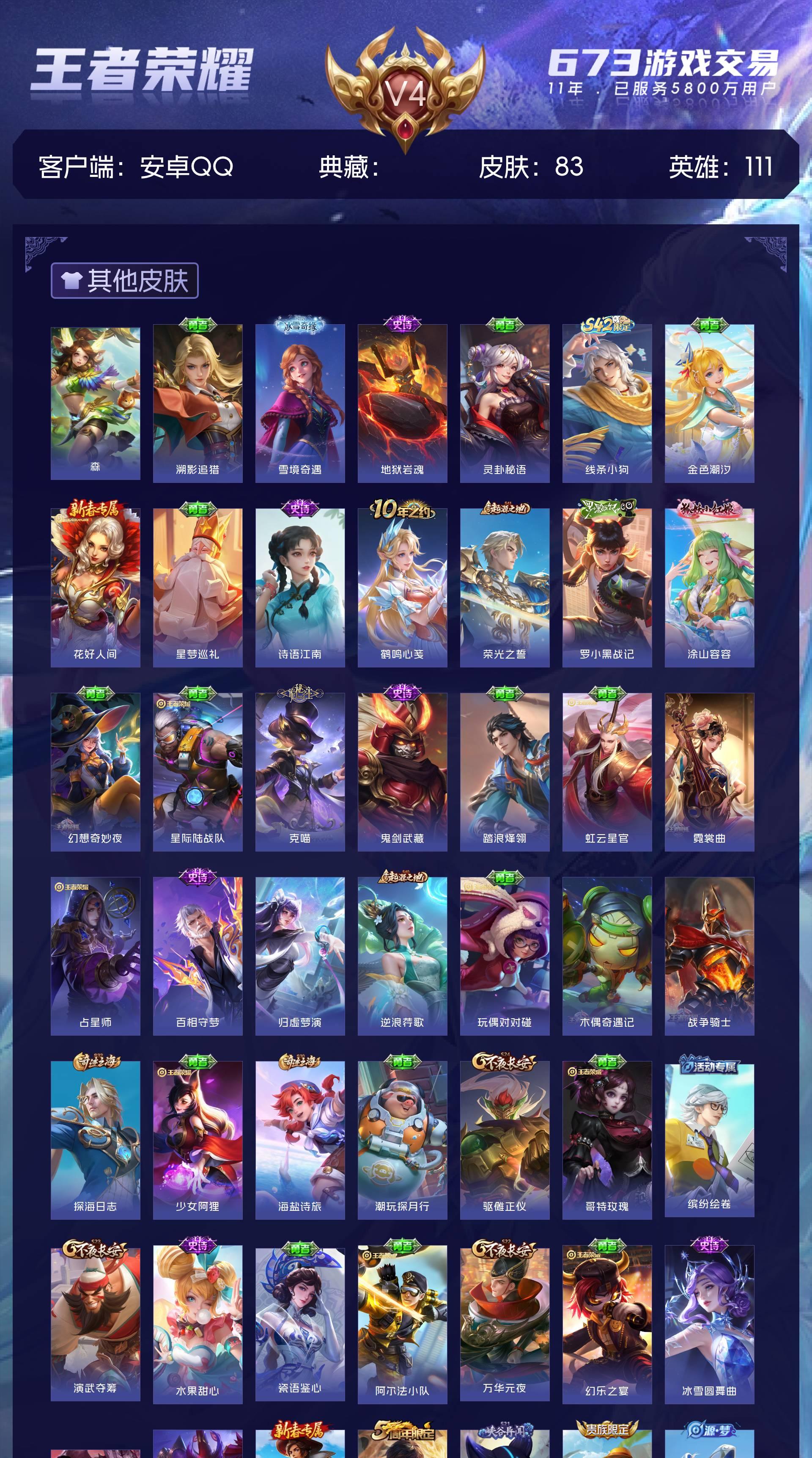V4 皮肤83 英雄111 至尊星耀 其他皮肤89