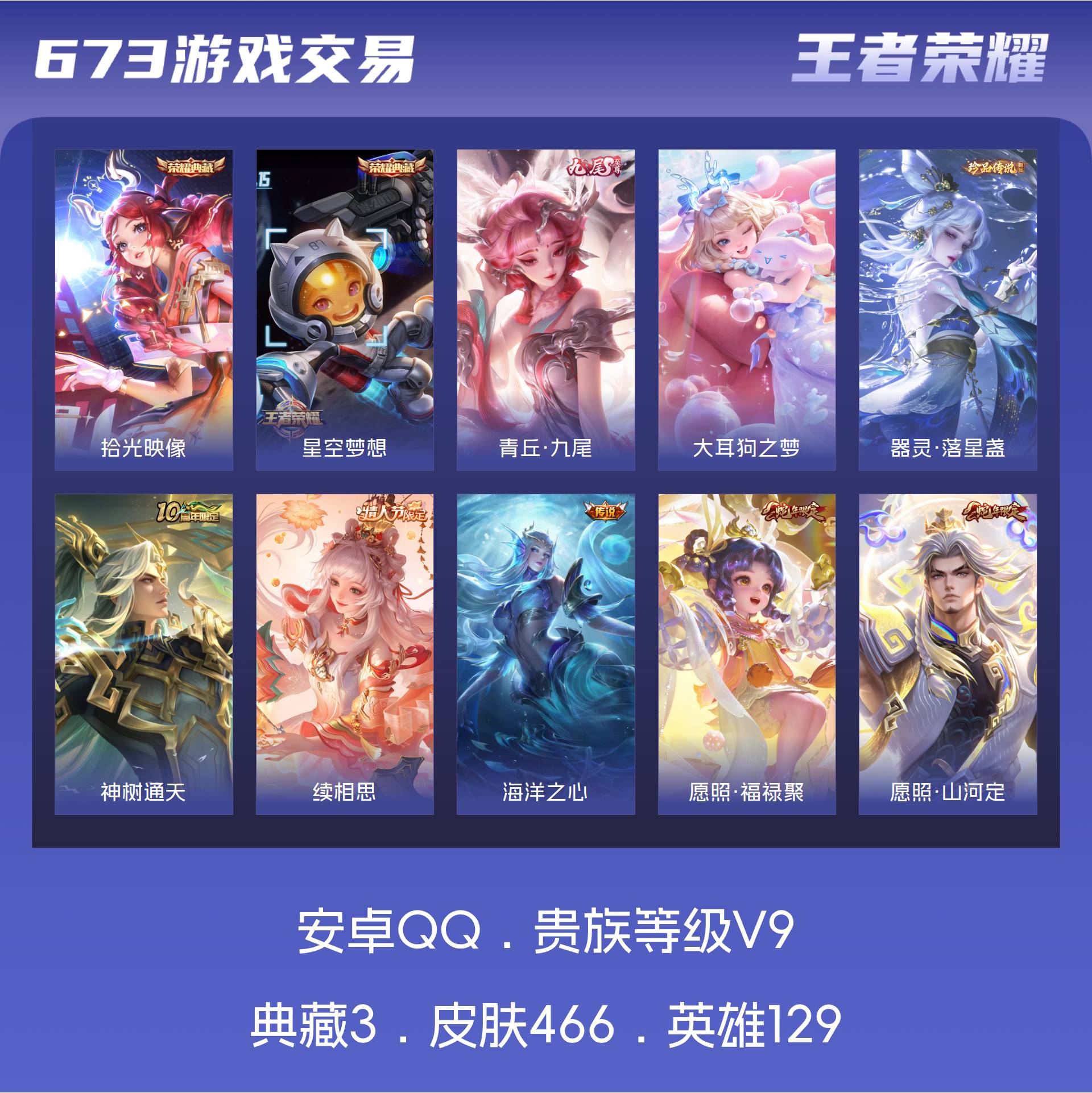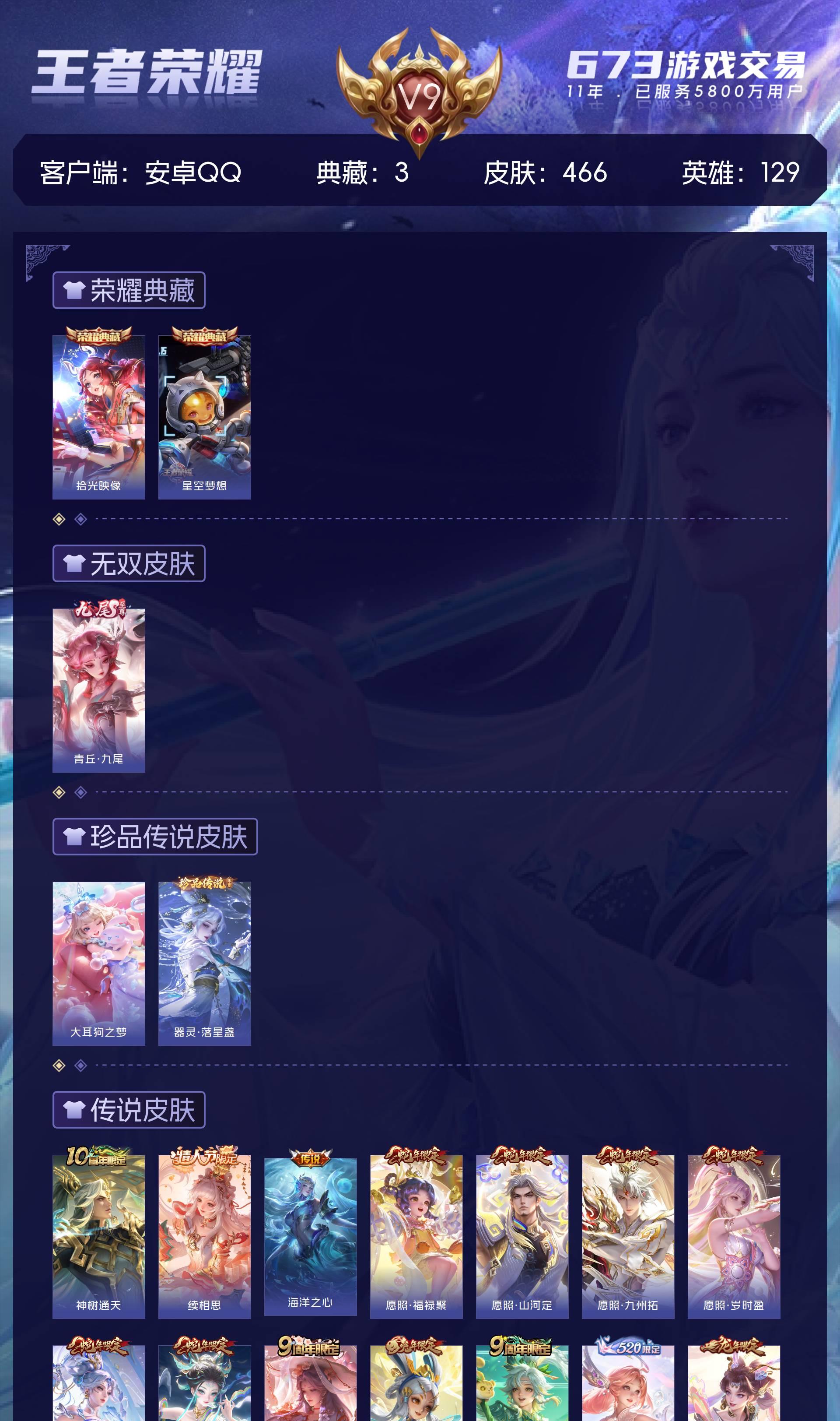 V9 皮肤466 英雄129 最强王者 荣耀典藏3 无双皮肤1 珍品传说2 传说35 其他皮肤429