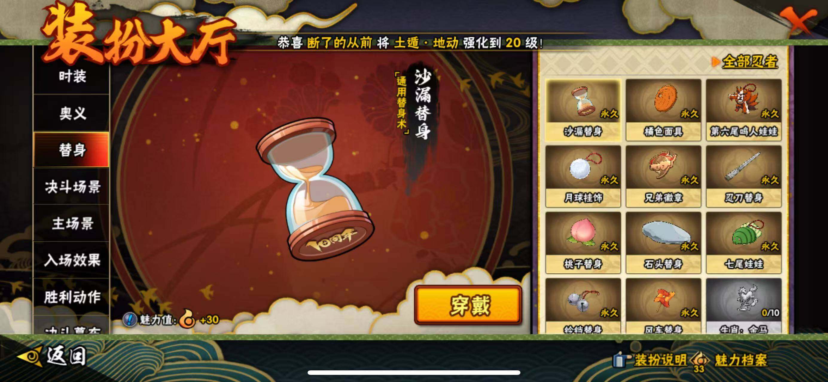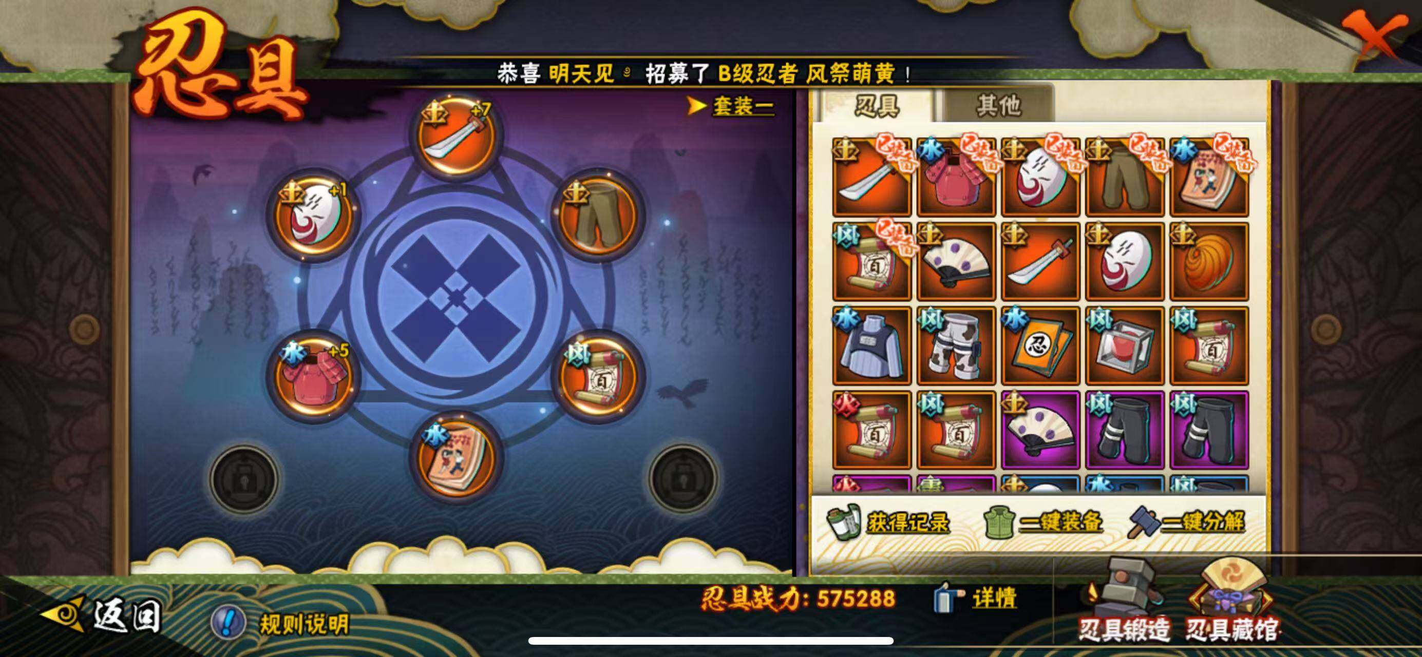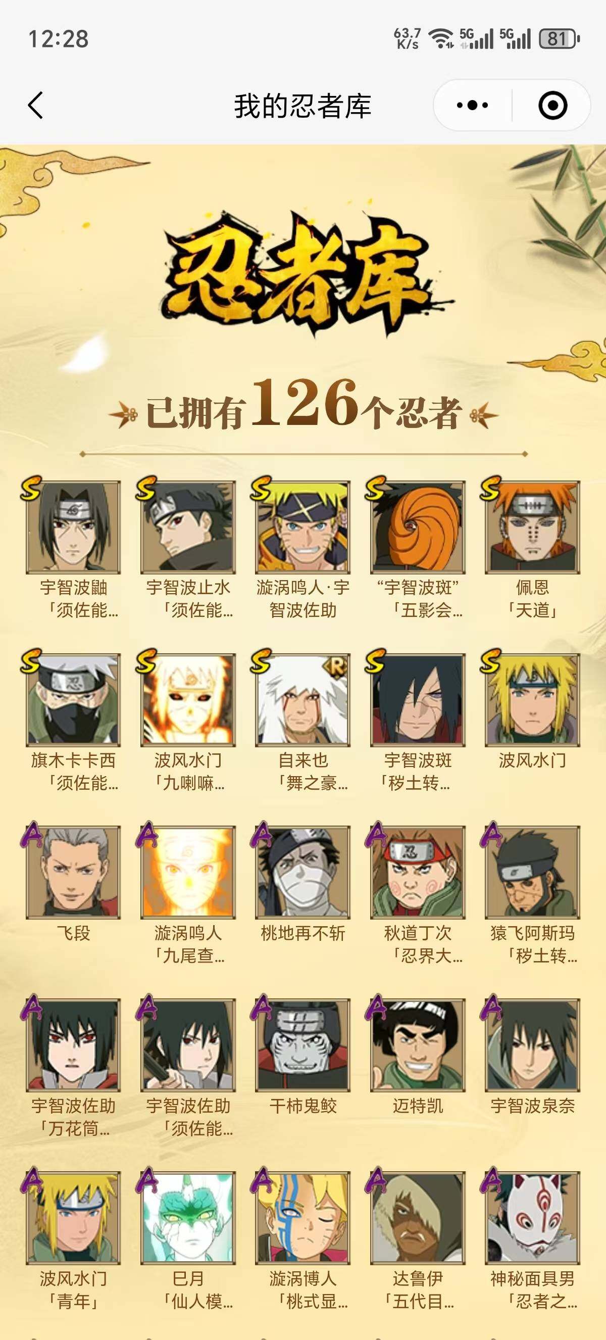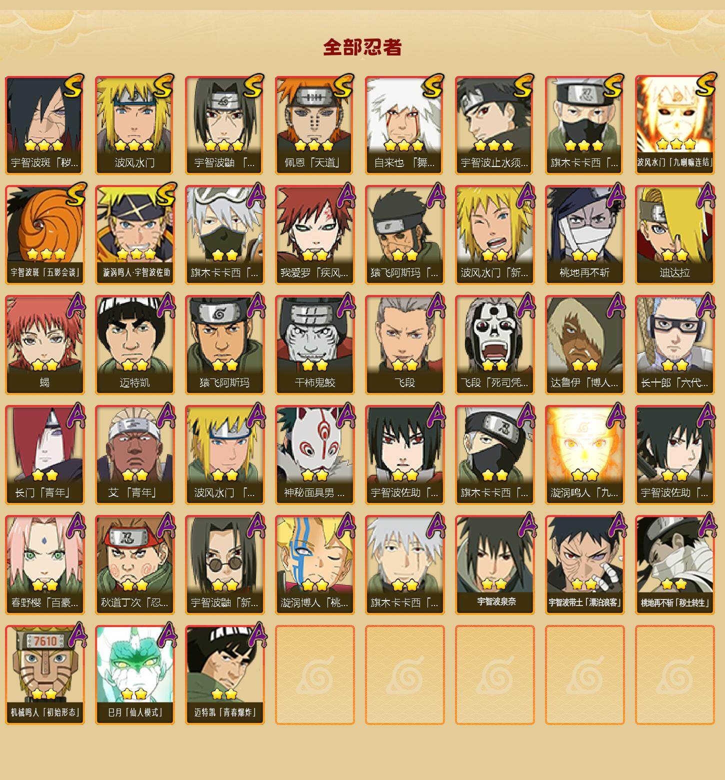 【S级忍者】:宇智波斑「秽土转生·解」(3星),宇智波鼬「须佐能乎」(3星),宇智波止水「须佐能乎」(3星),旗木卡卡西「须佐能乎」(3星),自来也「舞之豪杰」(3星),波风水门(3星),佩恩「天道」(3星),波风水门「九喇嘛连结」(3星),宇智波斑「五影会谈」(3星),漩涡鸣人·宇智波佐助(3星)