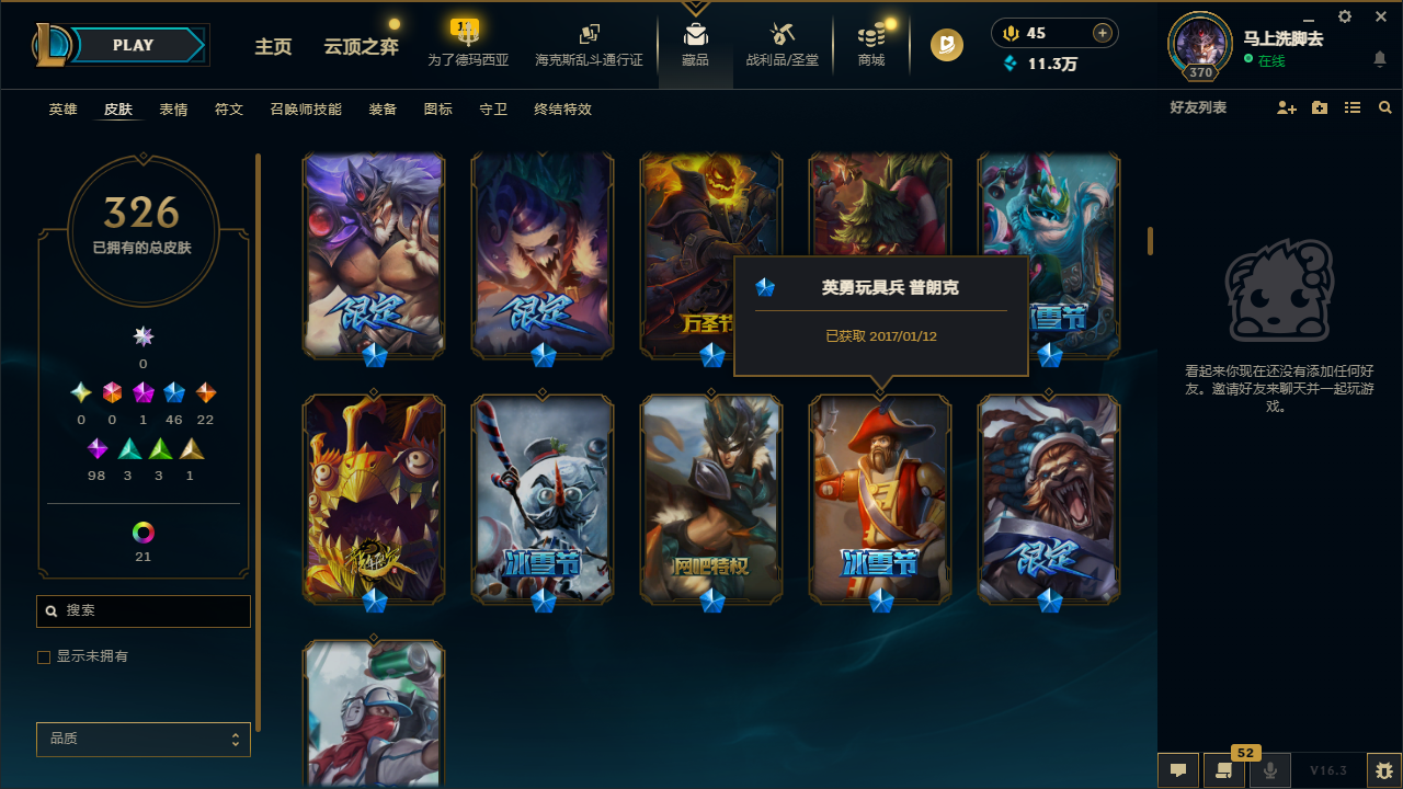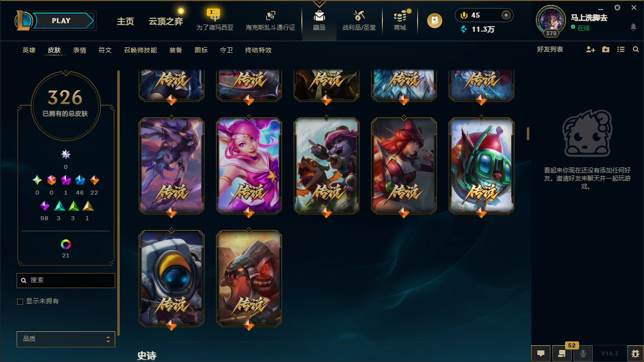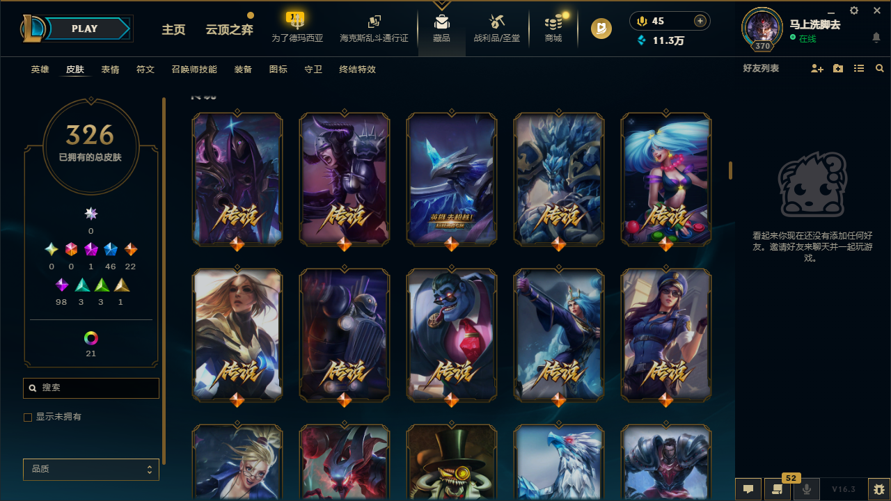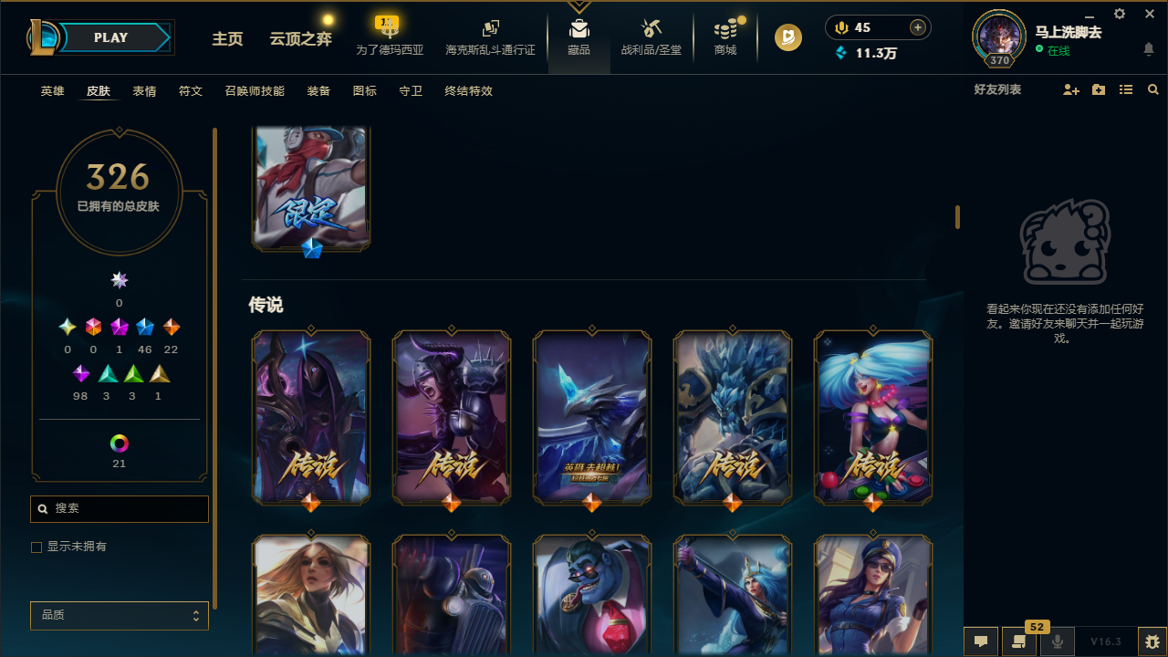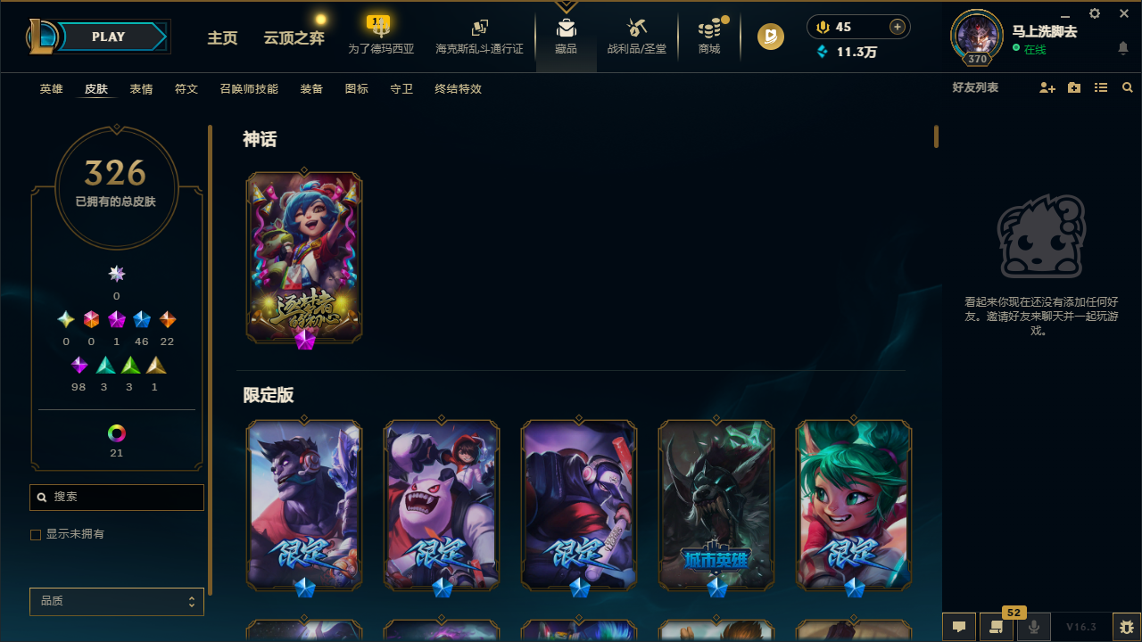 网通德玛西亚 326皮肤 段位:未定级 1神话 3王者 1典藏 22传说 37炫彩