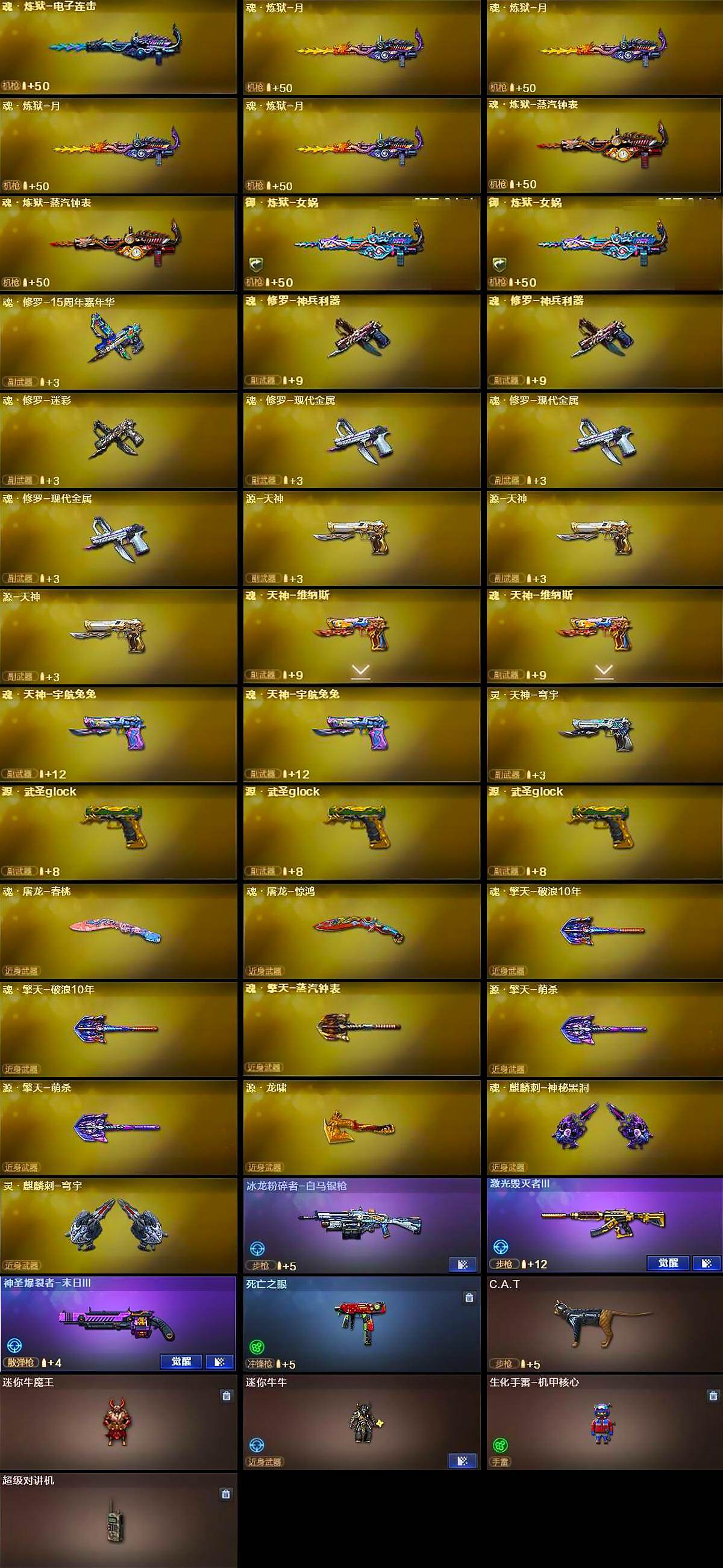 【热门武器】:QBZ03-金色蔷薇,HK417-朱雀,死亡之眼,C.A.T,M4A1-黑骑士*2,汤姆逊-烈龙*6,RPK-盘龙*4,加特林-炼狱*4,沙鹰-修罗*5