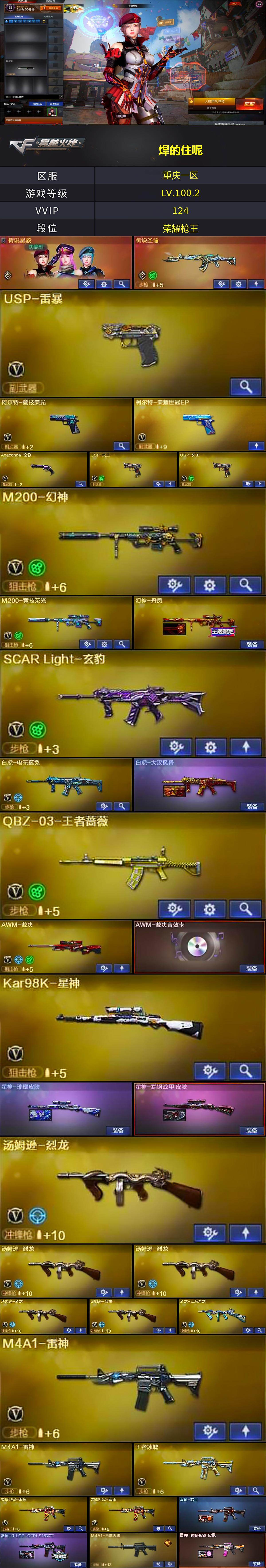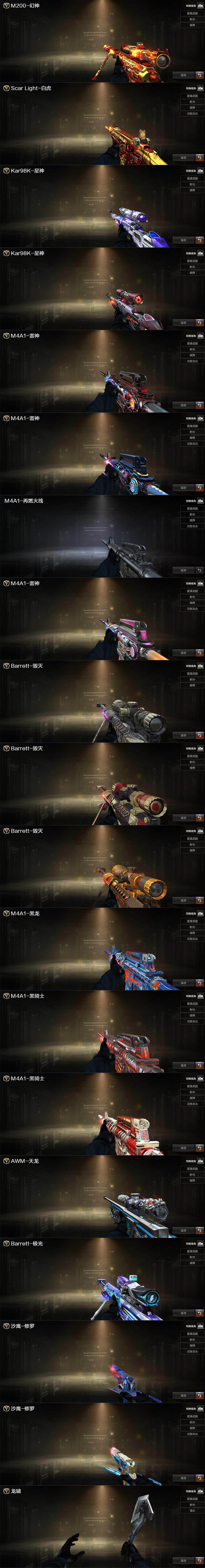 【热门武器】:传说圣谕,HK417-朱雀,M200-幻神,M200-竞技荣光,八面凌龙,死亡之眼,青龙之魄,荣耀世冠-火麒麟,荣耀世冠-雷神*2,白虎-电玩蓝兔,Kar98K-星神,Cat-刀锋,牛牛-AK47,M4A1-黑骑士*3,汤姆逊-烈龙*5,COP-白鲨,USP-雷暴,沙鹰-修罗*3,荣耀世冠-龙啸*