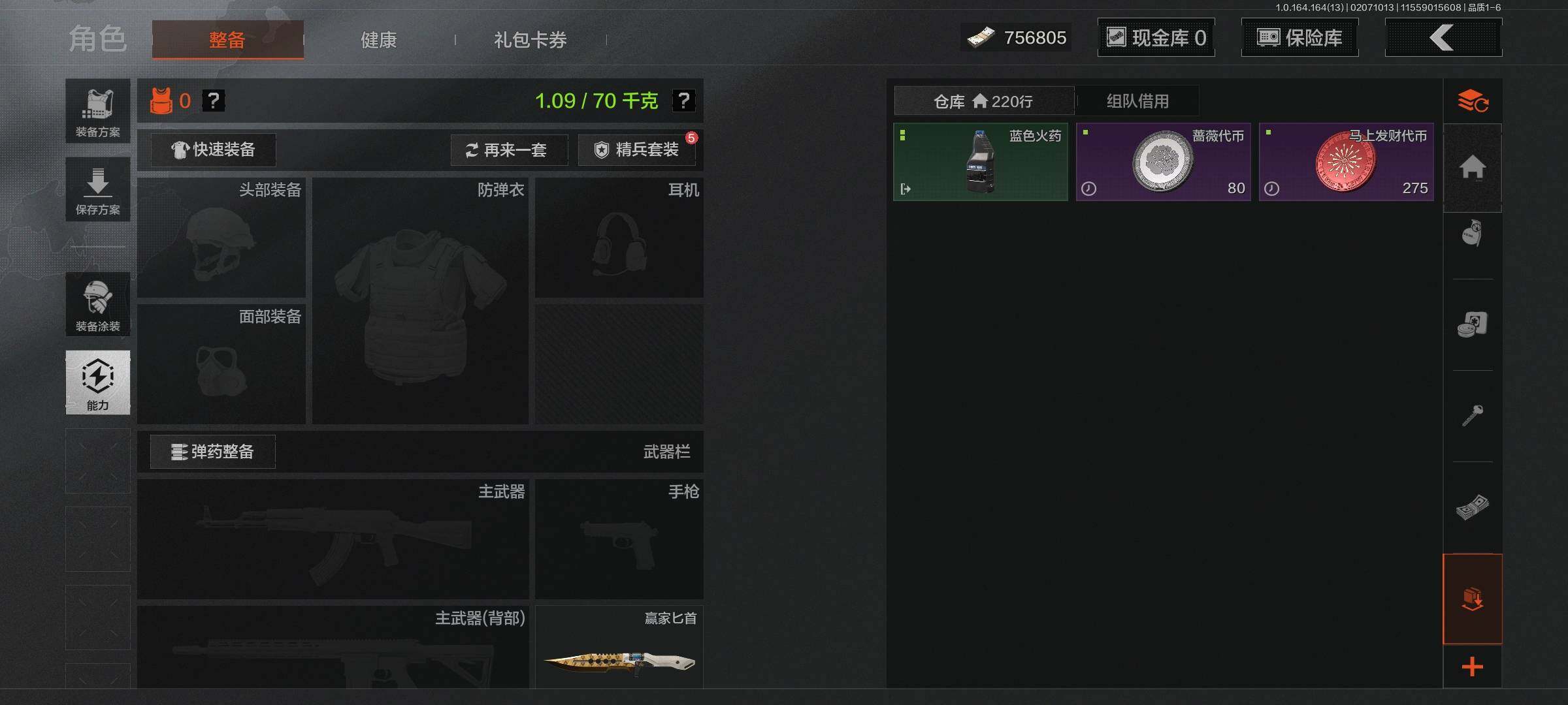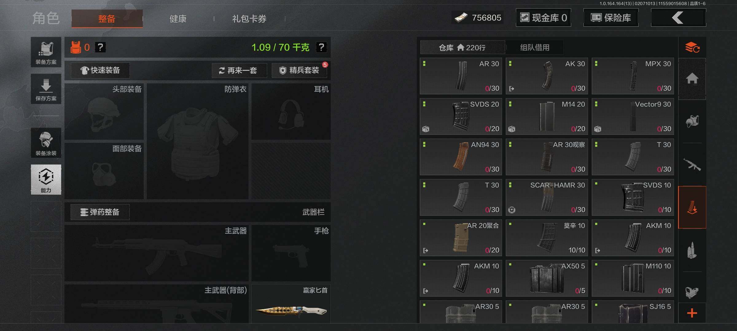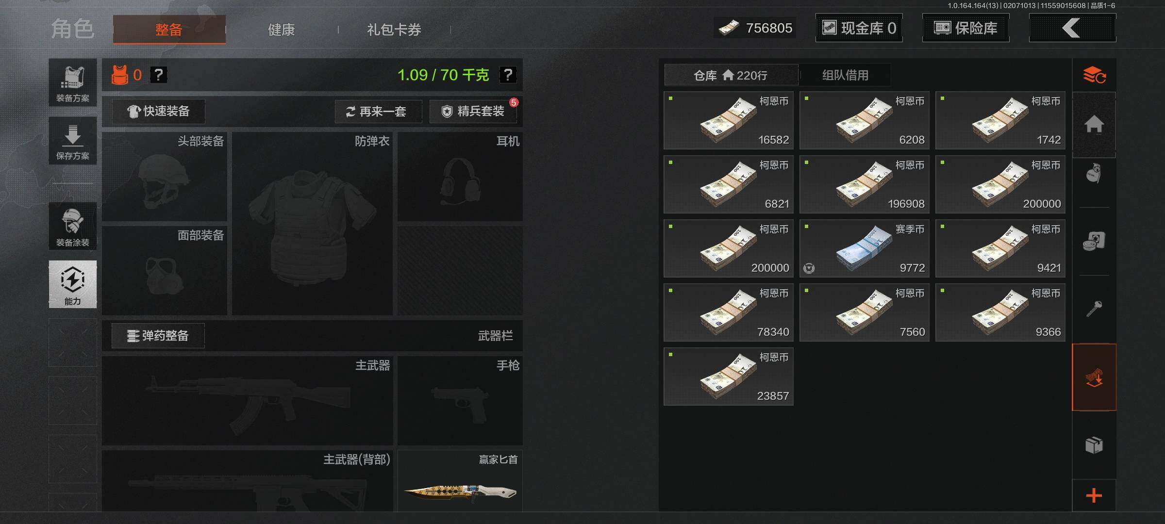 等级:30/段位:暗区传说/仓库价值(百万):1.6/柯恩币:756805/苍穹利爪/赢家匕首