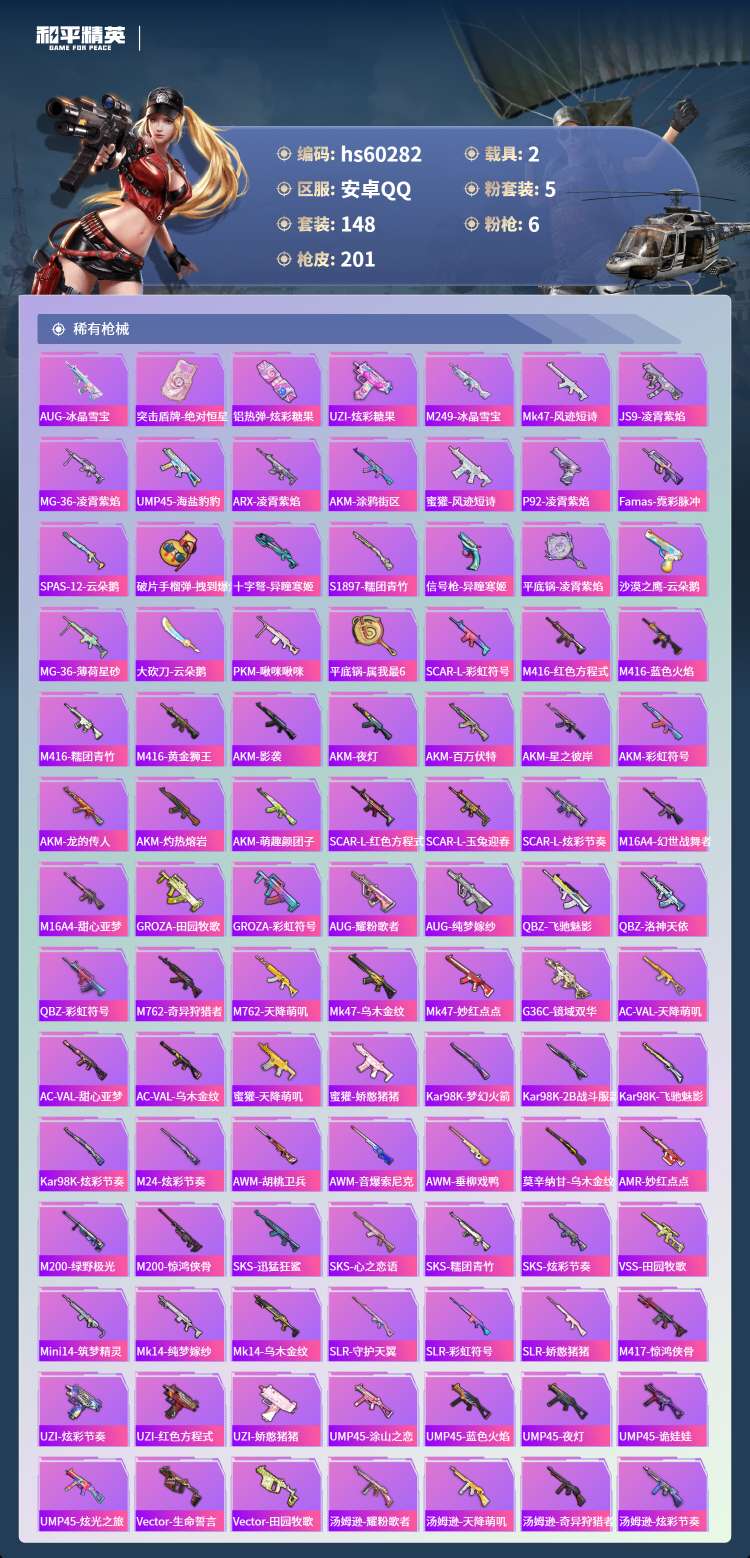 hs60282 安卓手Q-11王牌印记-5粉装-6特效枪-2载具-66421热力值-148套装-20