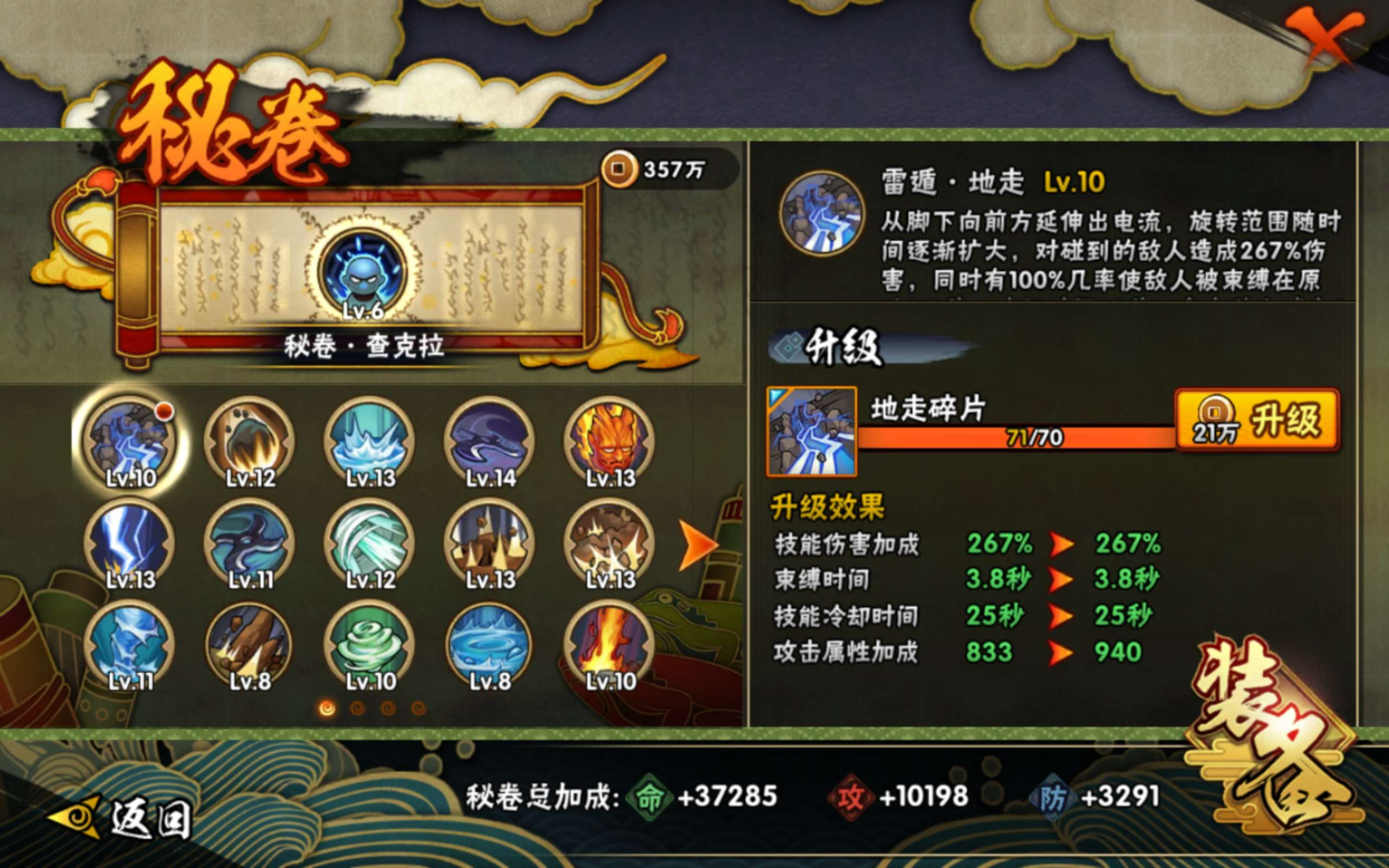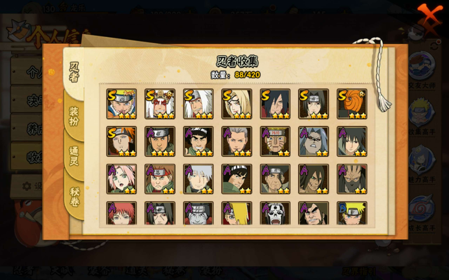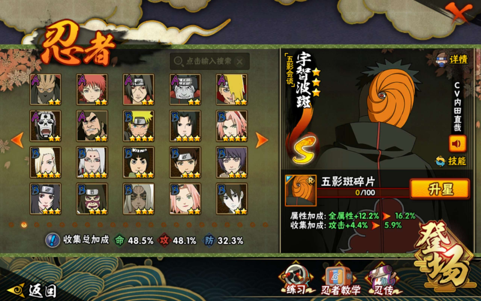 【S级忍者】自来也「传说中的三忍」(3星),宇智波斑「秽土转生·解」(3星),自来也「舞之豪杰」(3星),宇智波鼬「须佐能乎」(3星),佩恩「天道」(3星),纲手「百豪」(3星),
