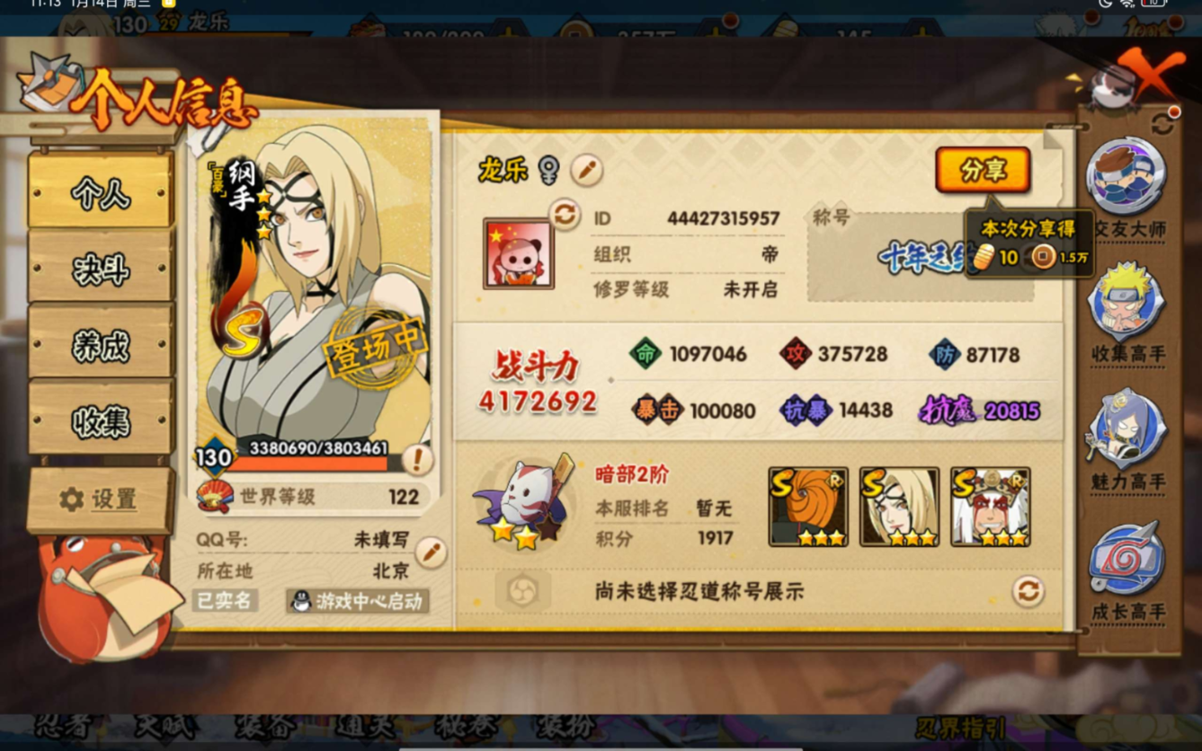 新手入坑免肝首选号-安卓QQ-可二次-S忍者数:8- A忍