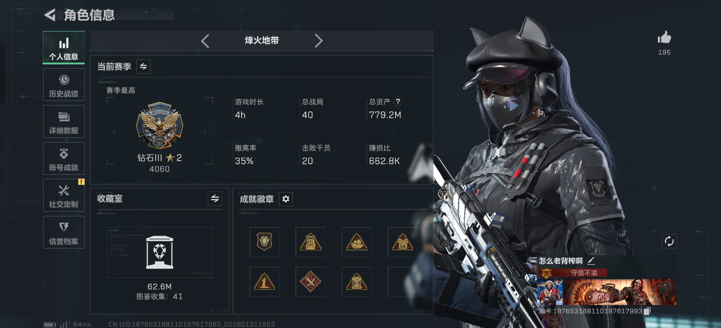 一个自己玩的号 全红皮 全刀差赤霄 吴彦祖 极品am7 极品c巨浪 特勤全满级 满仓满收藏 满体满负